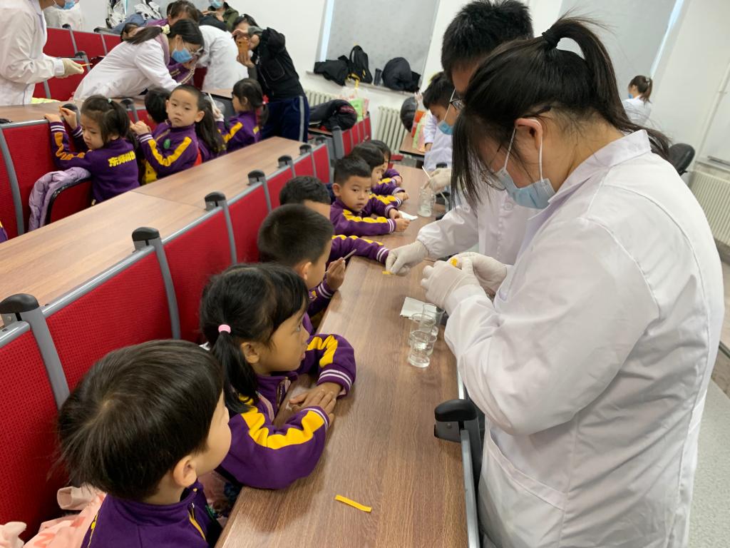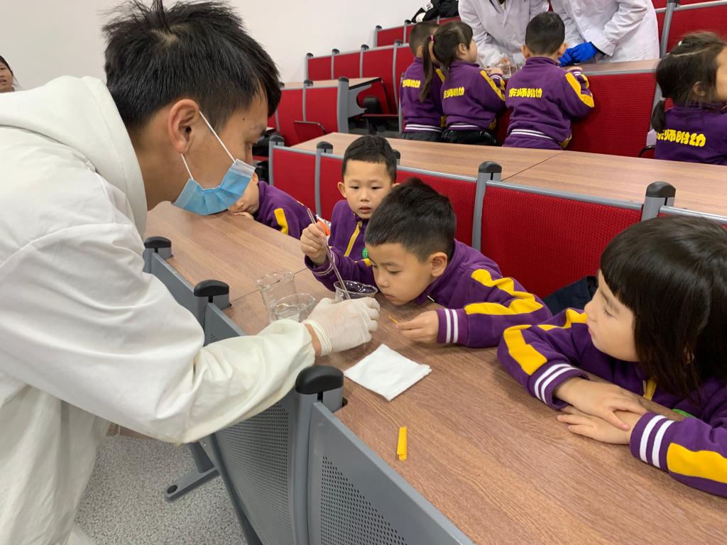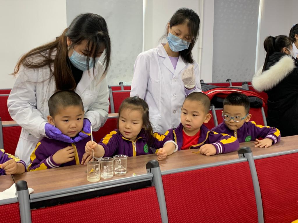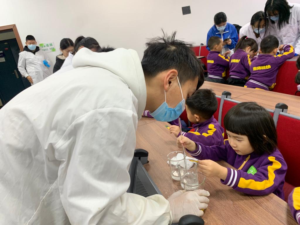 小朋友们来到了盼望已久的化学学院,大家东瞧瞧西看看,睁着好奇的大眼睛四处张望着。来到了实验室,工作人员与小朋友们热情地打招呼后,用最简单的方法向小朋友们讲解了什么是化学:“化学是关于变化的科学。化学实验室里经常做的实验室是把一样东西和其他东西混合在一起产生的一种新的东西。”