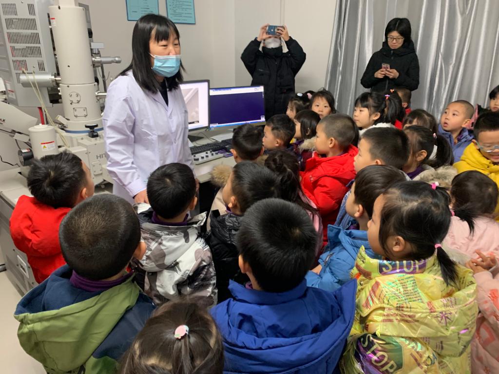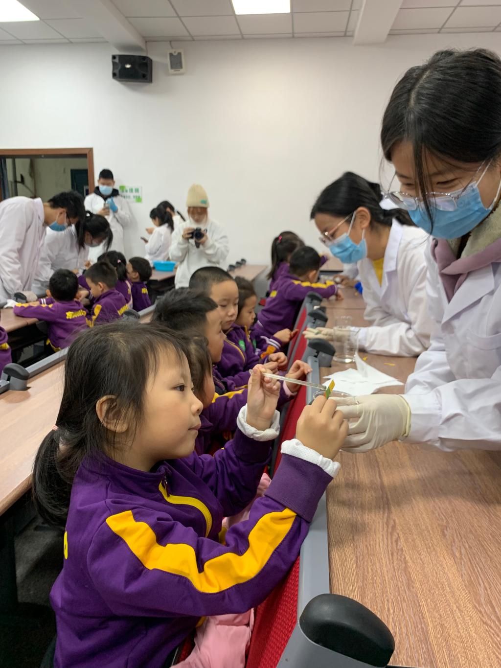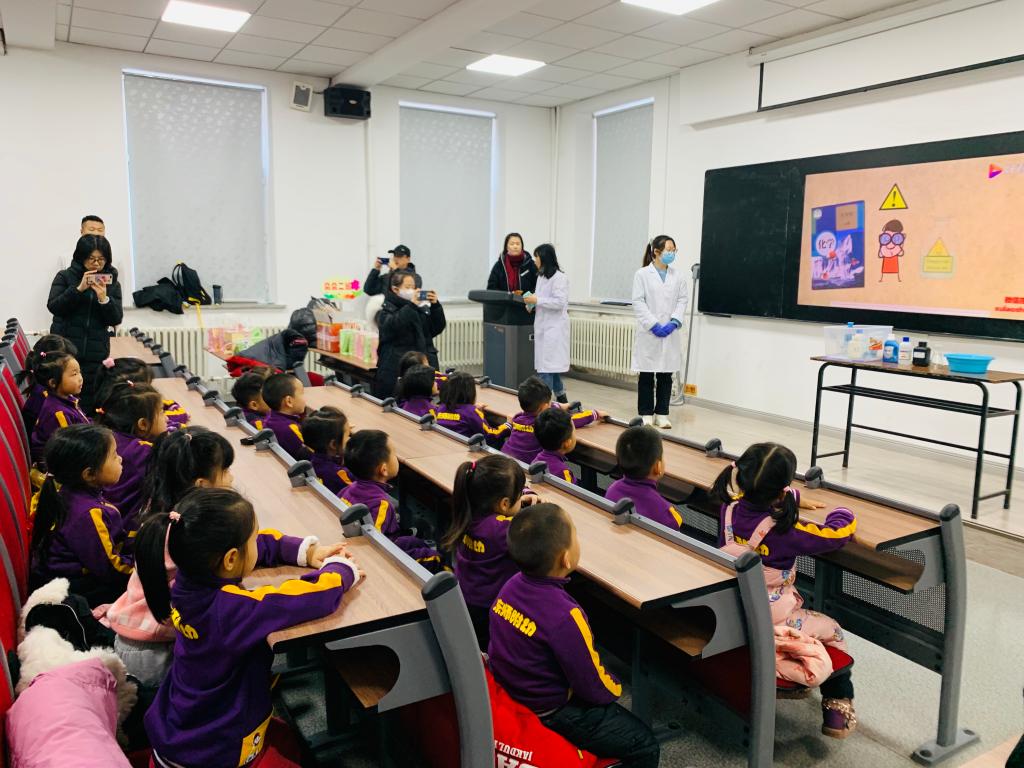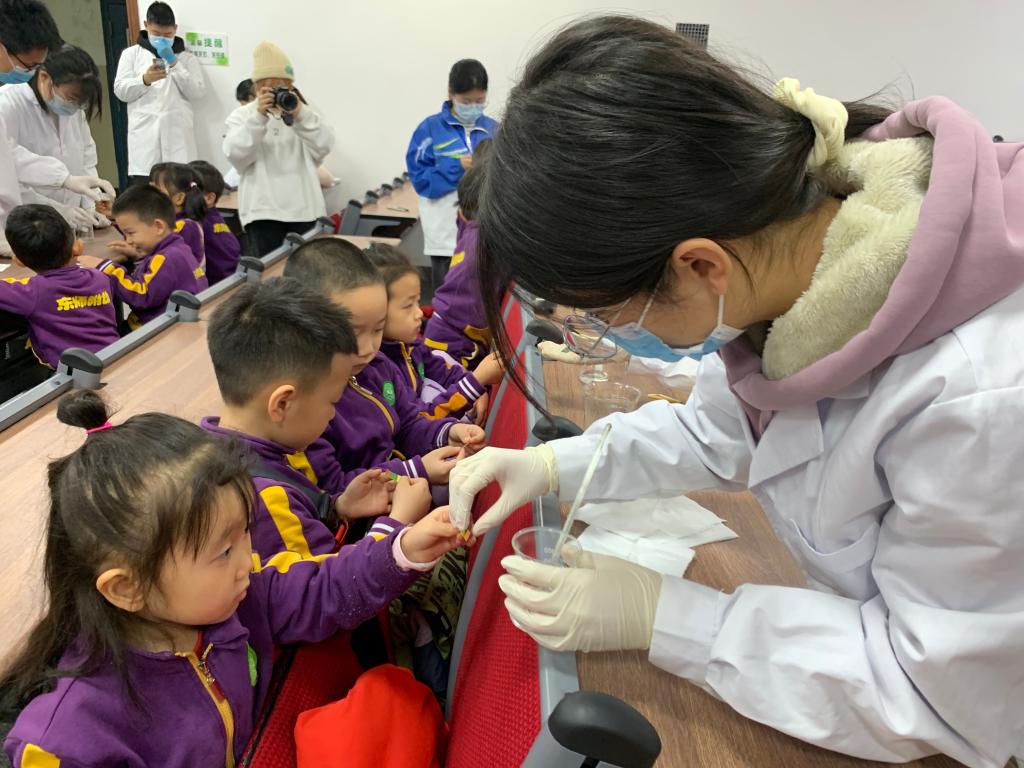 小朋友们来到了盼望已久的化学学院,大家东瞧瞧西看看,睁着好奇的大眼睛四处张望着。来到了实验室,工作人员与小朋友们热情地打招呼后,用最简单的方法向小朋友们讲解了什么是化学:“化学是关于变化的科学。化学实验室里经常做的实验室是把一样东西和其他东西混合在一起产生的一种新的东西。”
