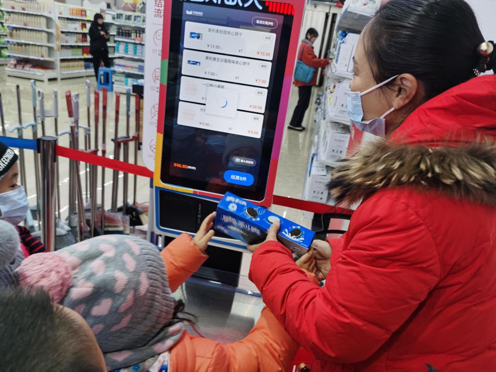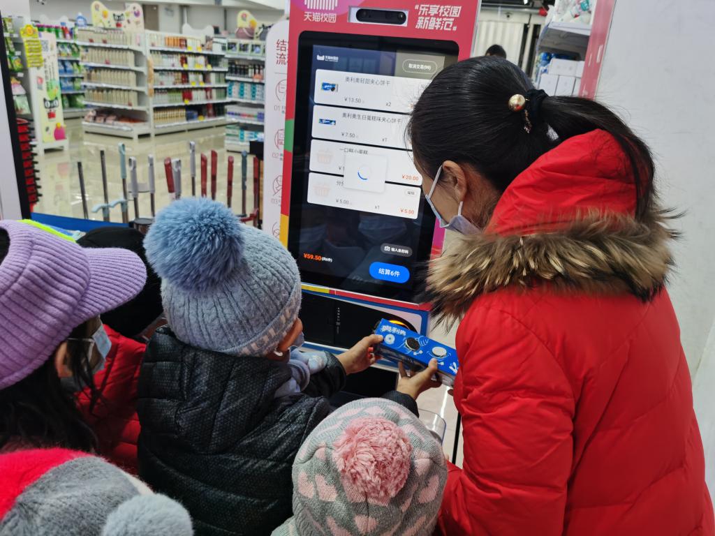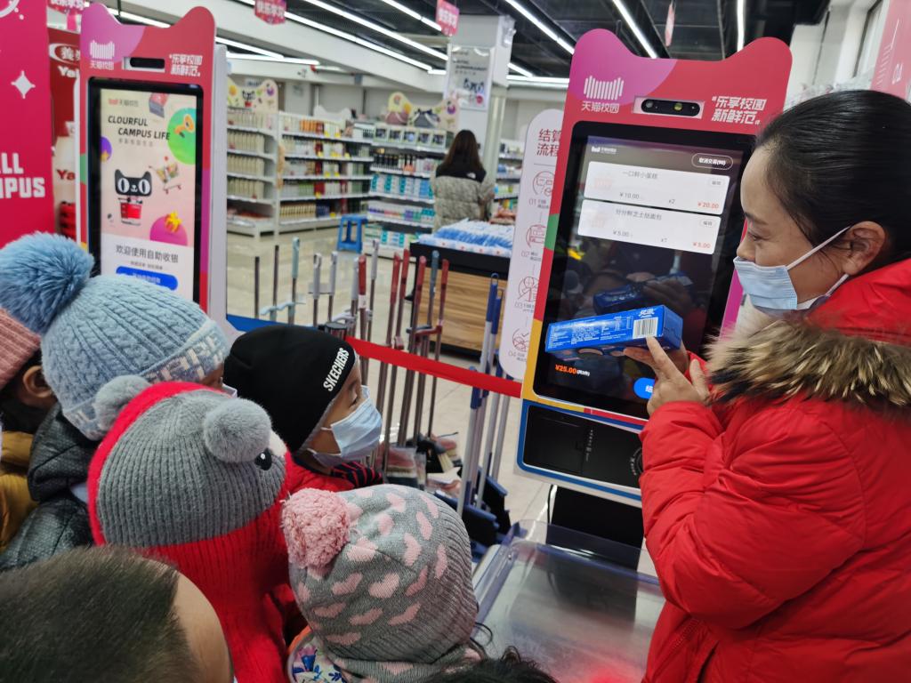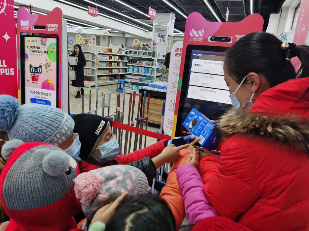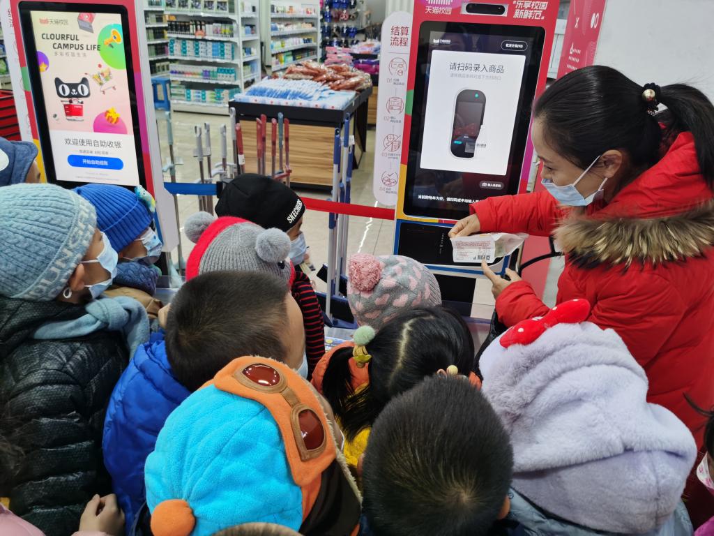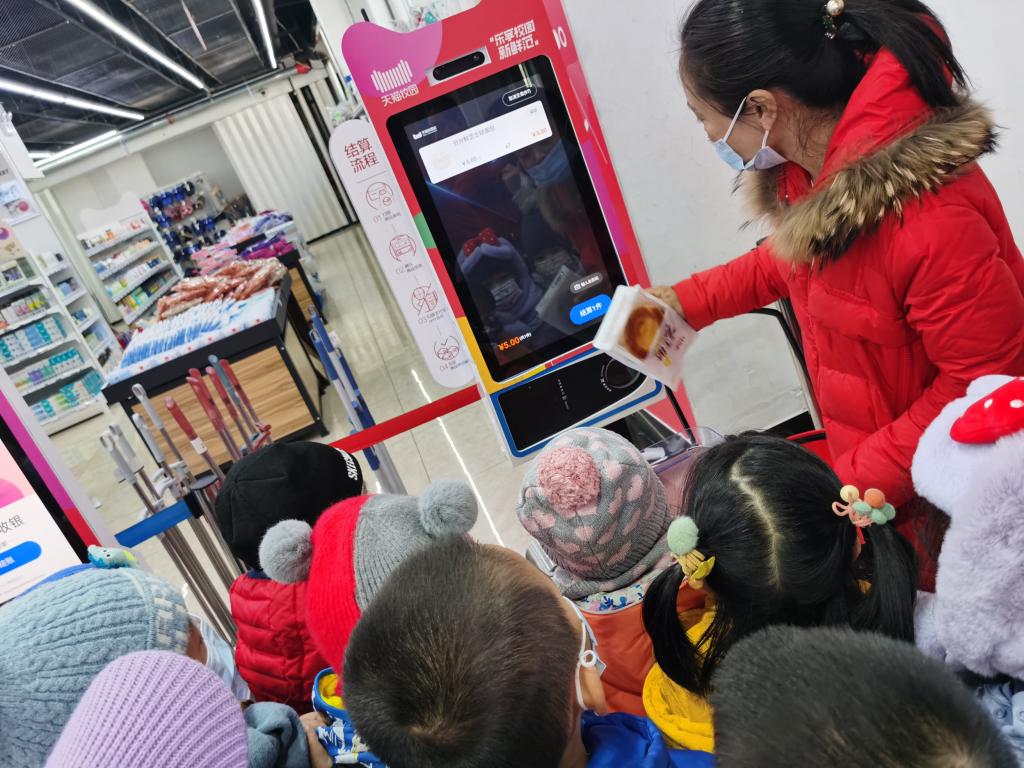 来到收银台,我们选择的自助收银,也请两位小朋友体验来扫码结账,孩子们很高兴,表示都想试试。