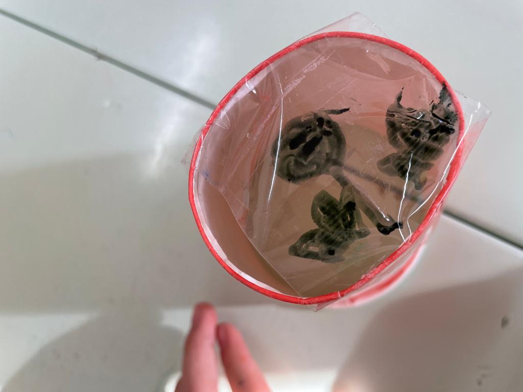 其次,用透明胶带或者保鲜膜贴在无底的杯子底部。