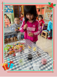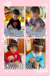 小朋友们兴致勃勃地开始做起了实验,并品尝了甜甜的糖水,孩子们开心说到:“老师我杯子里的糖不见了,融化了。”“老师,我的糖水甜甜的,真好喝呀。”