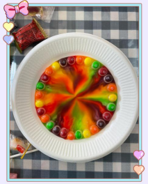 小朋友们围在一起纷纷都猜测彩虹糖融化会变成什么样子?