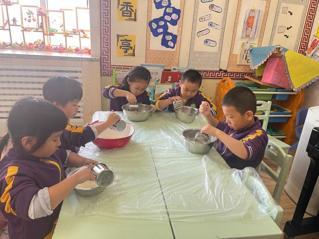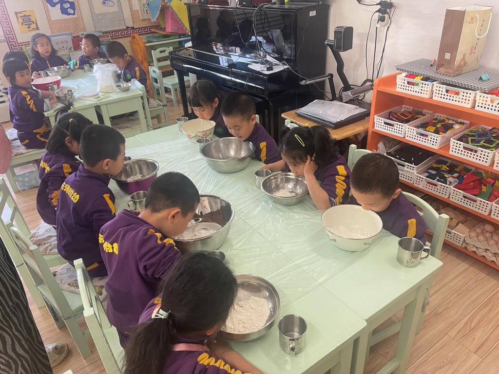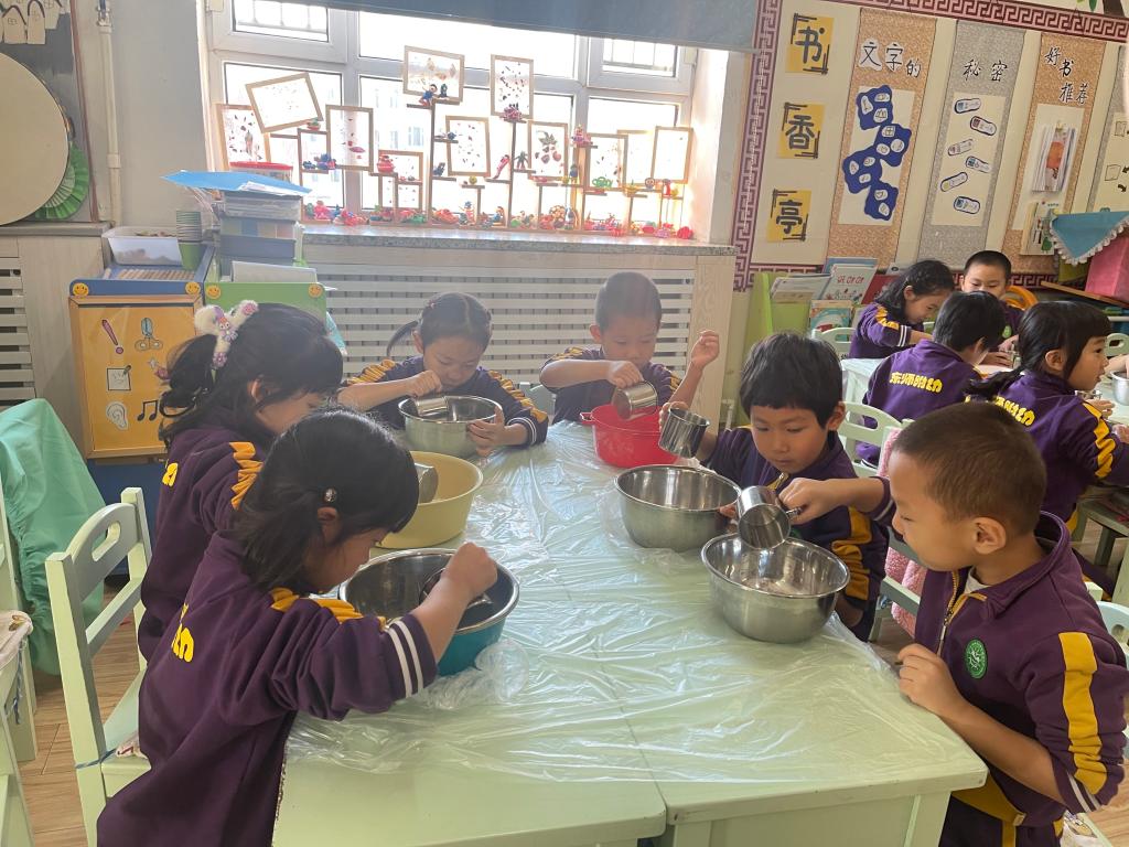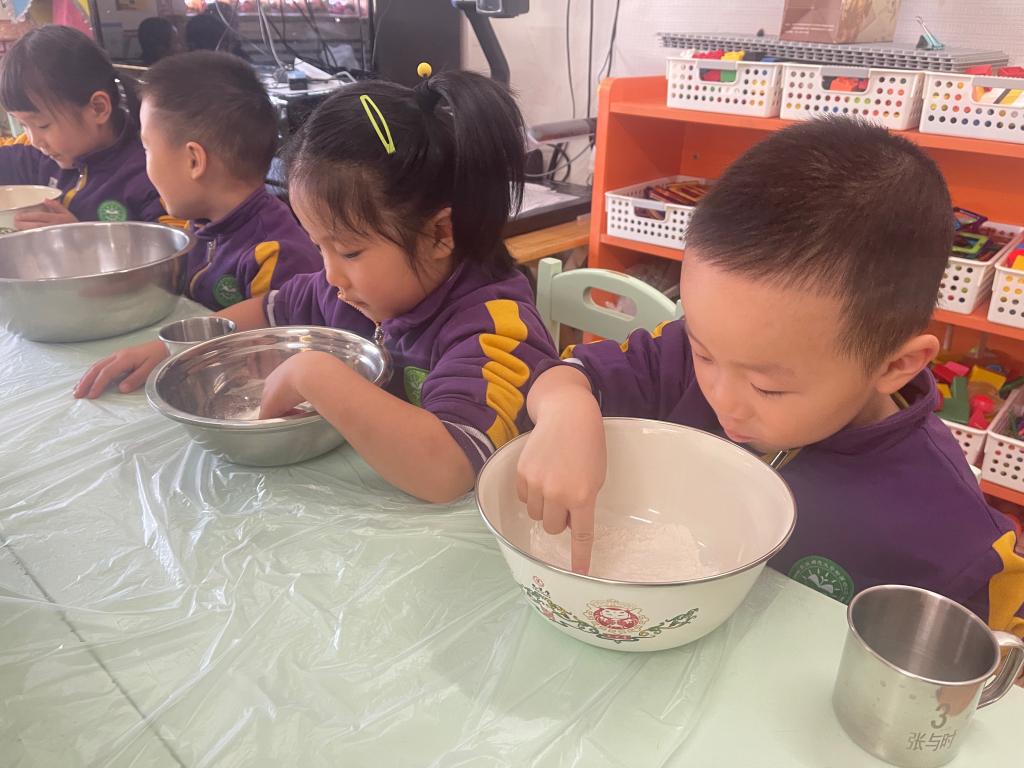 这时,我们为孩子们每人准备好一杯水,请小朋友们开始和面,同时提示孩子们“边倒水,边搅拌面粉,小朋友们可以观察下面粉有什么变化?”