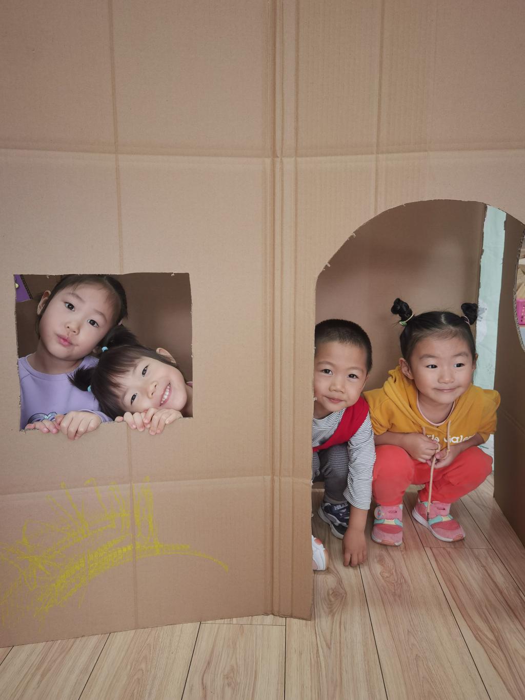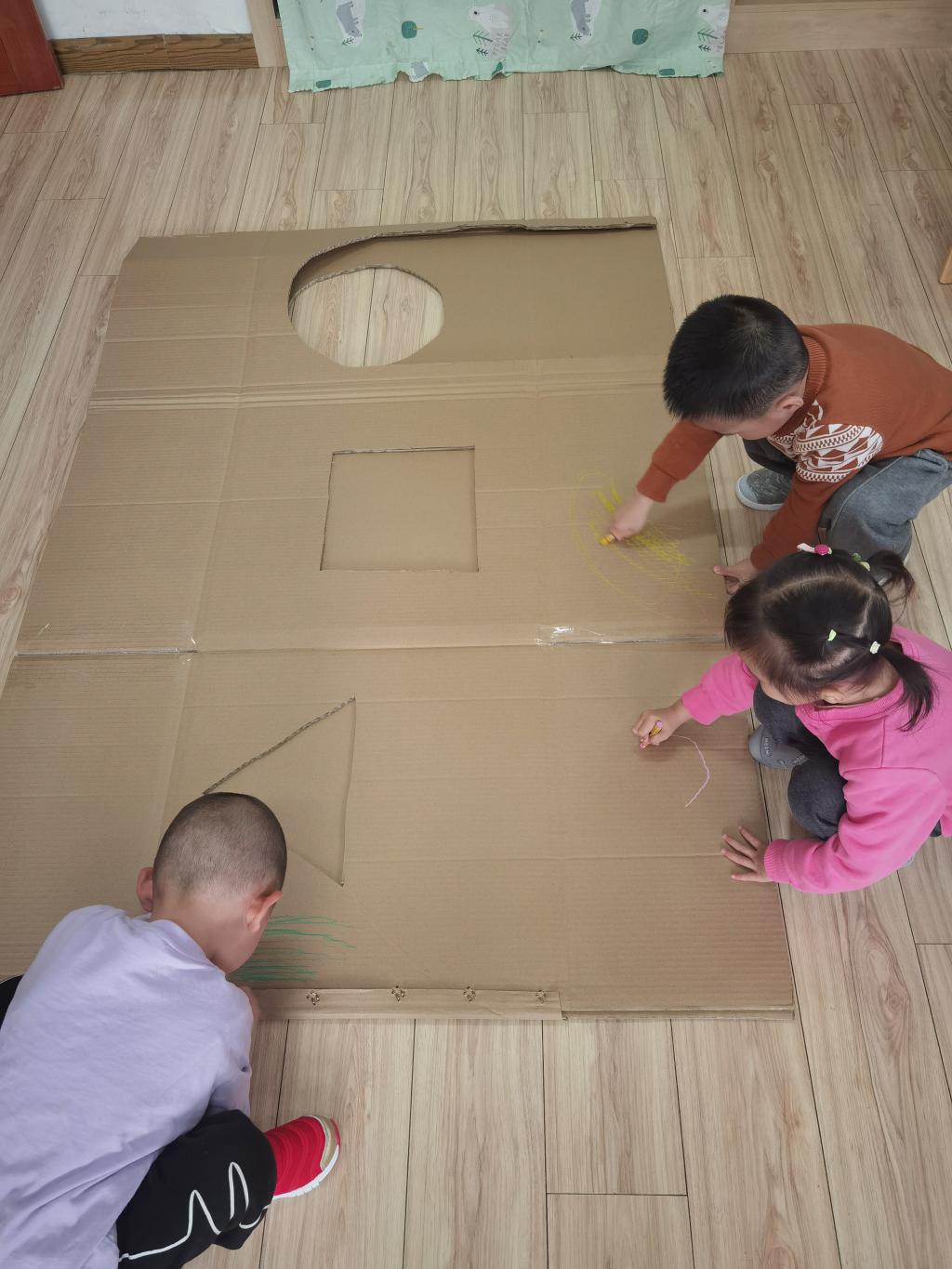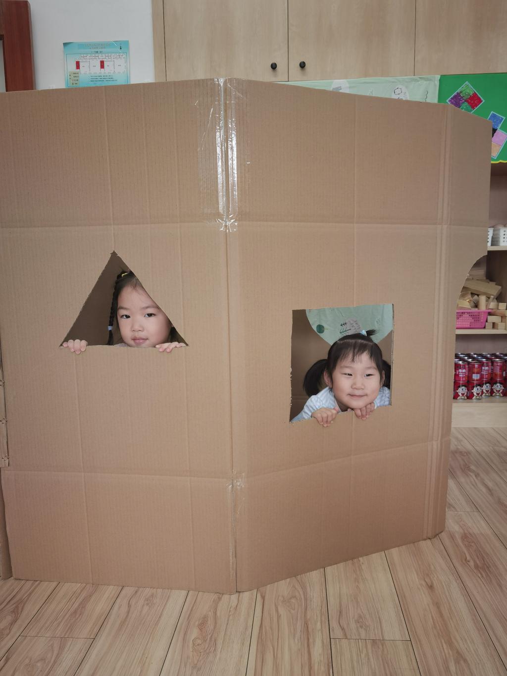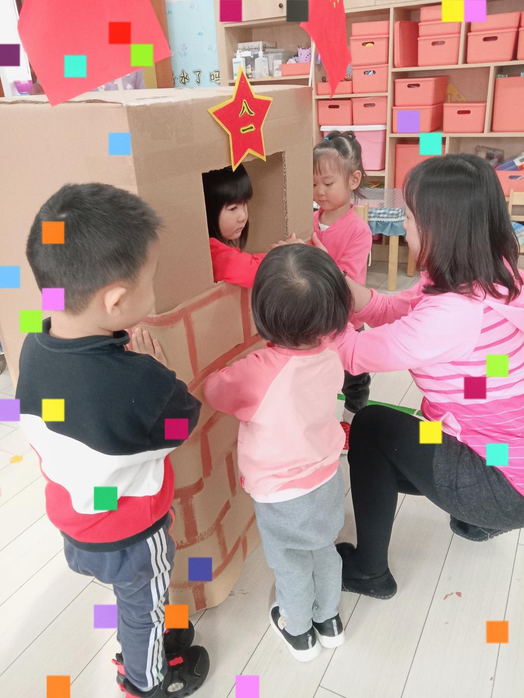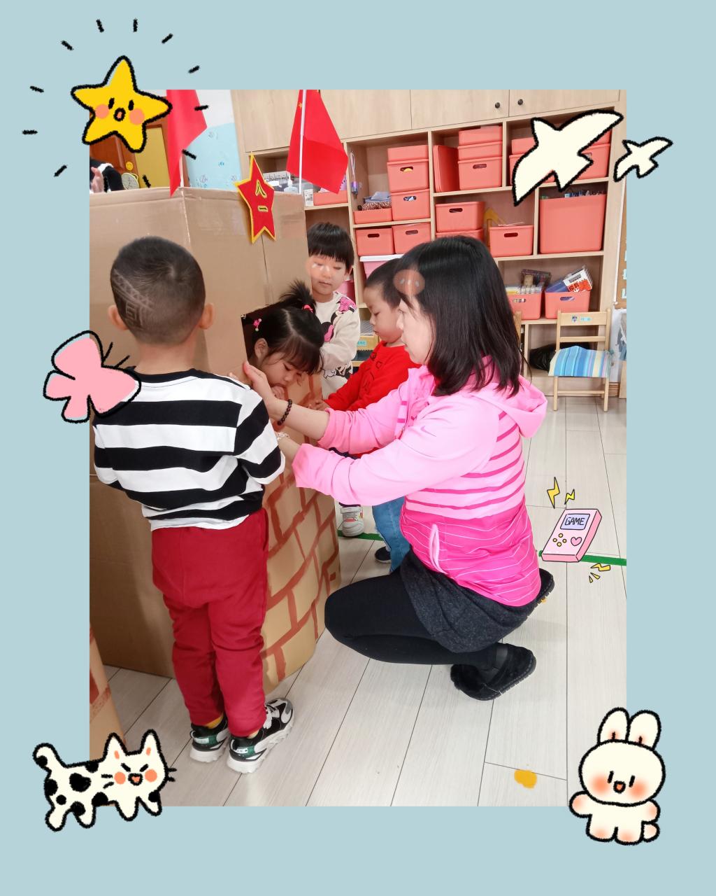 孩子们畅所欲言,并且在老师的帮助下用纸箱制作好了碉堡和岗哨。