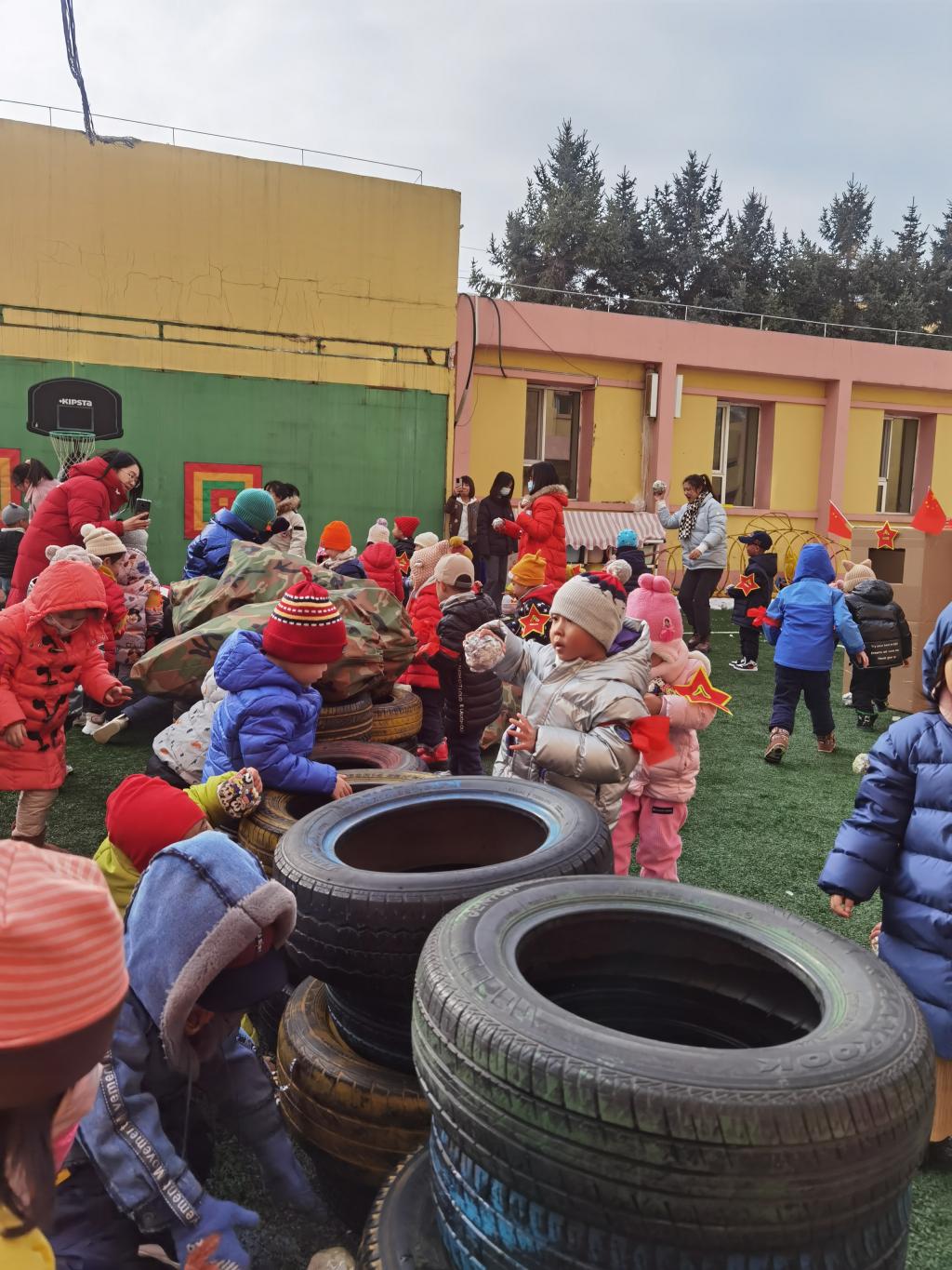 用轮胎和沙袋堆砌的墙将操场一分为二,两房阵营的小小兵互不相让,他们争先恐后的向对方场地投掷“炸弹”。孩子们动作标准的投掷,迅速敏捷的躲闪,小小兵们英姿飒爽!