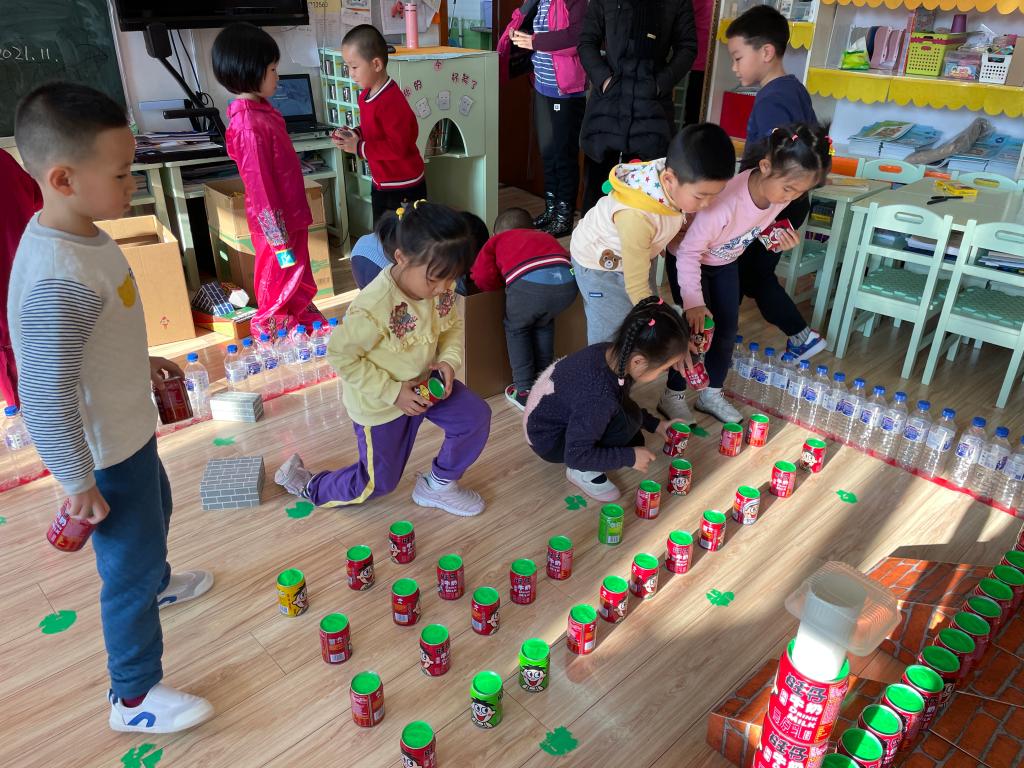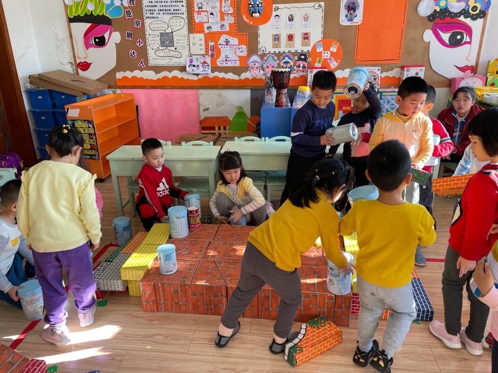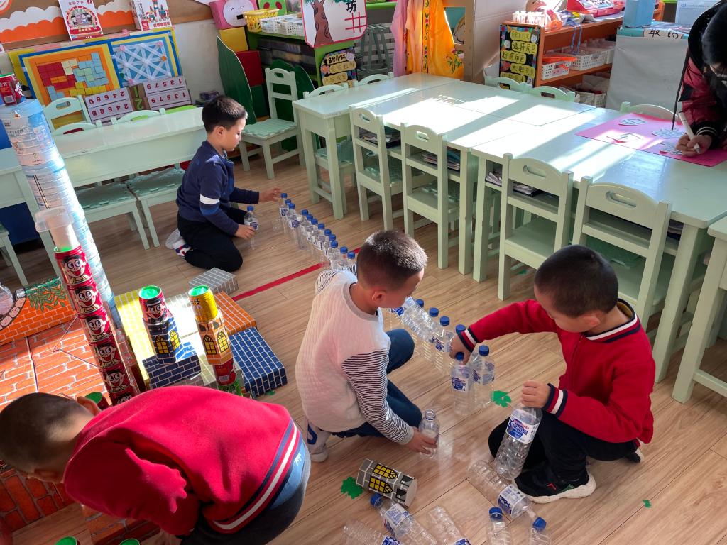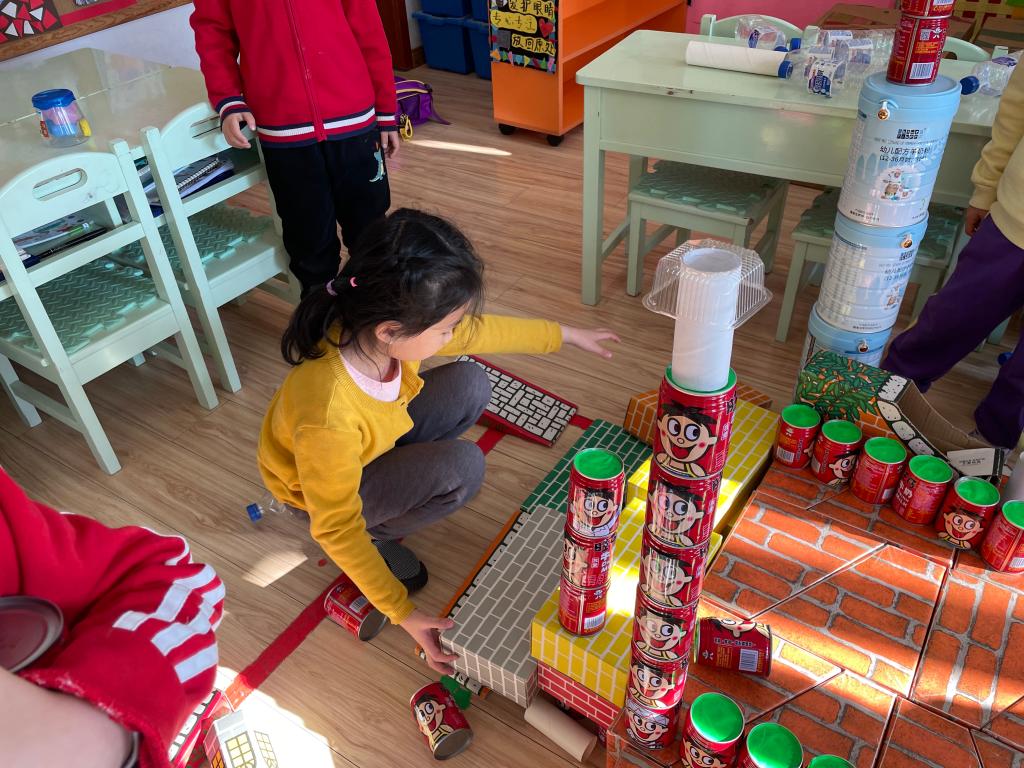 孩子们分工合作开始搭建啦!他们利用搜集来的奶粉桶、旺仔牛奶罐、矿泉水瓶等多种搭建材料,综合运用架空、组合、排列、穿插、垒高、有规律的平铺等技能进行搭建,让我们一起来看看孩子们的精彩表现吧!