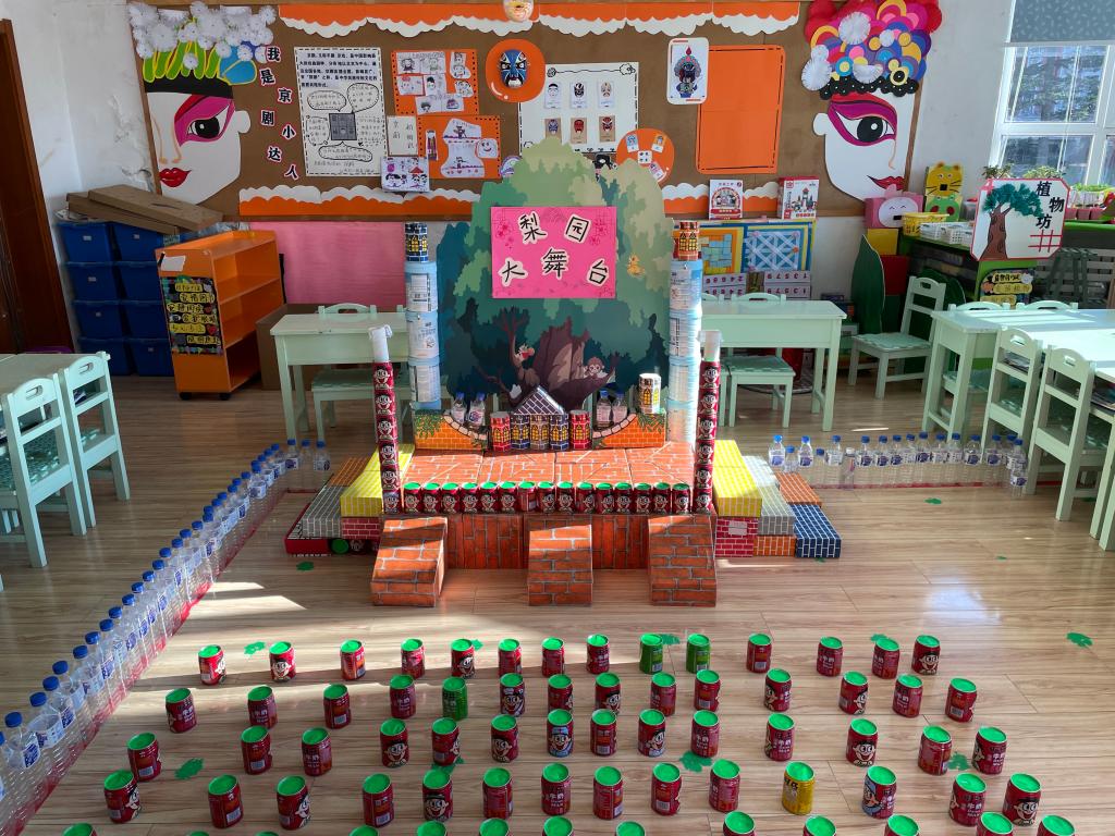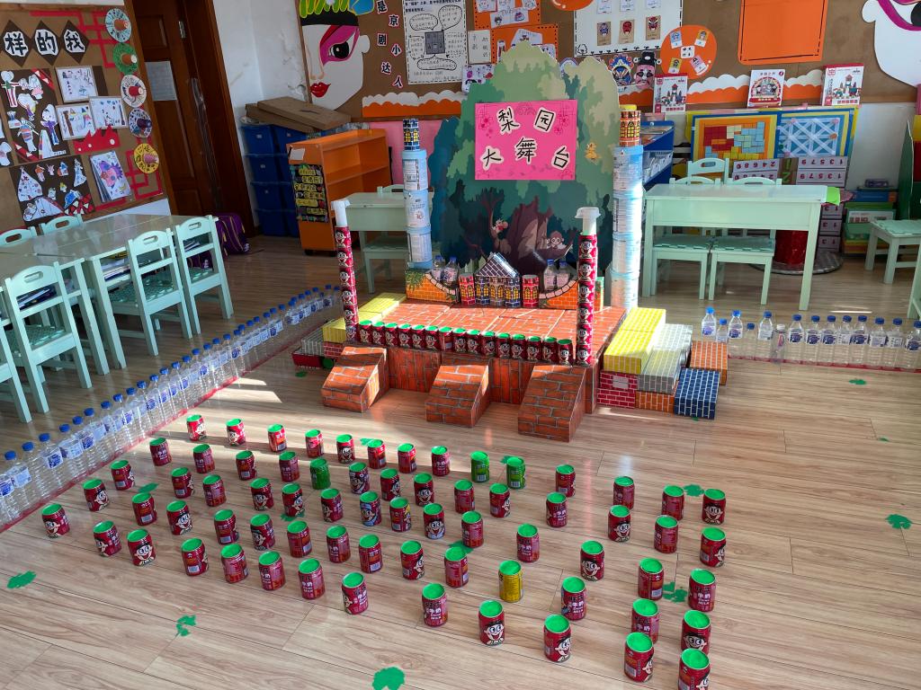 用奶粉桶和旺仔牛奶罐搭建出舞台立柱和花墙。