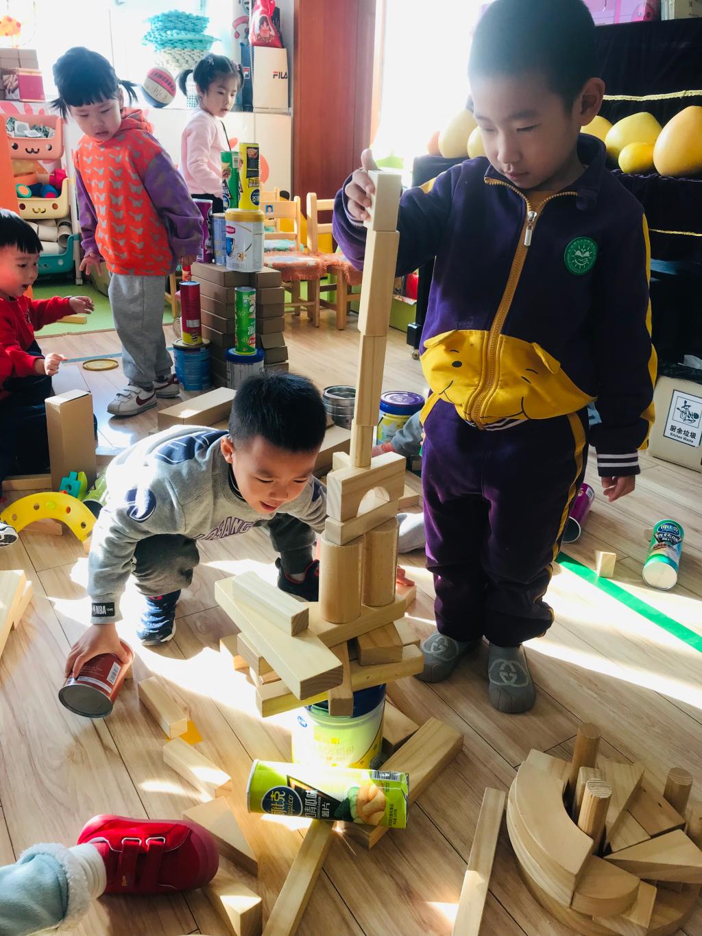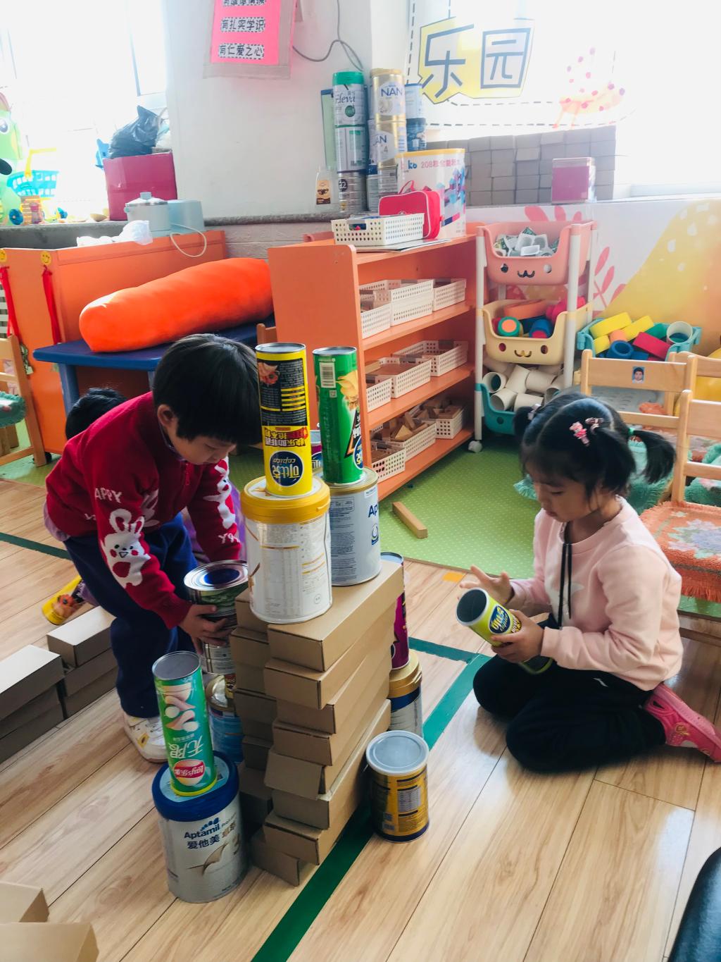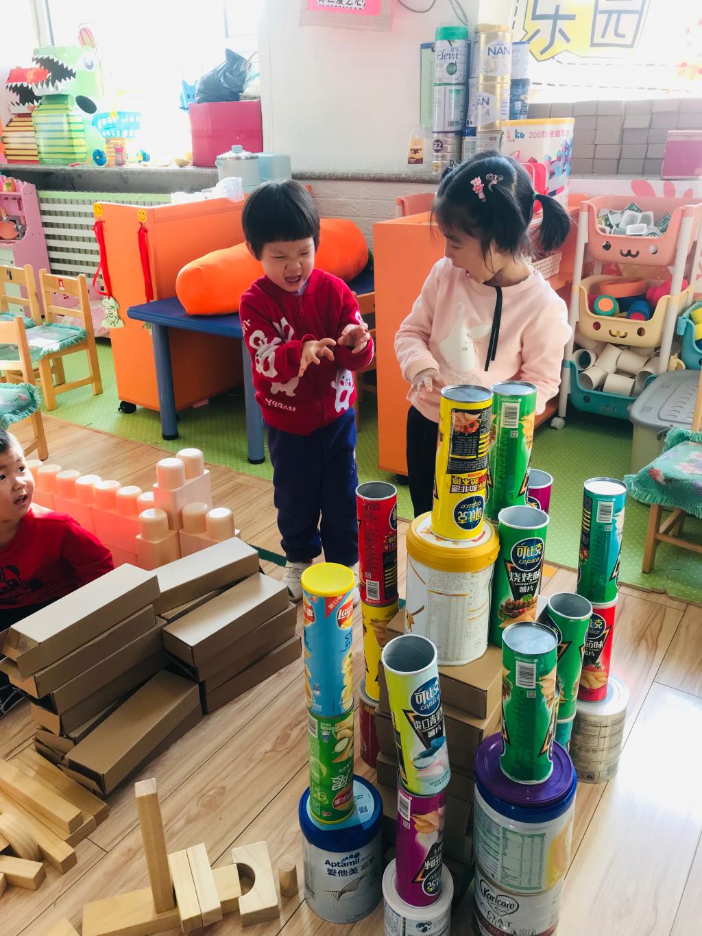 嘉禾回答道:恩,我觉得咱们还需要一些奶粉桶,它才不会倒。两个小伙伴迅速去拿来需要的材料,把高楼搭的更高,更结实。