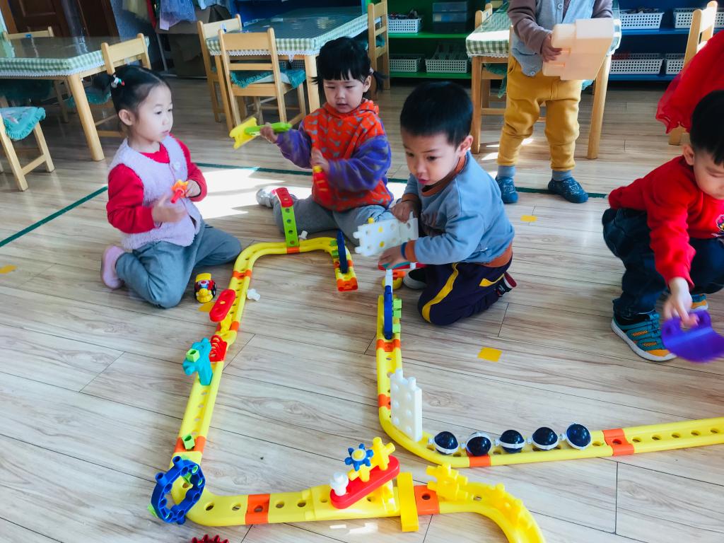 馨馨和丫丫一起说:我们再去找一些轨道积木吧,这样汽车就能正常通过,我们也能来幼儿园了.......