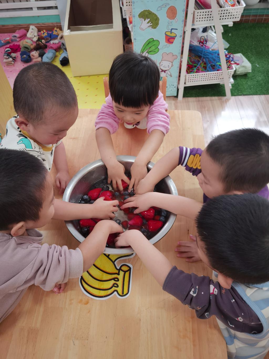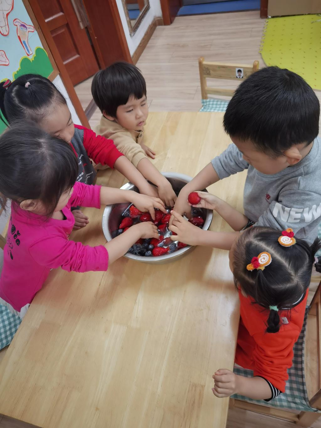 “我们一起来洗水果吧。”“那我们来给香蕉橘子扒皮。”孩子们讨论的十分热烈,他们分工合作把水果都洗的干干净净。