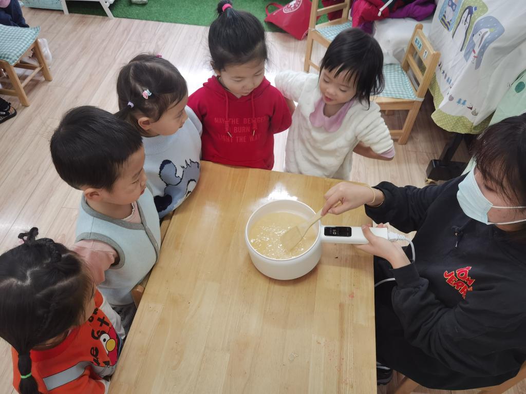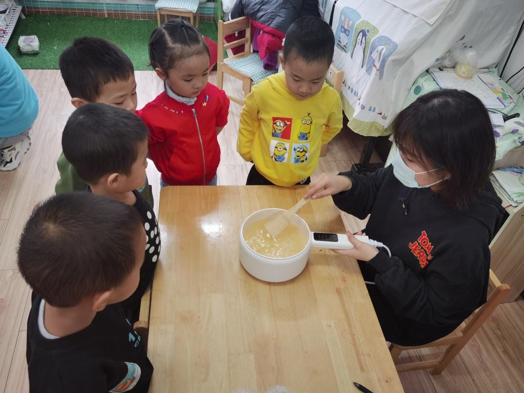 现在到了我们熬糖的时间了,小朋友们仔细看,我们的冰糖有没有融化呢?“老师,小冰糖变得越来越小了。”“我闻到了甜甜的味道。”“哇,我们的糖变颜色了,变成黄色了。”