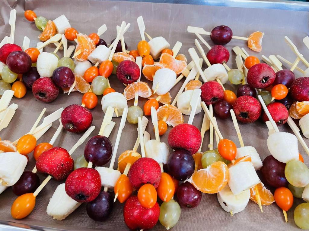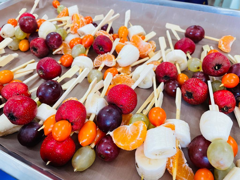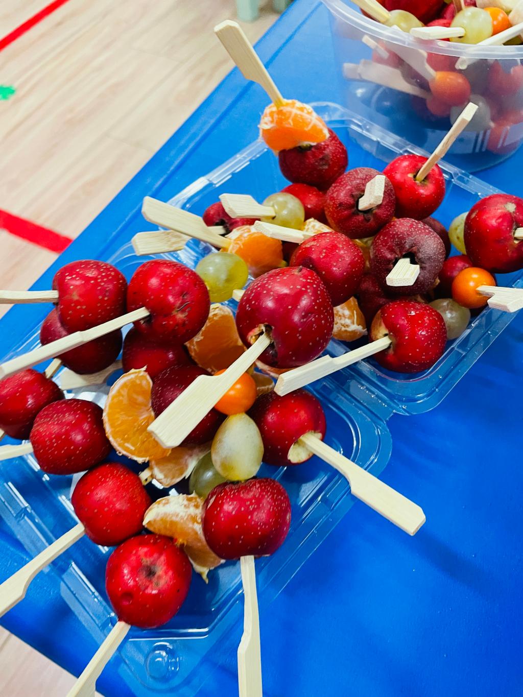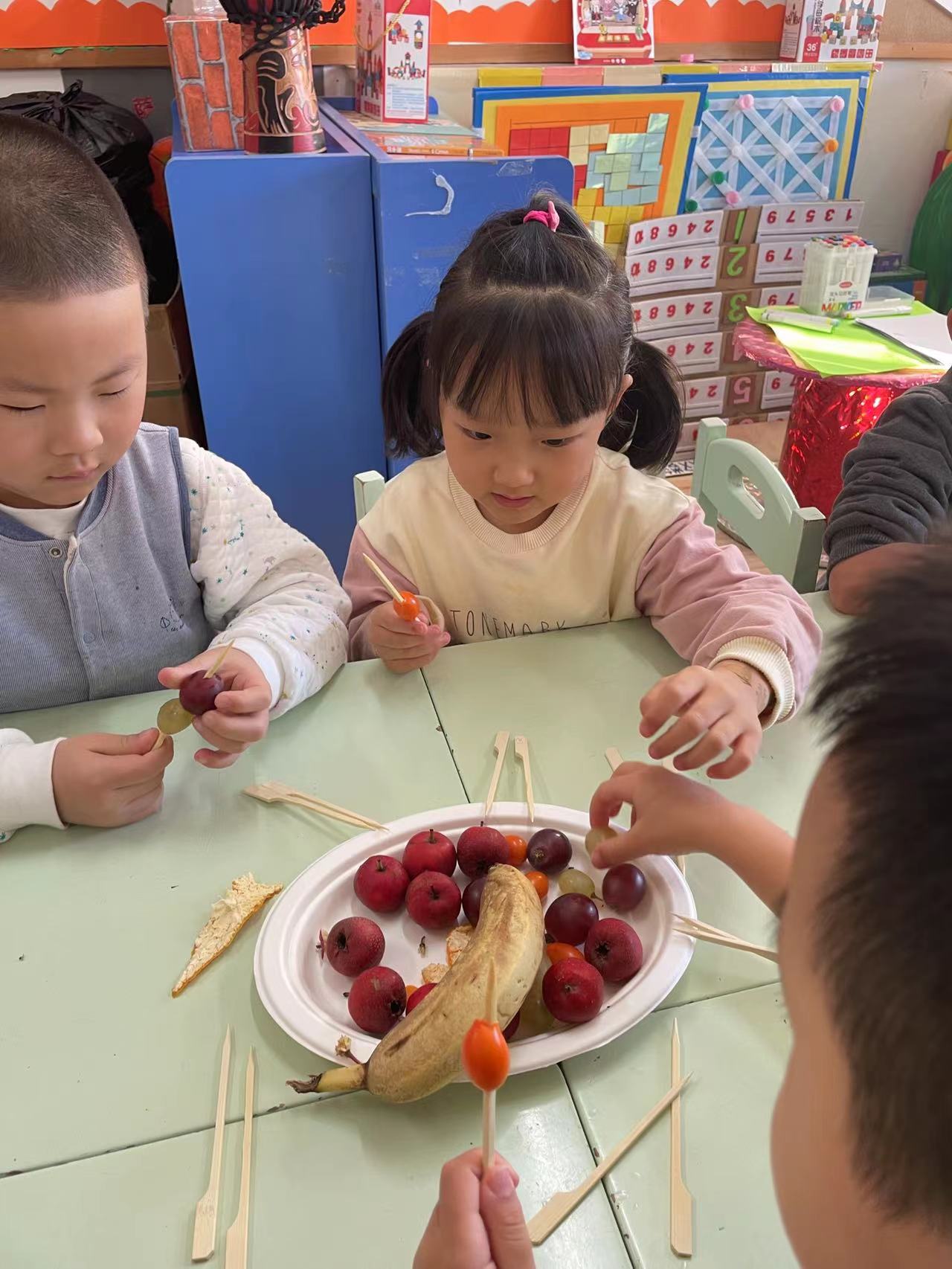 串水果可是个技术活,孩子们真是太棒了,不仅把各种各样的水果串的牢牢的,连颜色也搭配的特别漂亮,一串串水果光是看着都让人流口水!