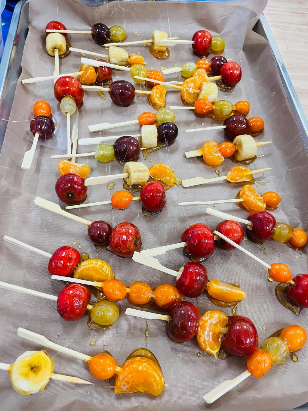 把一串串水果放在糖浆上蘸一下,稍微冷却,一串串晶莹剔透的糖葫芦就做好了!
