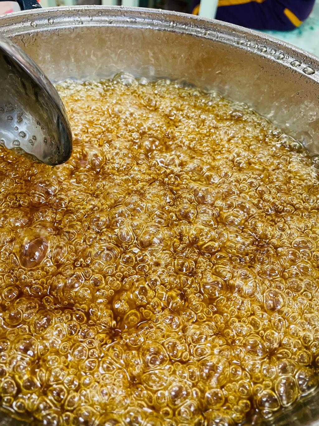 老师用冰糖和水熬制了可口美味的糖浆,熬糖浆可是一个关键的步骤,必须仔细认真,达到糖浆冒小泡为宜。