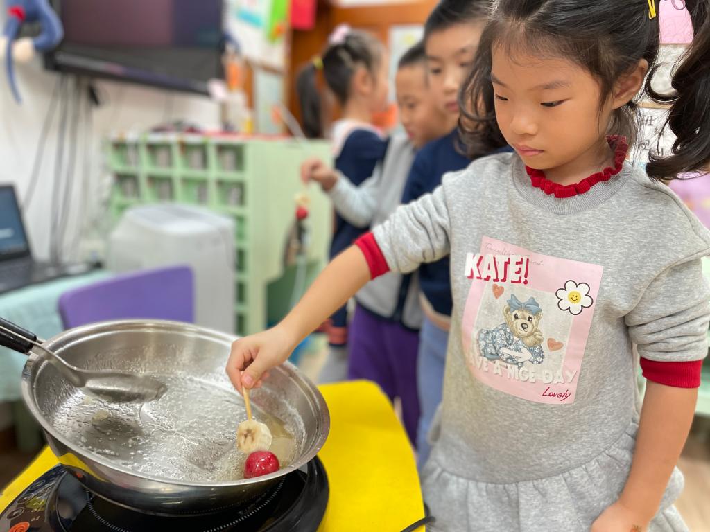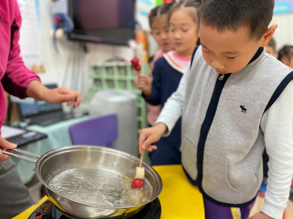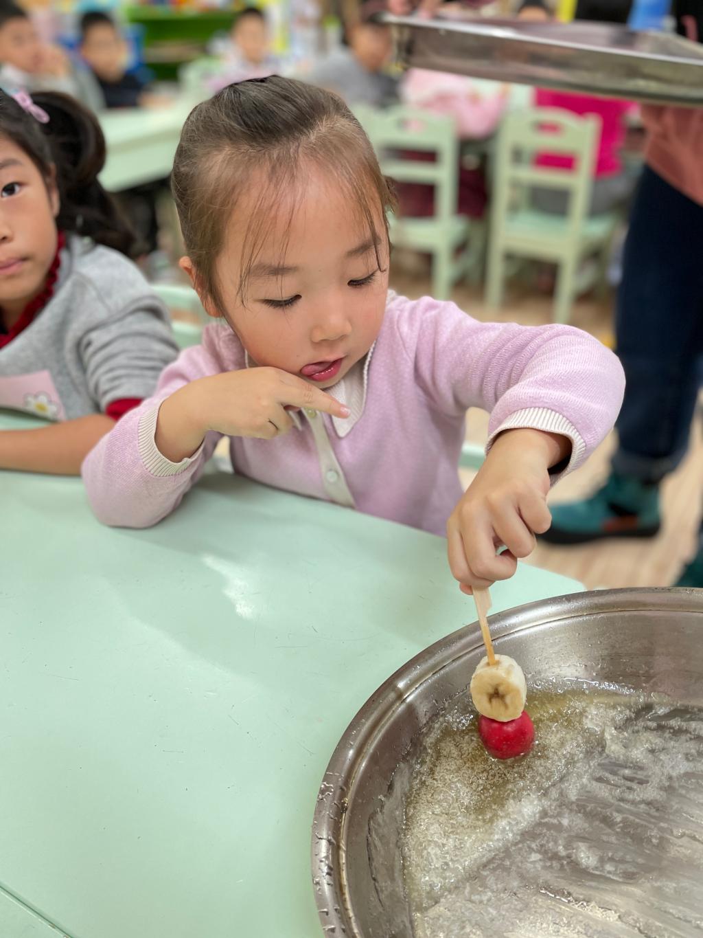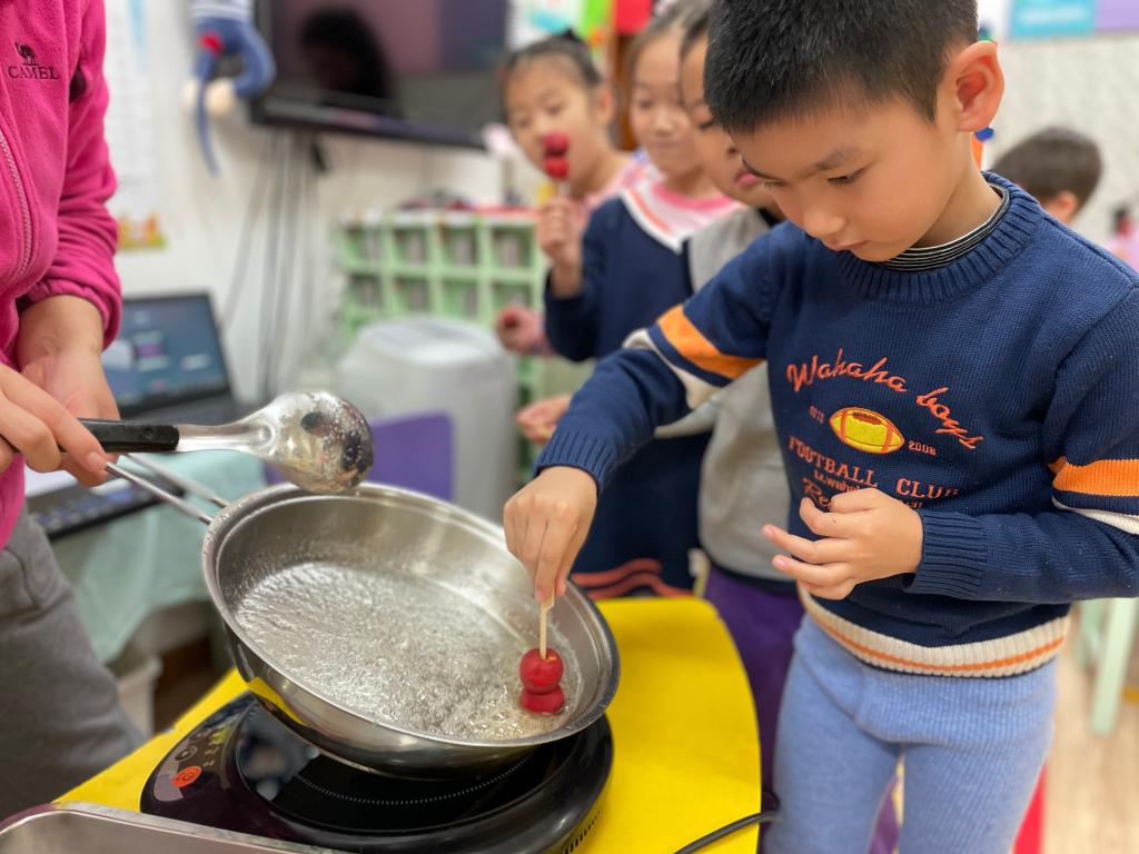 今天小朋友们将美味的水果亲手制作成了自己喜欢的冰糖葫芦,孩子们不仅了解了水果的不同营养和用途,同时也体验了自己动手的快乐,孩子们忙的不亦乐乎,让我们一起来看看小美食家的风采吧!