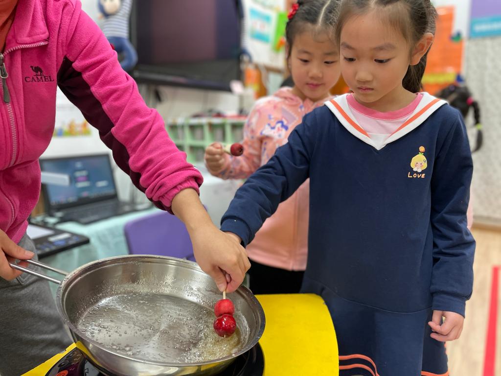 精选食材不容马虎。孩子们细致用心的处理各种制作糖葫芦的材料,精心挑选各种水果,清洗干净,水果穿串。