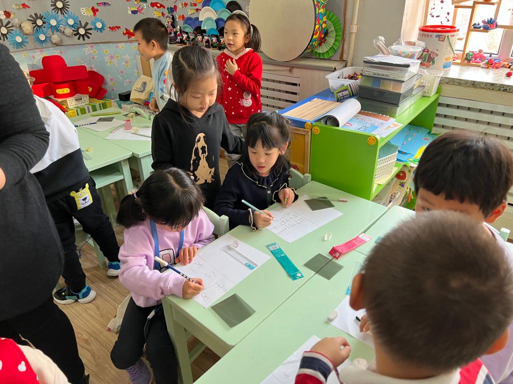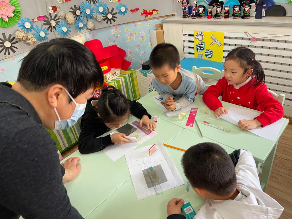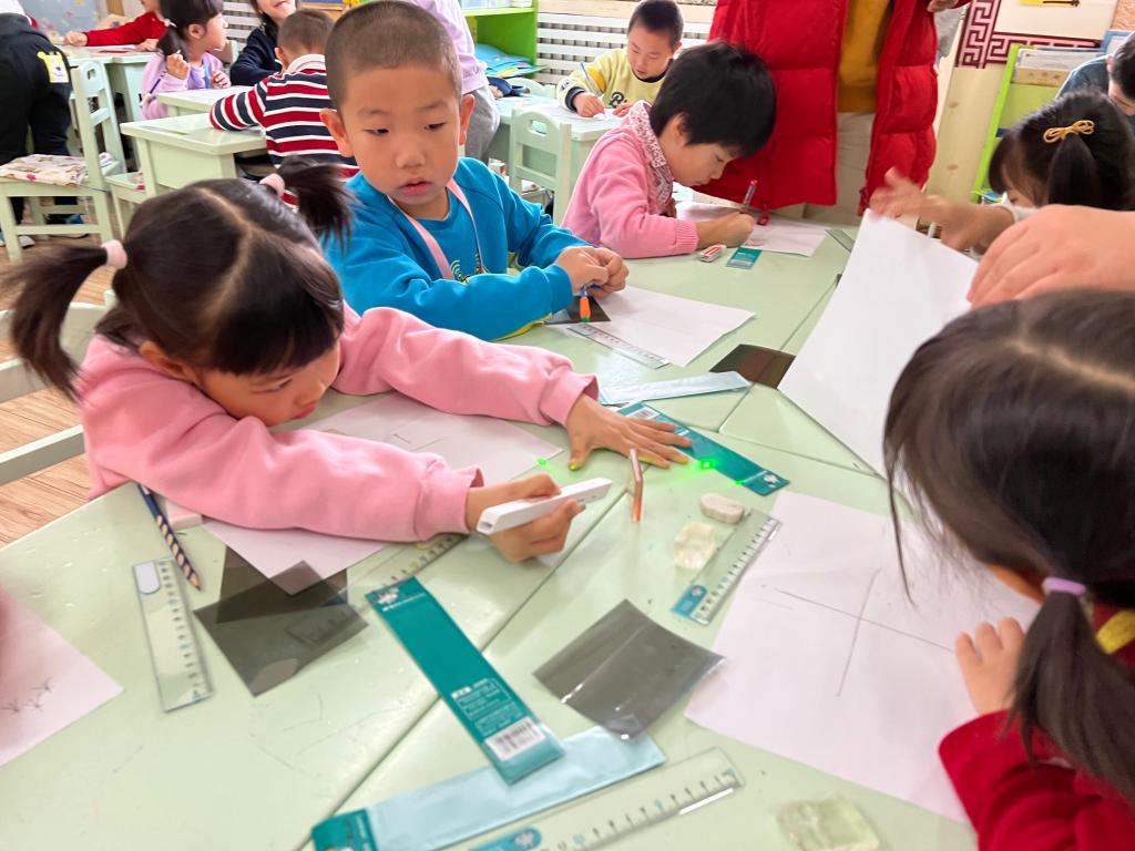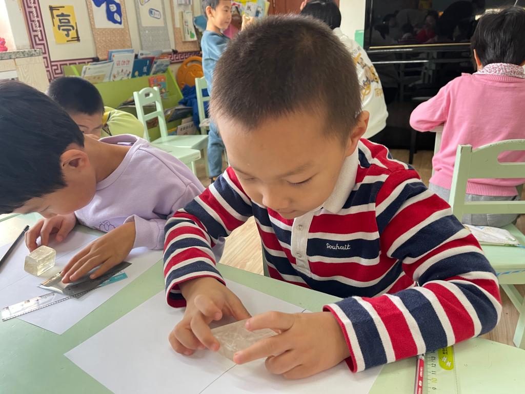 “孪生兄弟”的实验中,每个小朋友都亲身参与其中。先是认真地用直尺在白纸上画了一条直线,当把方解石晶体放在直线上,神奇的现象出现了,原本一条直线竟然多出了一条,变成了一对平行线;小朋友们不可置信的反复将方解石晶体拿起又放下,一脸的困惑和好奇。