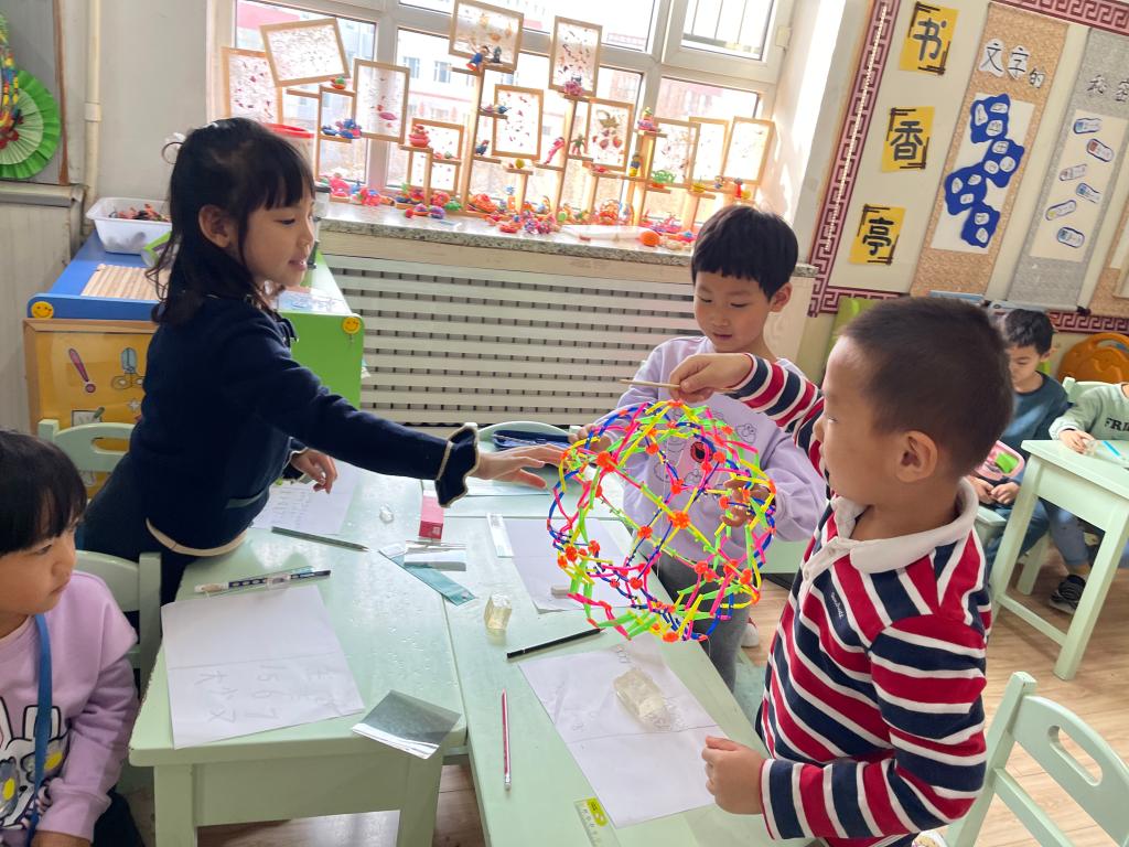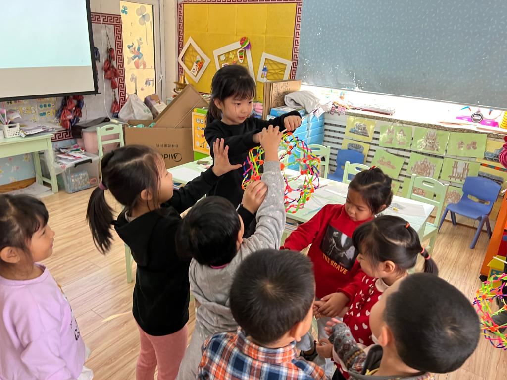 最后,小朋友们团结协作,共同参与魔术球的游戏。这是利用角动量守恒原理,当魔术球较大时转动较慢,而当魔术球变小时转动较快。小朋友们在游戏当中自己想办法解决遇到的实际困难,在玩中乐,在乐中学,在学中悟,既锻炼了不怕困难,乐于动脑解决问题的能力,也体验到了团结协作的重要性。