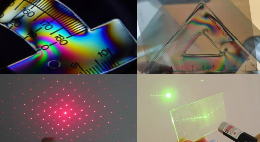 利用光的光弹效应原理,塑料在应力改变的时候会改变它两个方向折射光的折射率,随着塑料各处应力的不同,对应地方的光学性质也不相同,因此会在模型上显示为彩色的条纹。利用光的衍射现象,让孩子们观看到了五彩斑斓的光学现象,美丽的点阵衍射图。