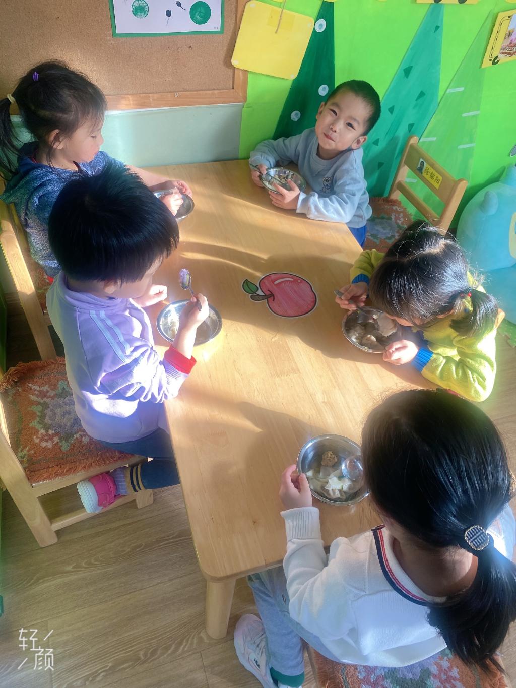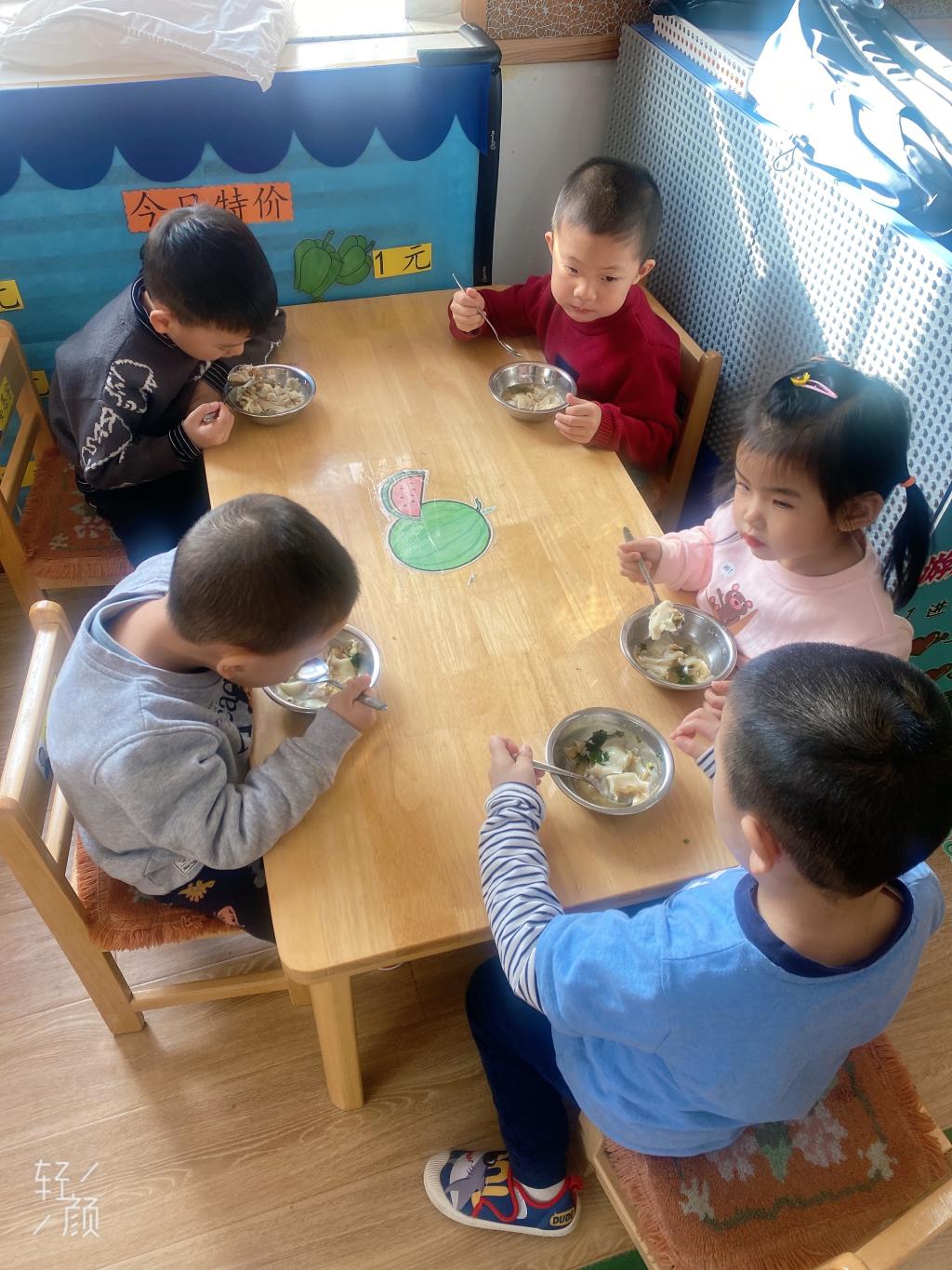 馄饨煮熟啦。小朋友们先品尝了馄饨,自己动手包的格外好吃。
