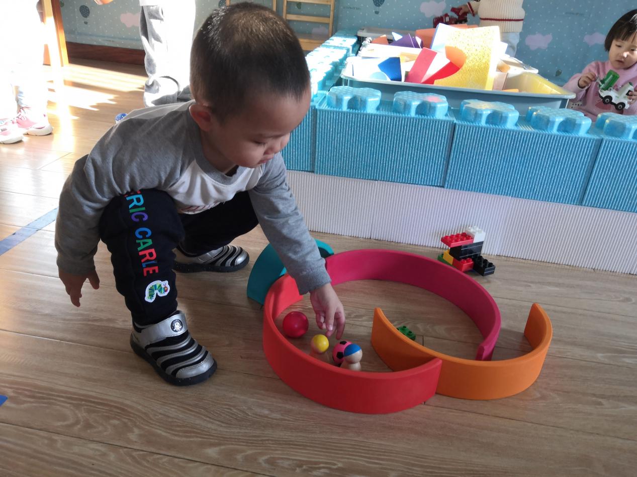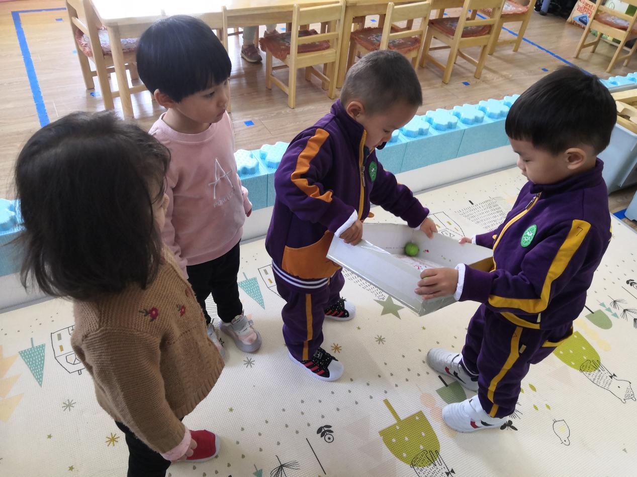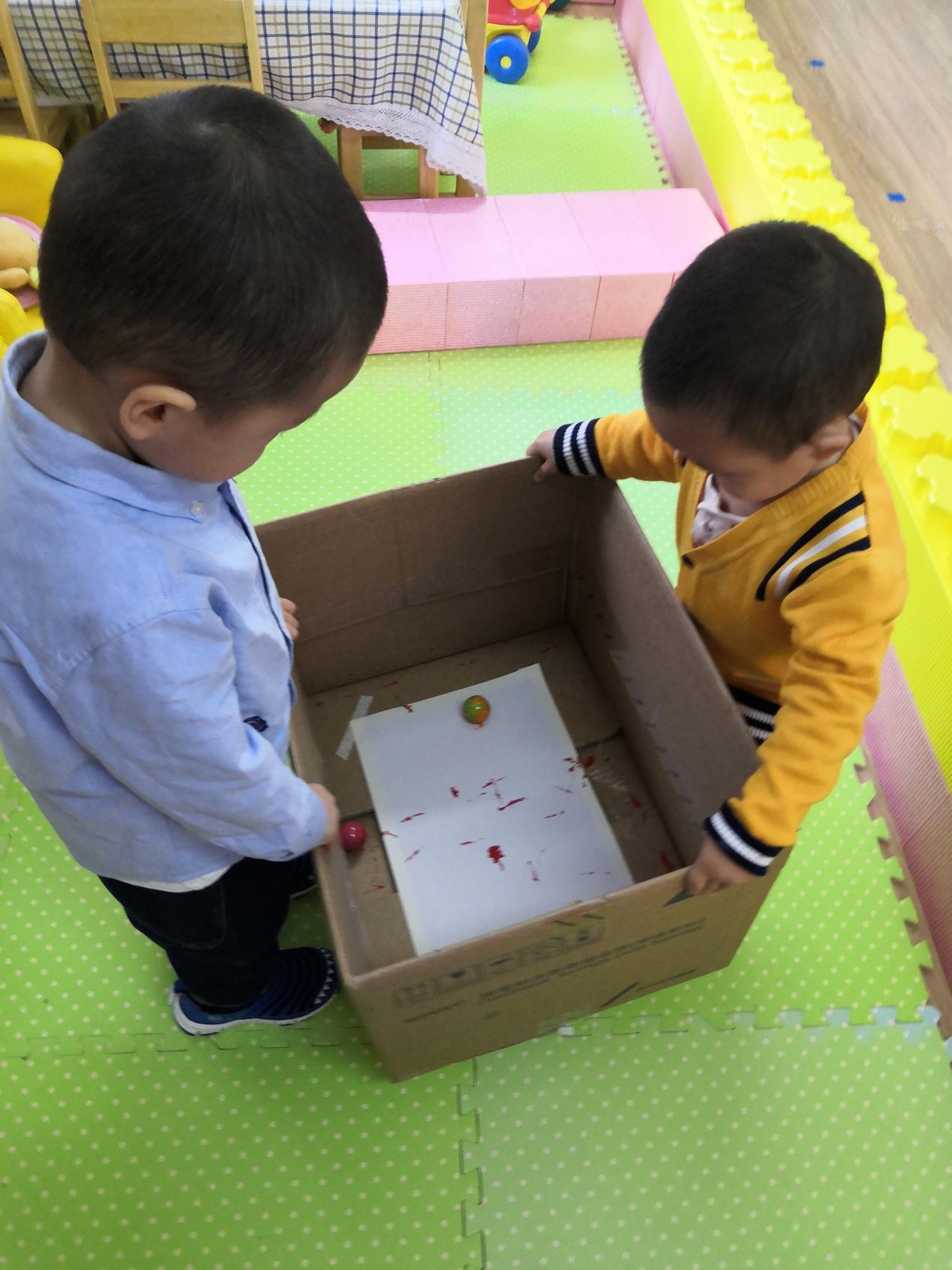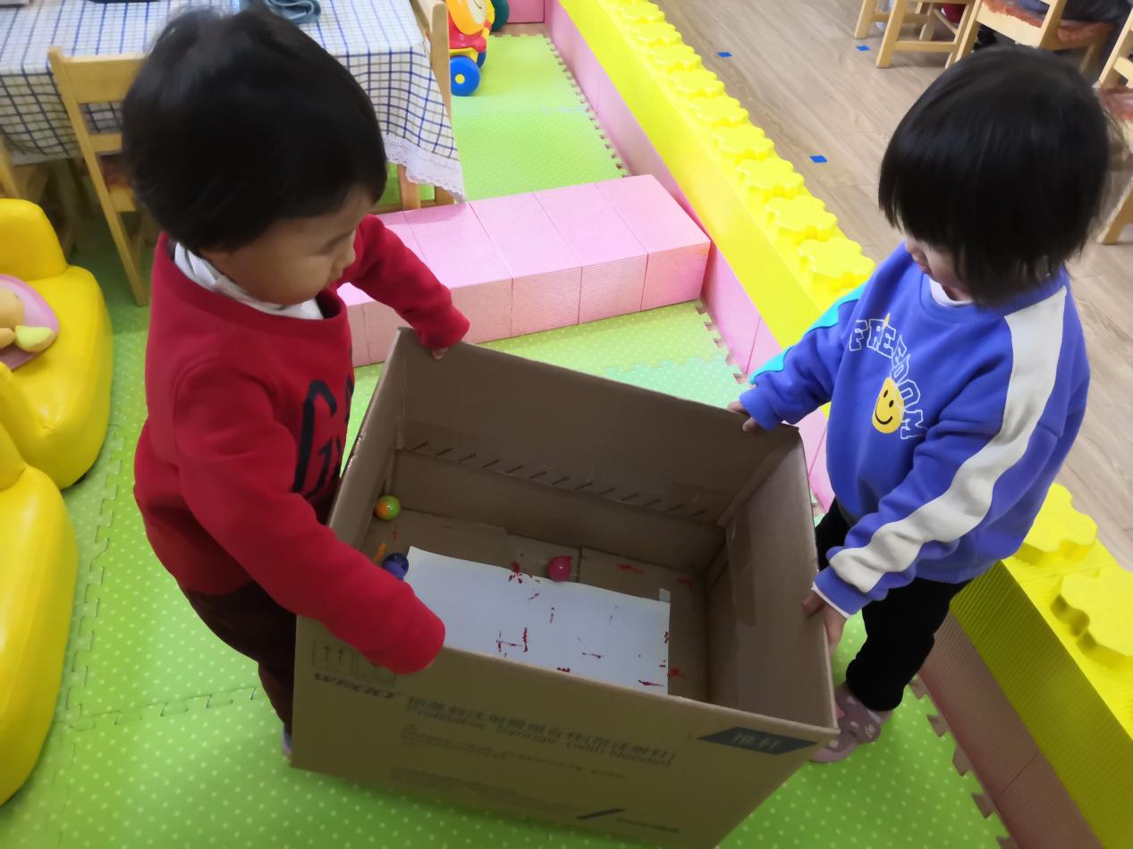 小球会滚动到哪里?小球放在盒子里怎么不动了?小球放在奶粉桶里怎么滚动?怎么让小球在纸盒和纸箱里滚动?大箱子抬不动,两个人一起试试吧!小小科学家们探索不止。