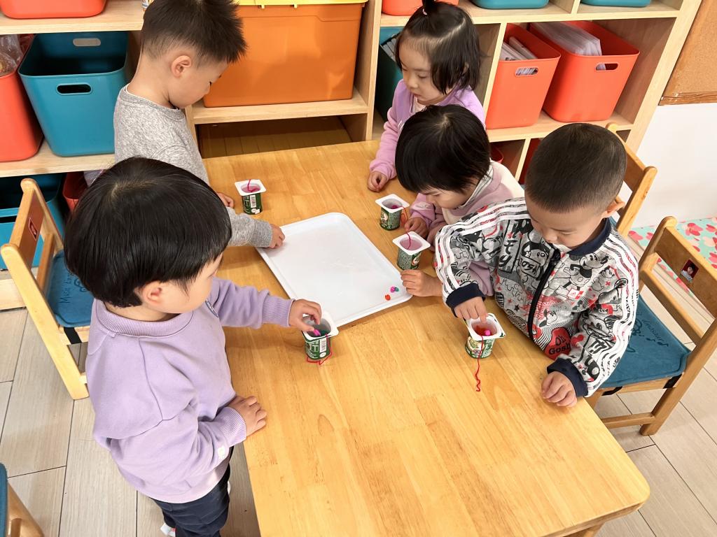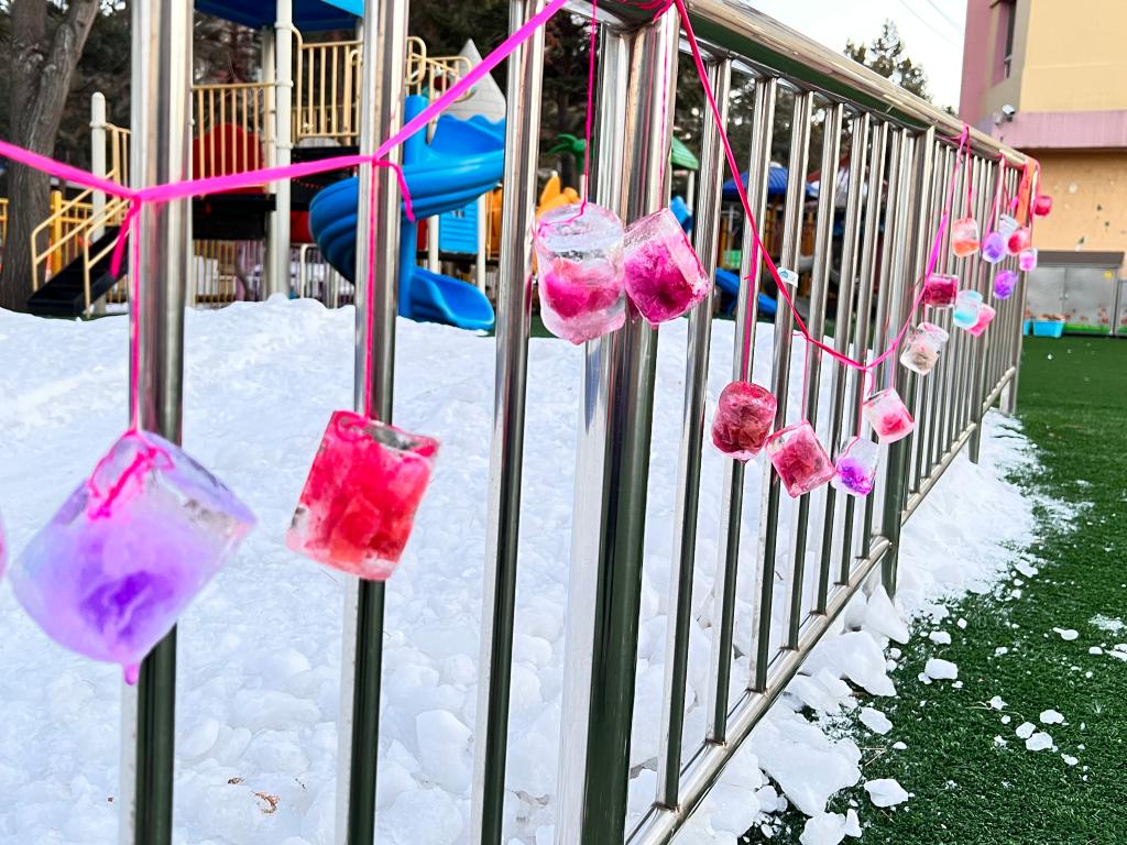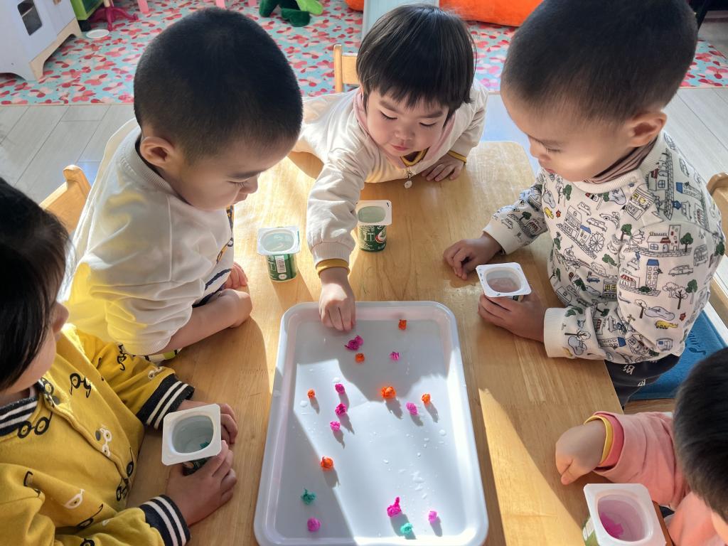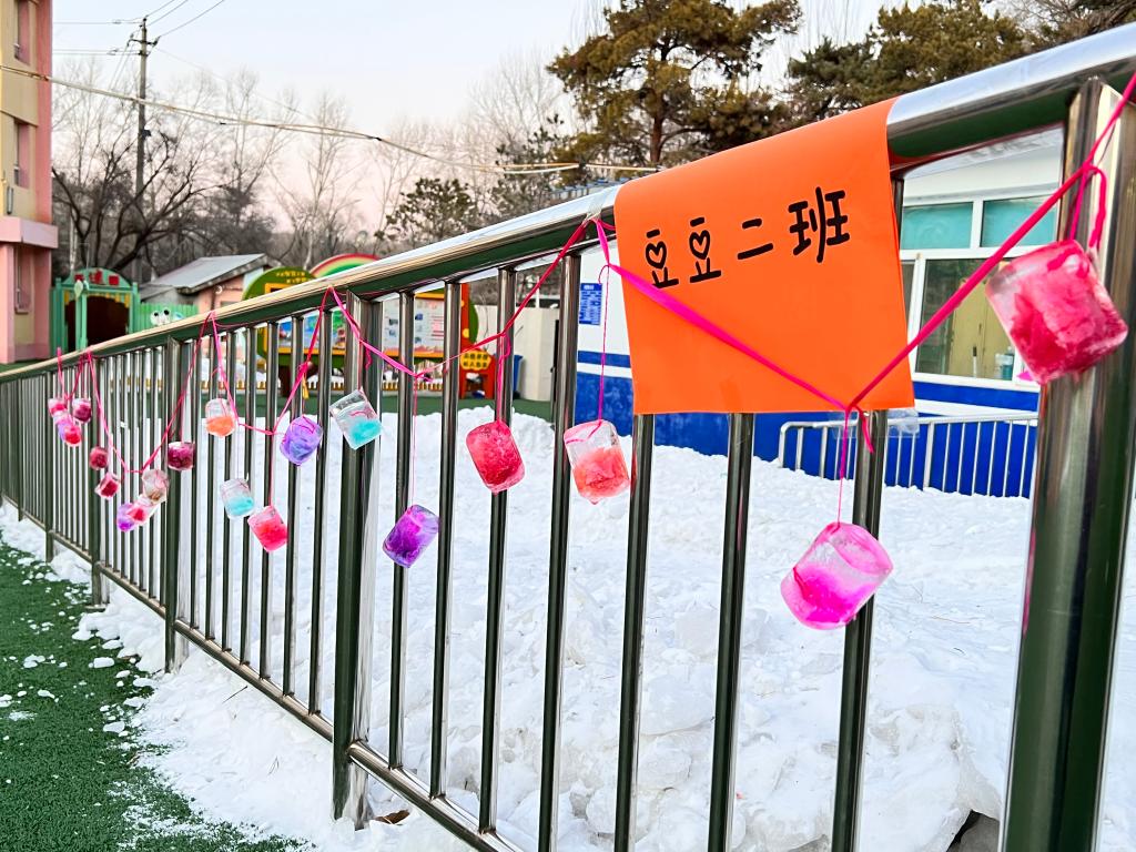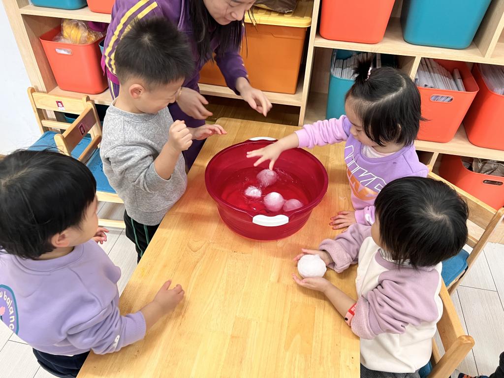 水是我们的好朋友,小朋友们喝完酸奶,老师将酸奶盒洗刷干净,在老师们的辅助下小朋友们自己动手团彩球,选择自己喜欢颜色的彩球放在酸奶盒里,经过寒冷的夜晚,五彩的冰花出现了!小朋友非常喜欢。
