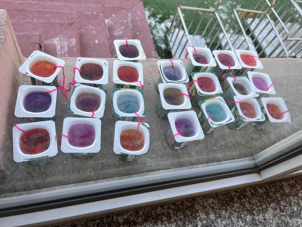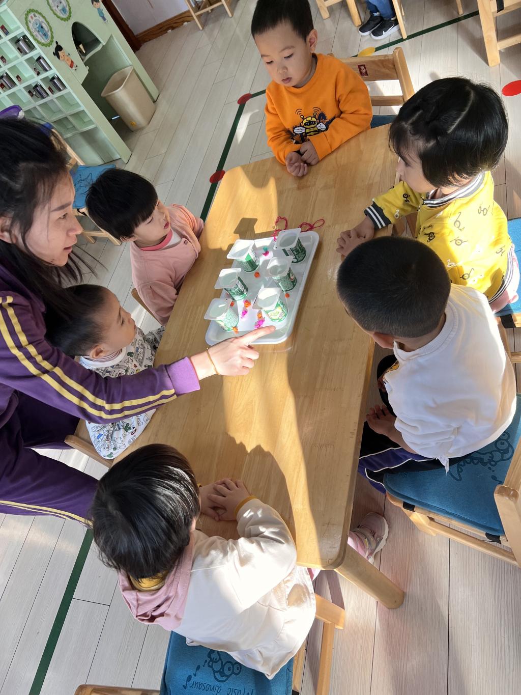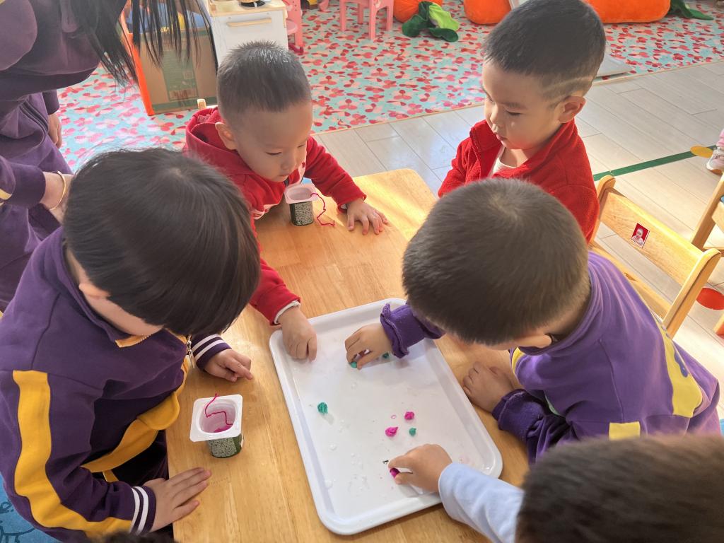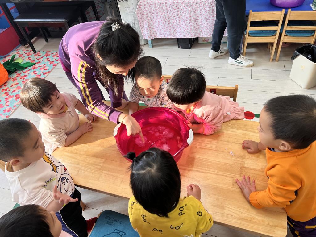 水是我们的好朋友,小朋友们喝完酸奶,老师将酸奶盒洗刷干净,在老师们的辅助下小朋友们自己动手团彩球,选择自己喜欢颜色的彩球放在酸奶盒里,经过寒冷的夜晚,五彩的冰花出现了!小朋友非常喜欢。