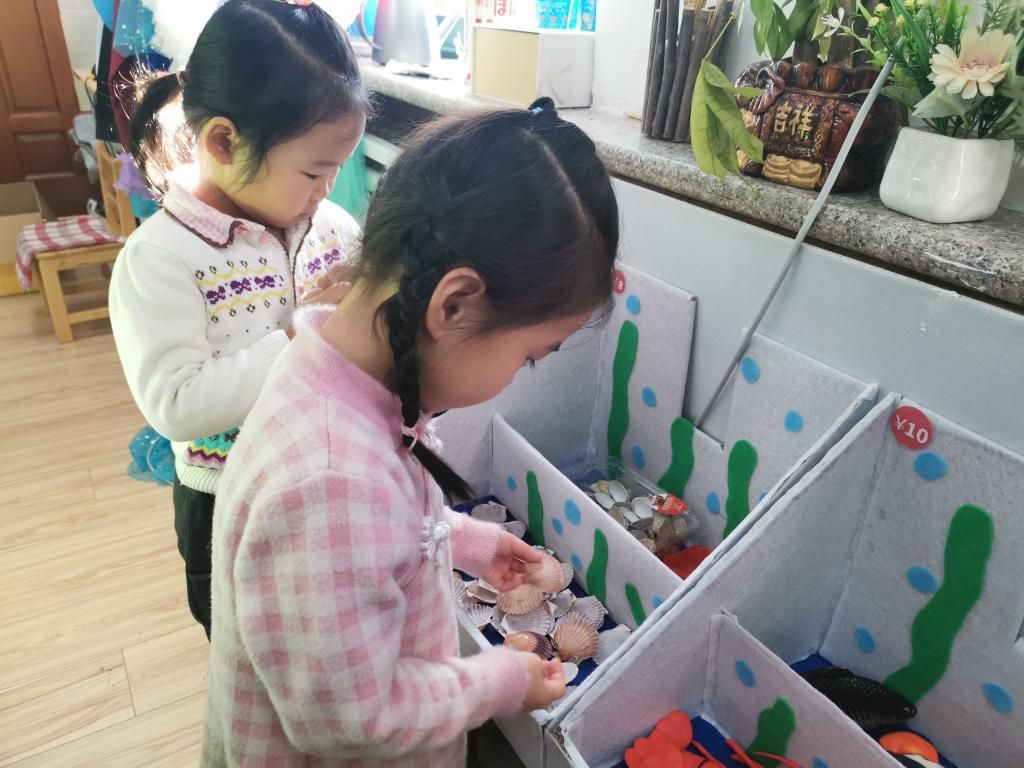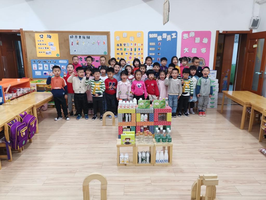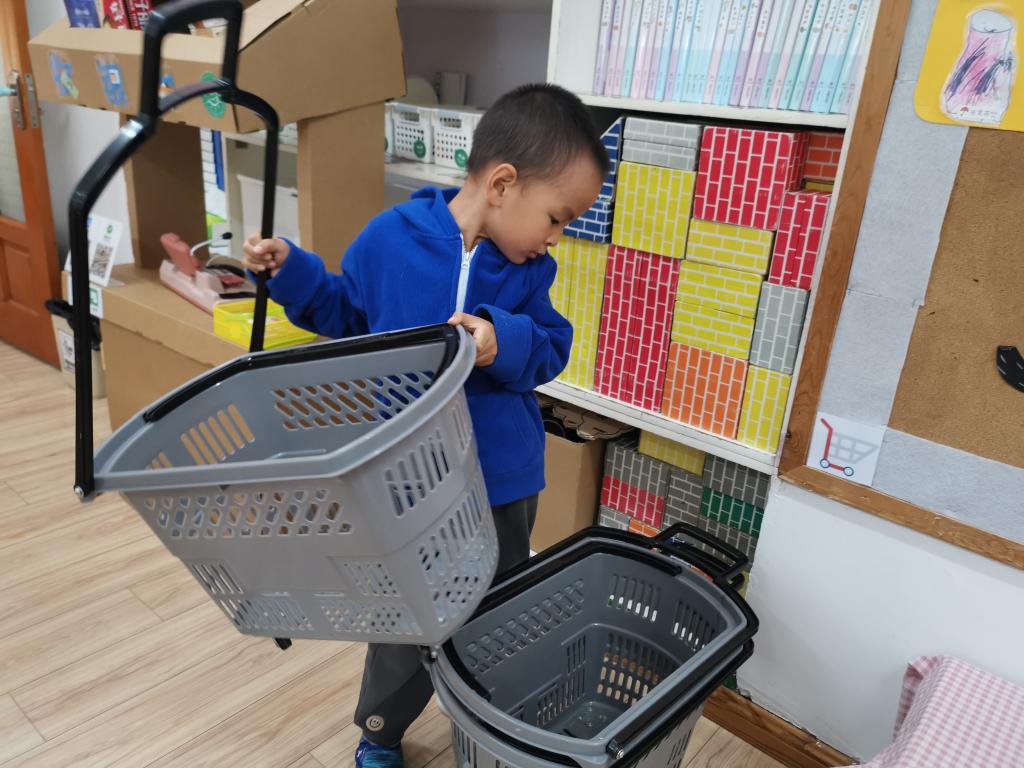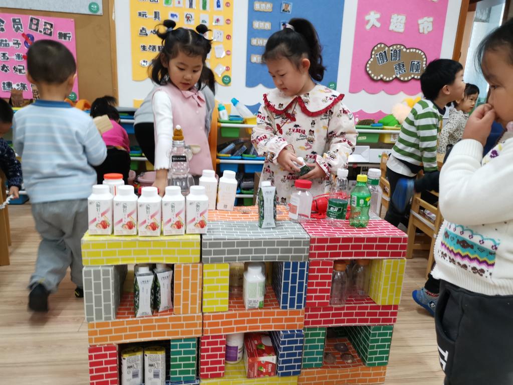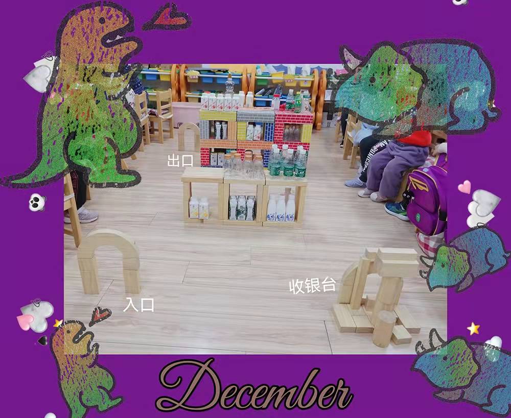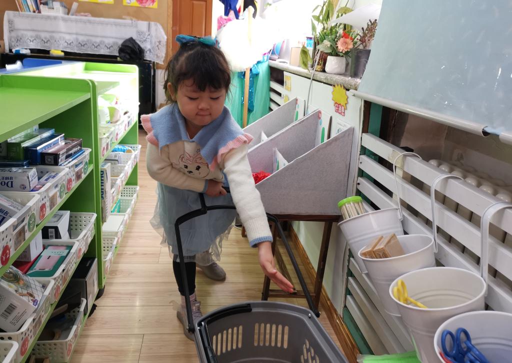 自班级区域“东师附幼大超市”建成以来,就深受朵朵四班小朋友们的喜爱。他们在区域中拖着购物篮,选购商品,收银台付款,每一项都井然有序的进行着,随着小朋友们生活经验的不断丰富,在经过多次的区域游戏后,小朋友们知道了超市的入口有存包处、有拿取购物车和购物篮的地方、超市内的商品是分区摆放在货架上、超市中有供顾客行走光顾的通道、超市还有结款的收银台。