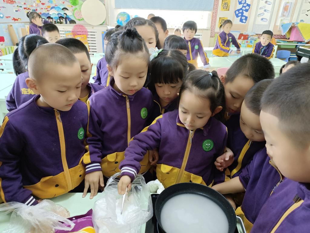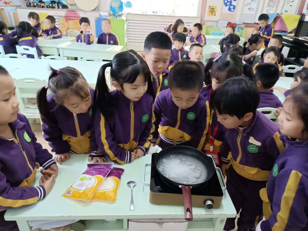 盼盼老师用筷子挑起一点糖液,迅速的放在提前准备好的凉水中,挡得严严实实,提出问题:“孩子们,你们猜筷子上的糖液会变成什么样?”“糖没了”,“糖和水混合在一起了”,“”孩子们各种猜想。