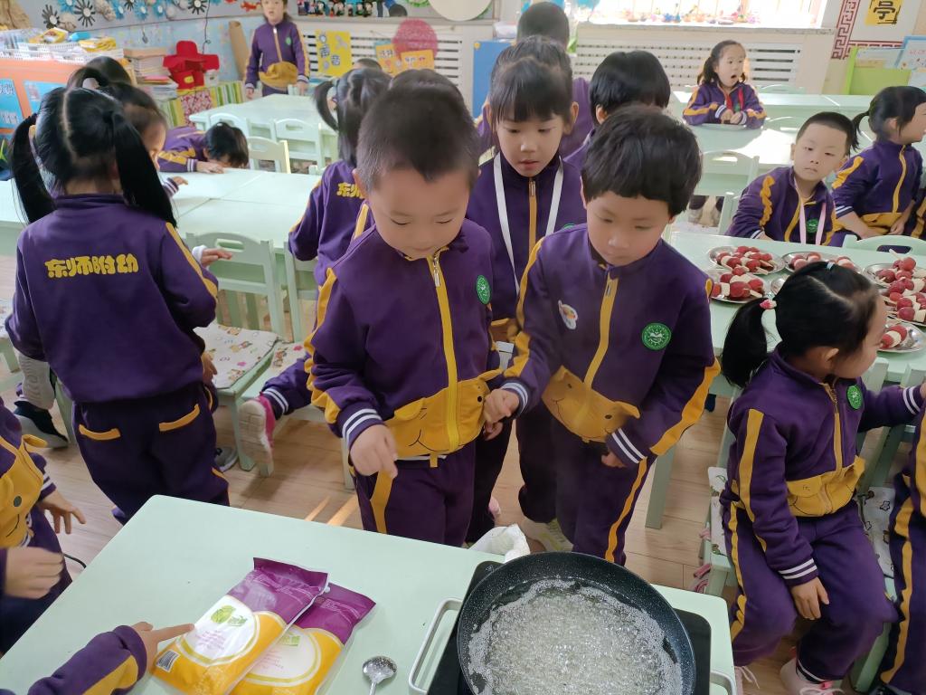 “快看快看,糖液的颜色更深了,好像浅棕色”,老师说,糖已经熬好了,我们可以给糖葫芦穿糖衣服了,小手捏着串串,老师帮忙在锅里转一转,山楂果就裹上了一身甜甜的外衣,糖葫芦做好了。