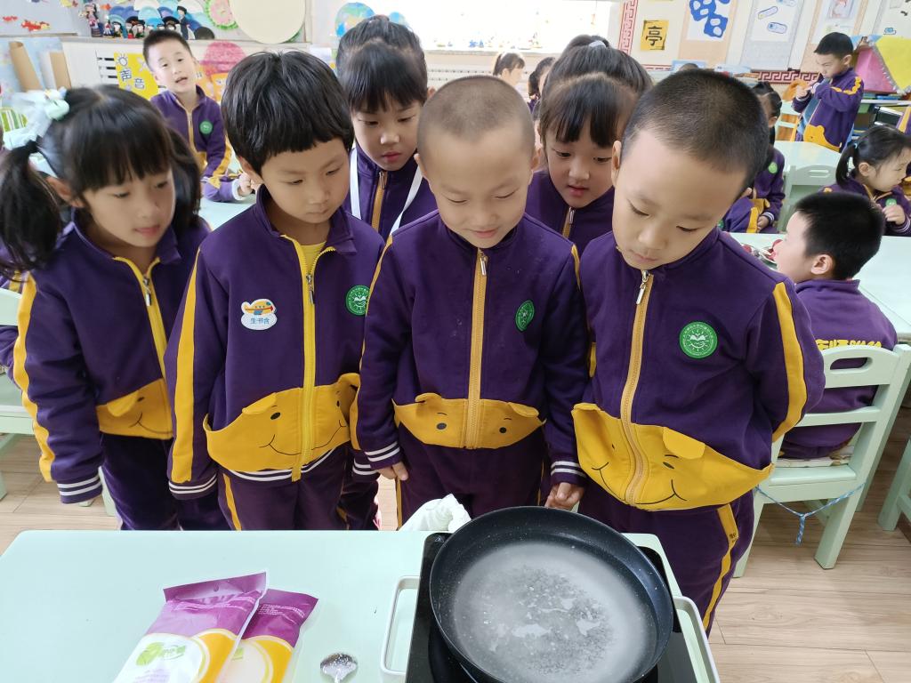 渐渐的,泡泡变得很多很多,有大的有小的,“老师,颜色变深了”“老师,怎么水不像之前那么多了?”“是呀是呀,水怎么越来越少了?”“孩子们,因为糖水混合物在加热的过程中,温度越来越高,水被蒸发了呀,留下的是糖浆”。