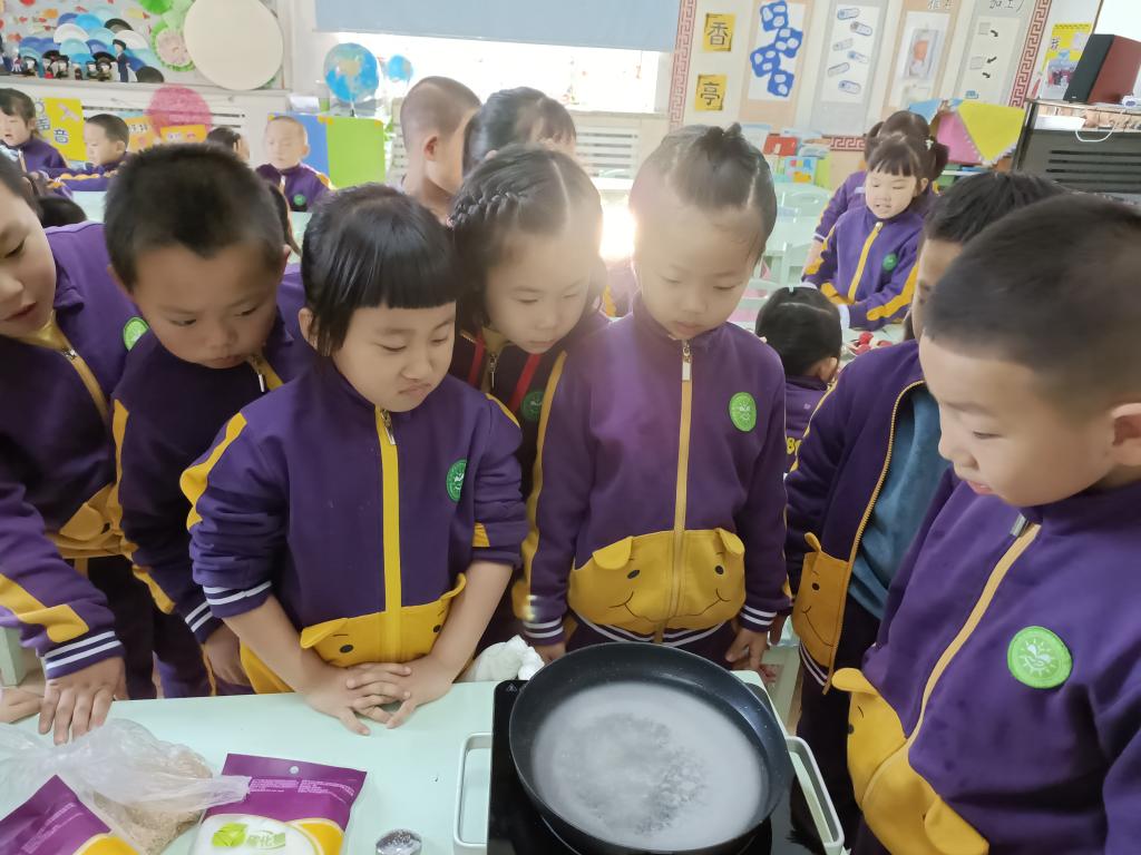 家长们提前为我们准备了锅、炉,一切准备就绪,接下来开始熬糖吧。看看,糖和水混合在一起,随着水温不断升高,糖融化了。越来越多的泡泡出现。