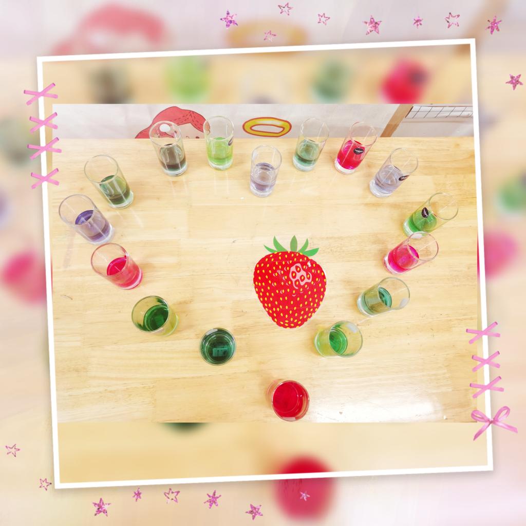 原来这些玻璃杯中分别装的是糖水、柠檬水、食醋水、小苏打水、雪碧水、白开水。这次科学小实验,让孩子们对“会变色的水娃娃”充满了好奇心,不仅在孩子的心里播种了科学启蒙的种子,激发了他们探索、求知的兴趣,也开启了他们对未知奇妙世界的探索之旅。
