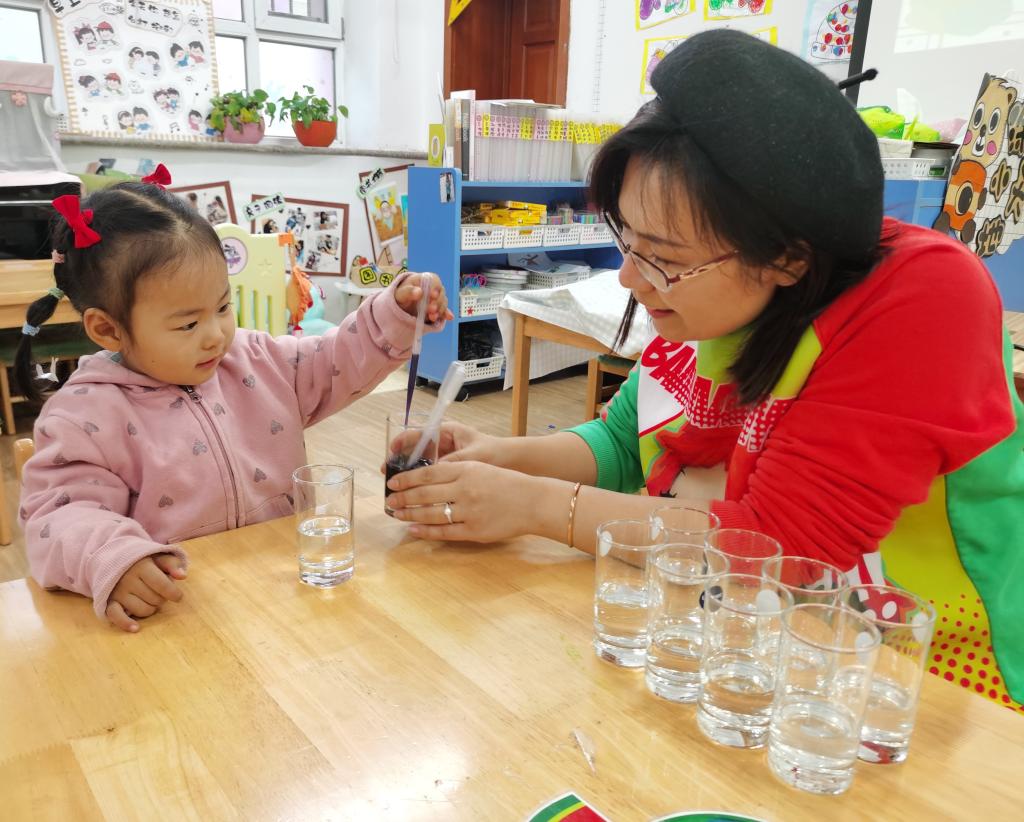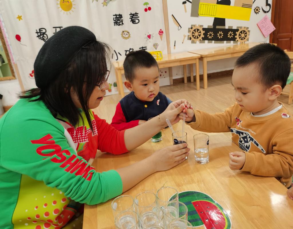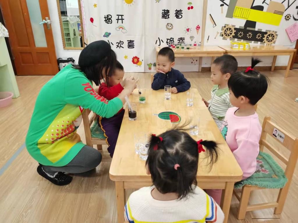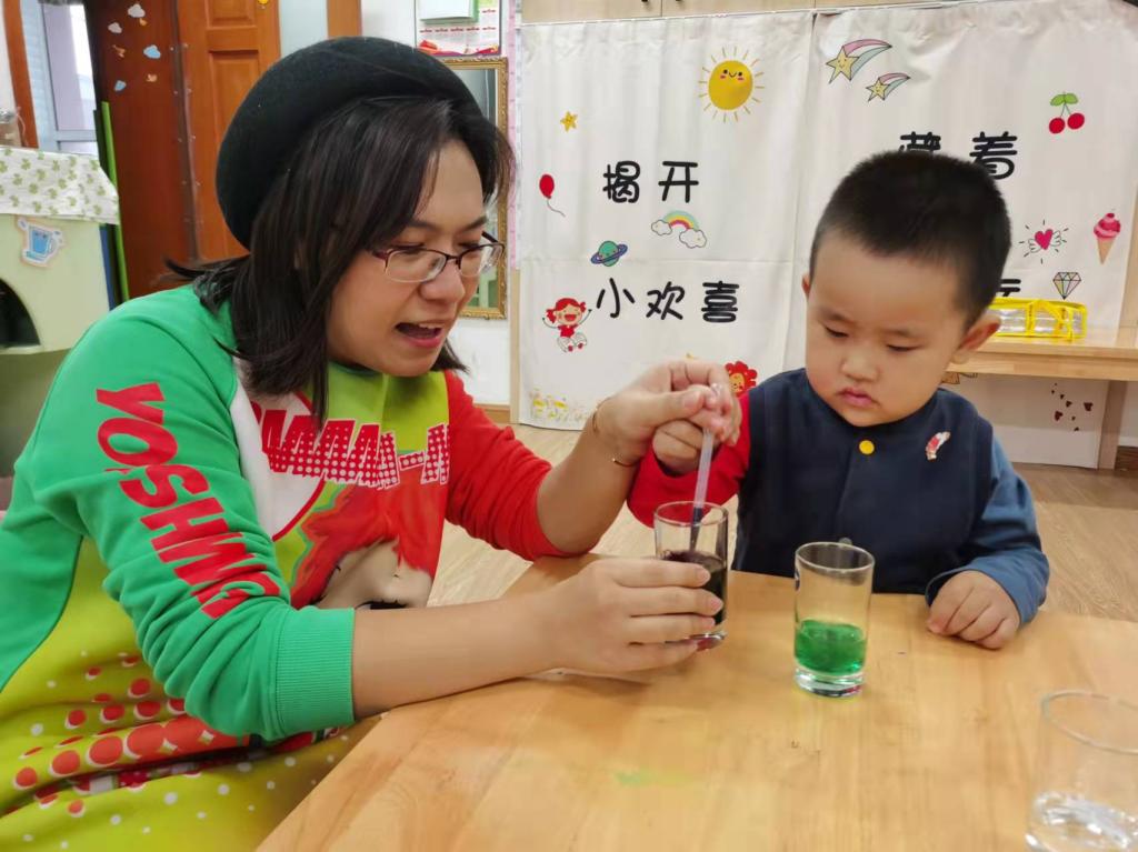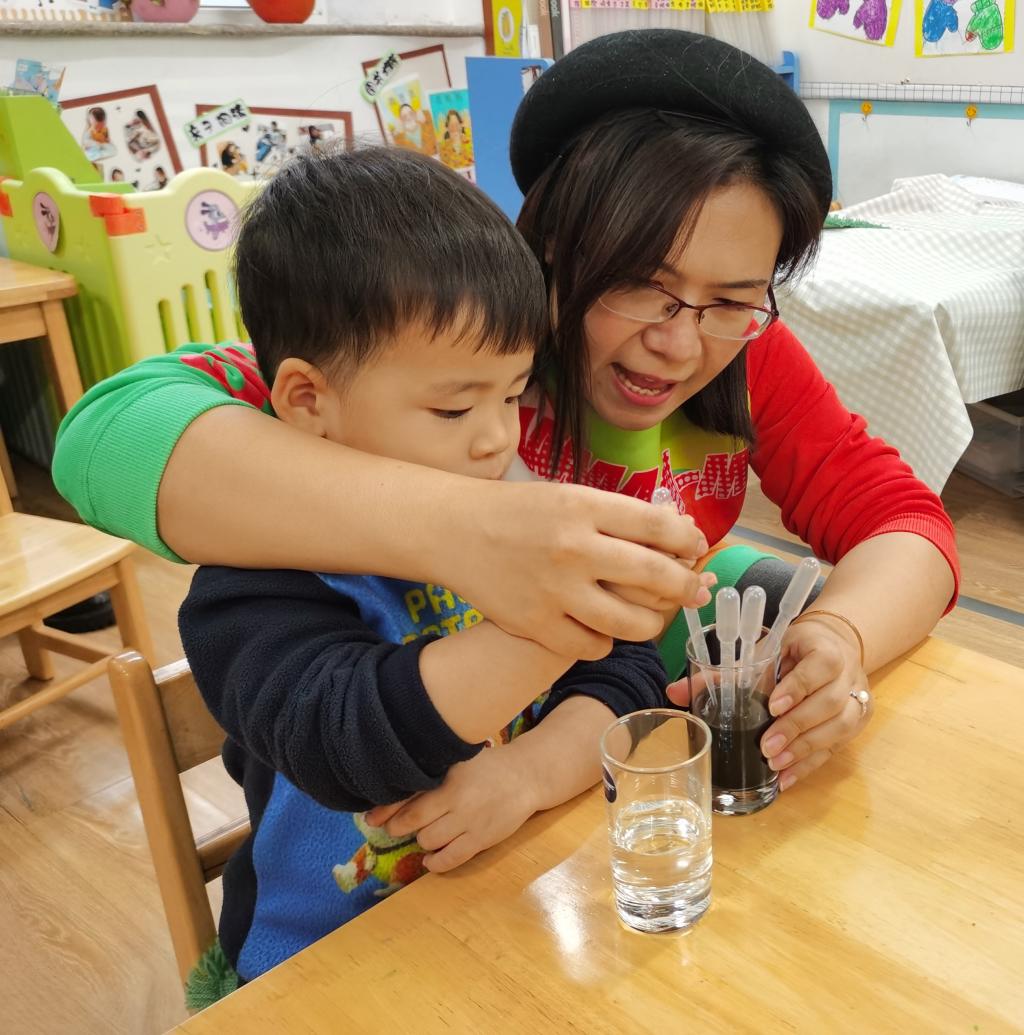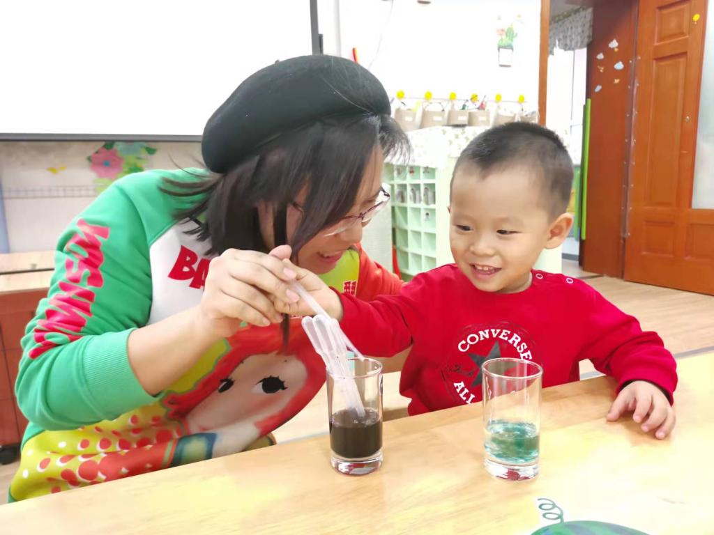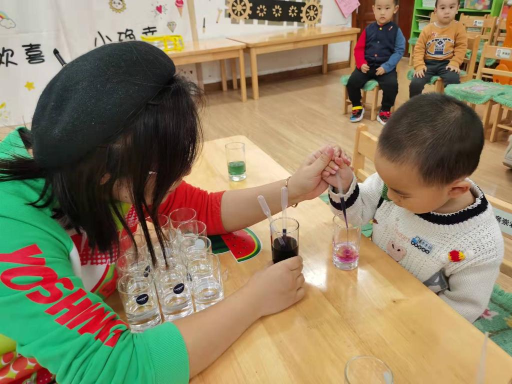 “这也太好玩了,”“我也想要试一试,”宝贝们一边观看一边站起来,都想要尝试这个神奇的魔术。孩子们轮流进行了化学魔术小实验,观察、亲身操作、感受着水娃娃变色。