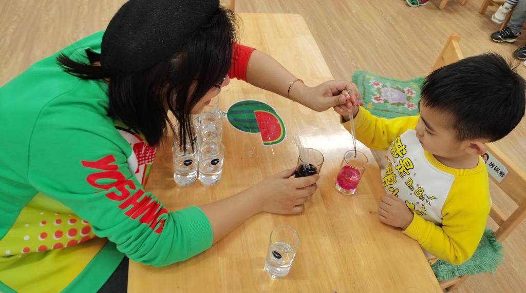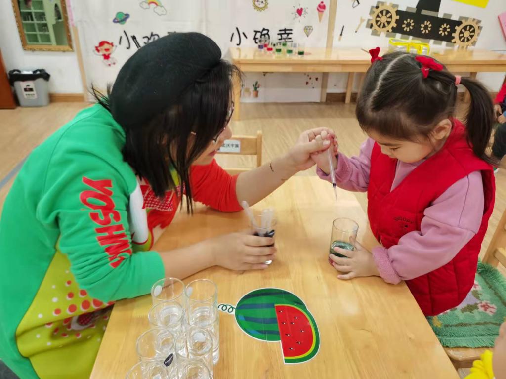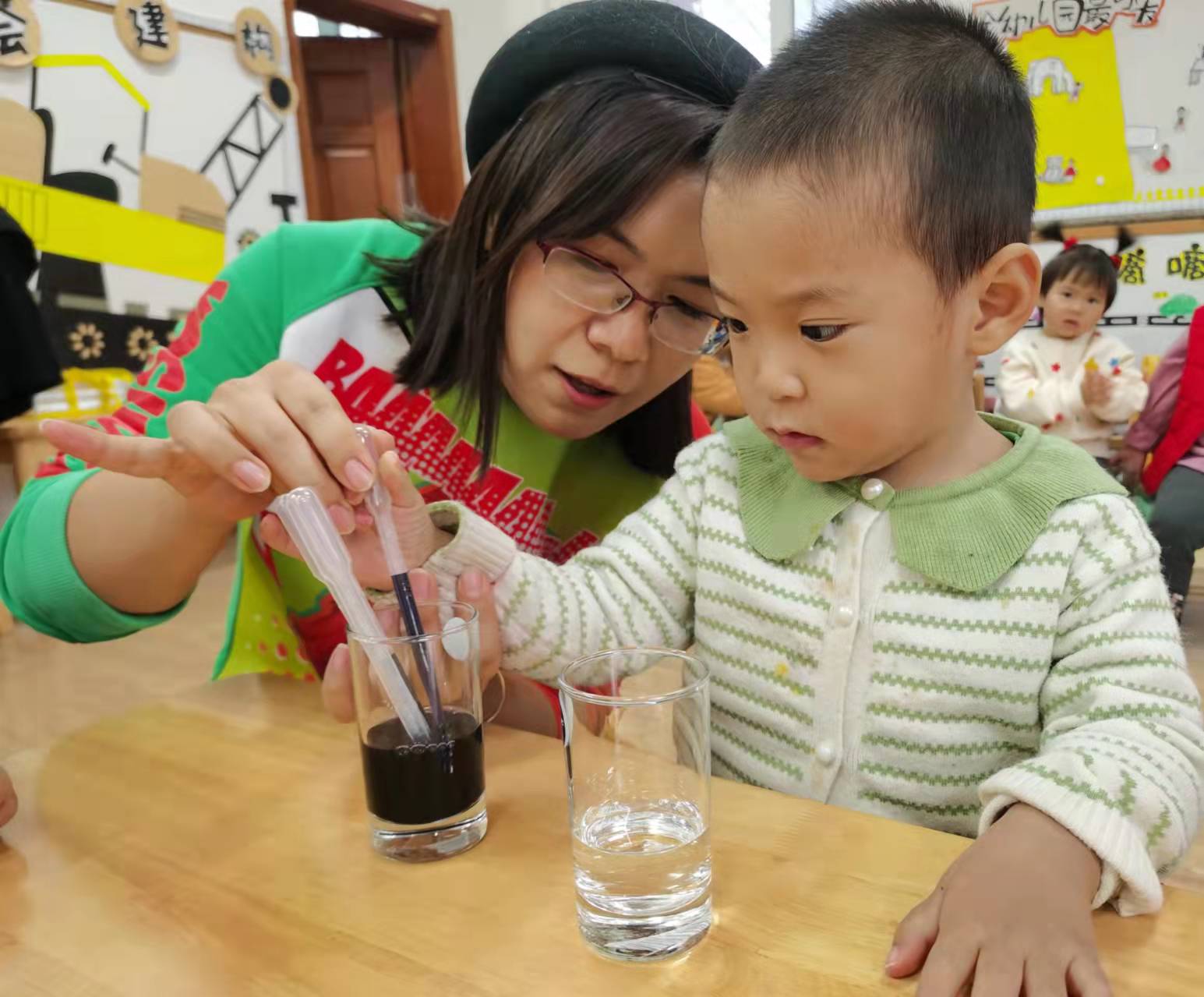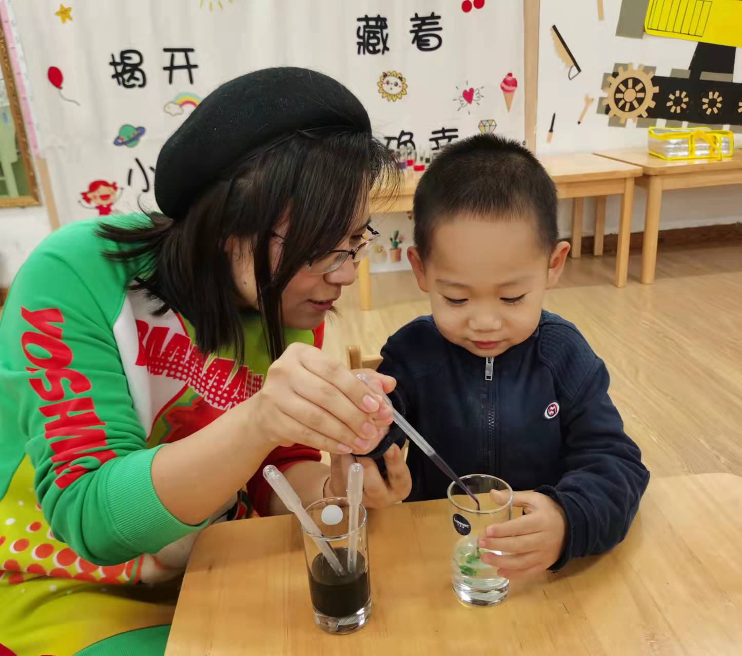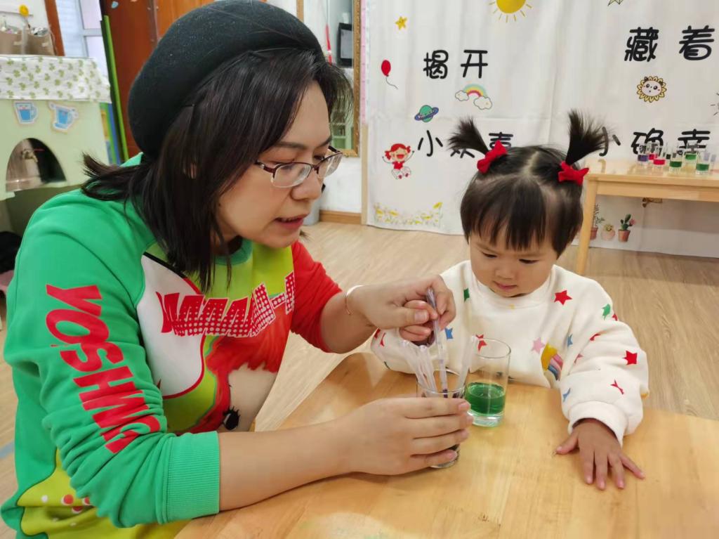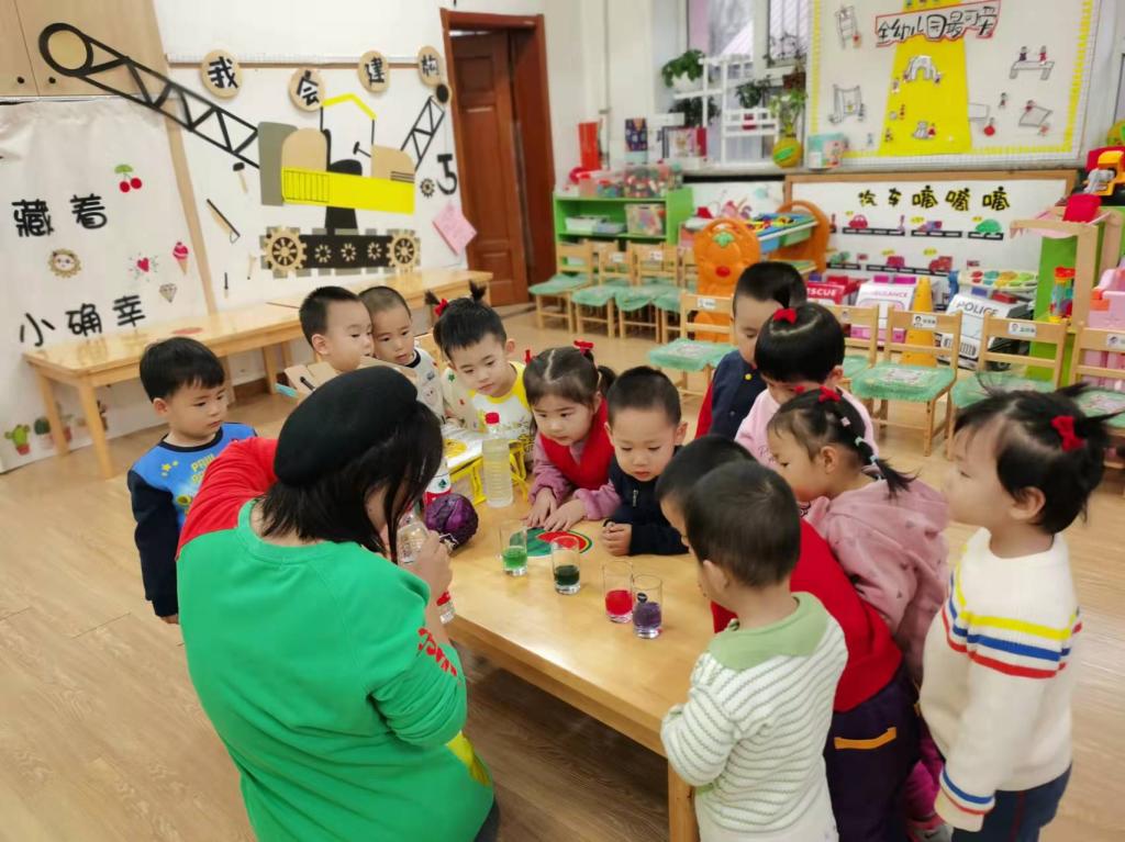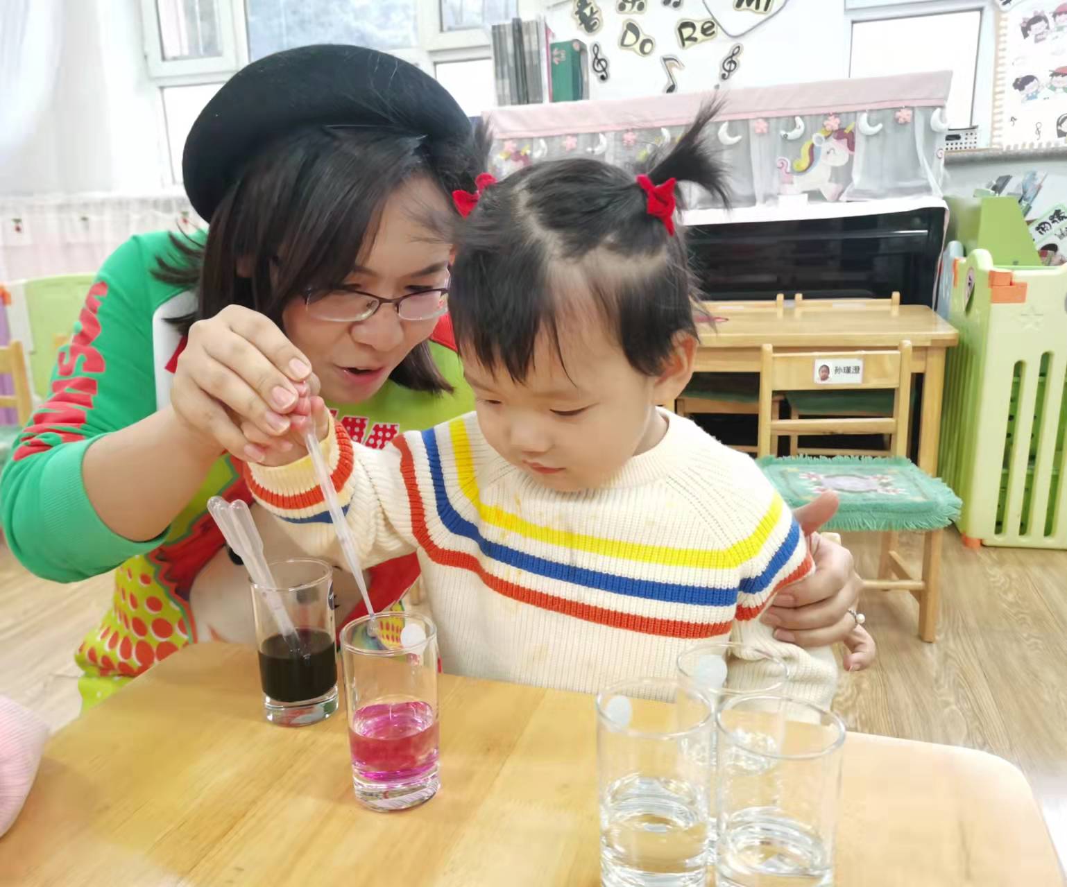 “这也太好玩了,”“我也想要试一试,”宝贝们一边观看一边站起来,都想要尝试这个神奇的魔术。孩子们轮流进行了化学魔术小实验,观察、亲身操作、感受着水娃娃变色。