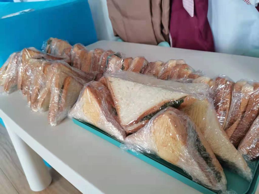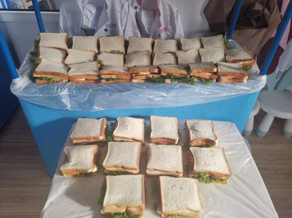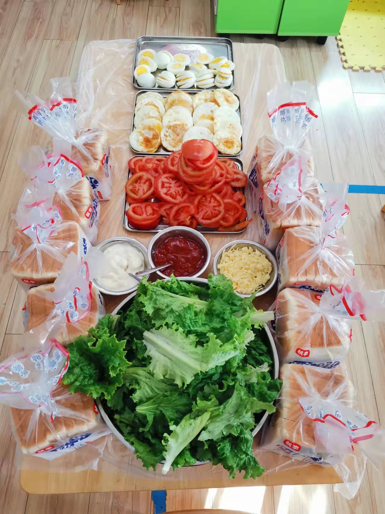 食材准备完毕。瞧!每一位宝贝都是制作三明治的小能手。他们先拿一片吐司面包,在面包上涂抹番茄酱和沙拉,再放上鸡蛋、西红柿和生菜,然后再用面包把它们夹起来。