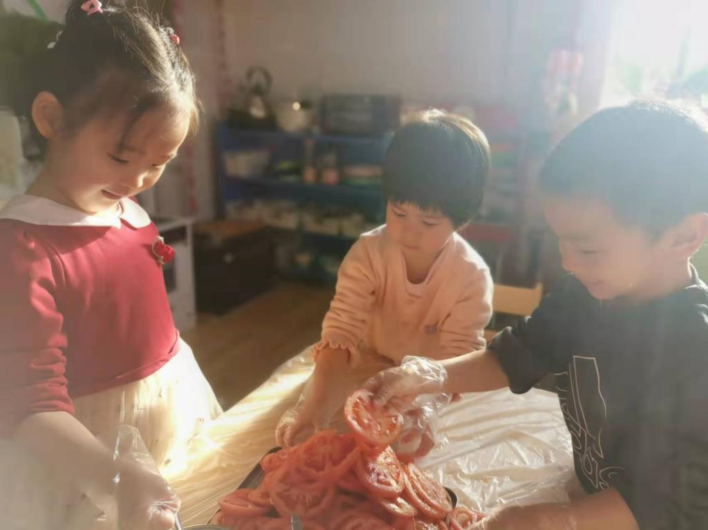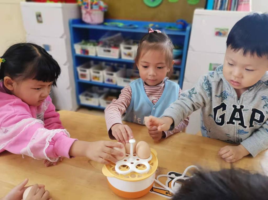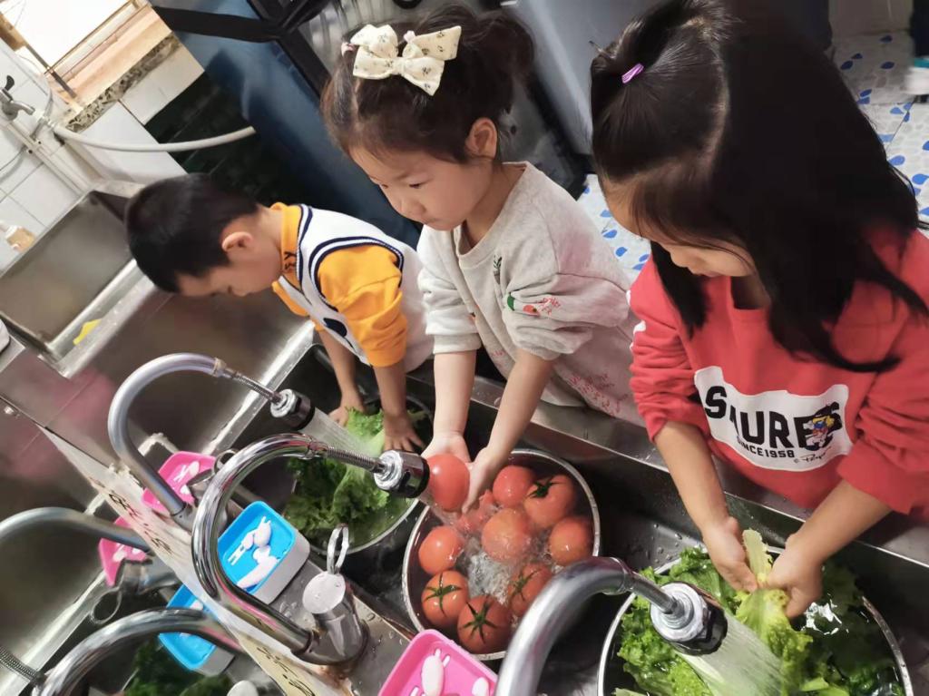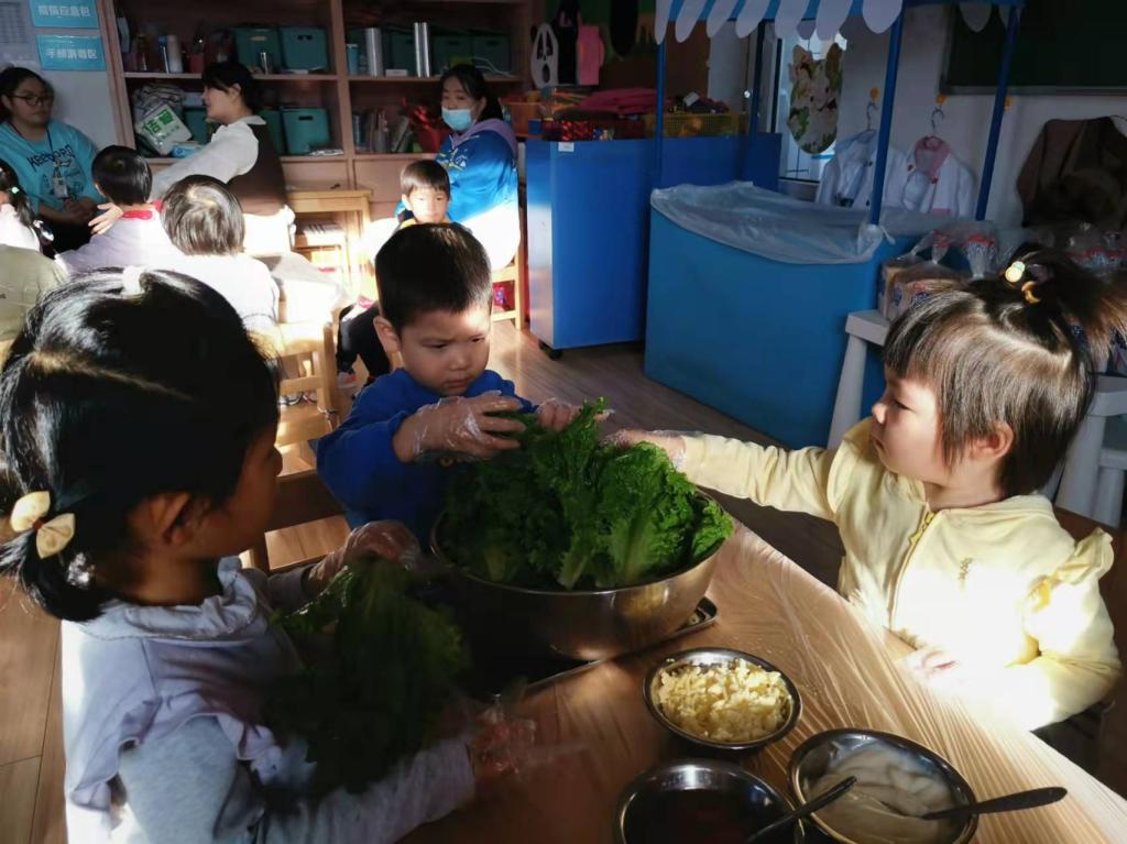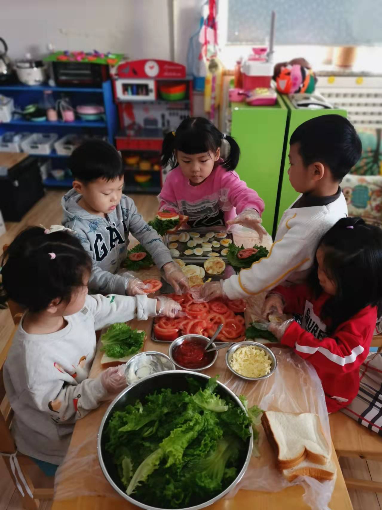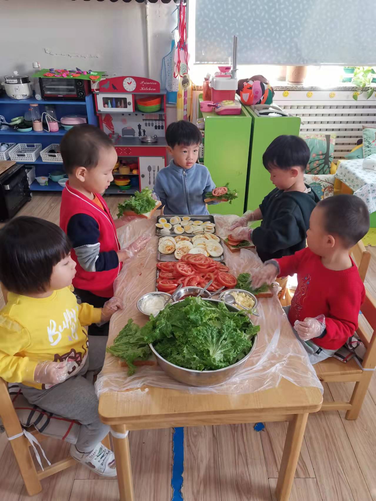这么多的食材要怎么入手呢?宝贝们一边动手一边开始思考,有的选择加工鸡蛋、有的选择清洗生菜、有的选择铺桌布、有的选择将加工好的食材装盘...每位宝贝都有自己的分工,前期的准备在有条不紊的进行着。