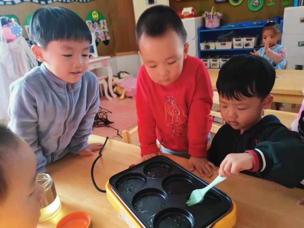 有的宝贝想吃热乎乎的三明治,于是把三明治进入烤箱进行烘烤,取出来时已经香气四溢啦!香香的味道让他们忍不住凑上小鼻子闻一闻,老师帮助宝贝们将三明治切开,放在小盘子里。
