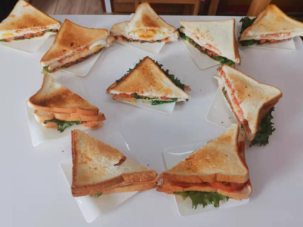 制作前,老师先通过展示三明治的外形特征,为幼儿讲解并示范三明治的制作方法,小朋友们个个垂涎欲滴,张着小嘴直呼“我也要试一试”“我最爱吃三明治啦”“哇,我要吃两块”...老师还为宝贝们准备了一些丰富的食材:吐司、鸡蛋、生菜、西红柿、沙拉酱、番茄酱、芝士...