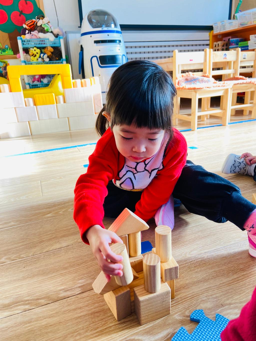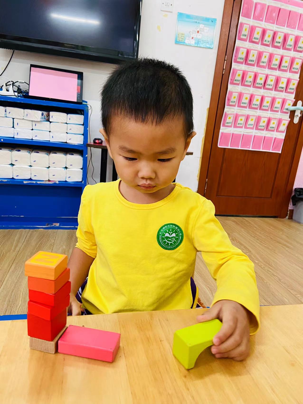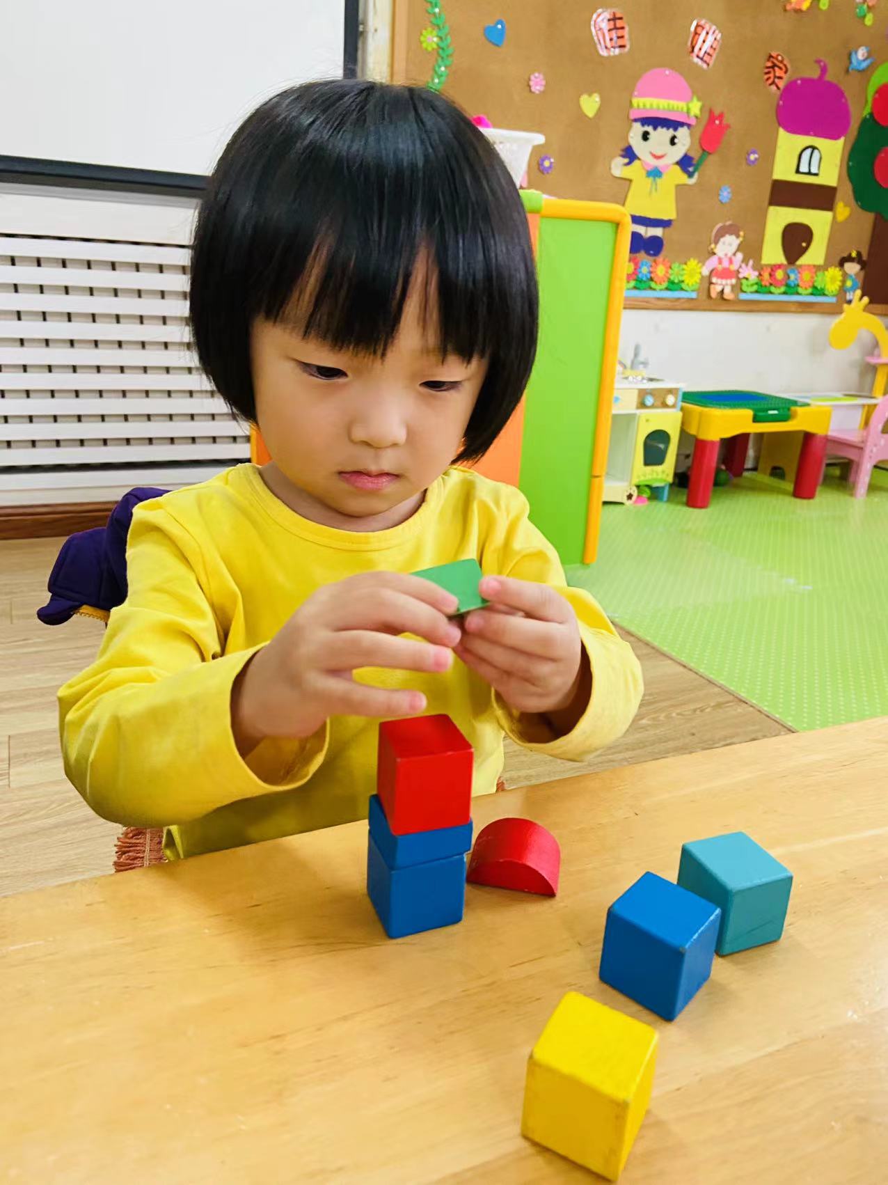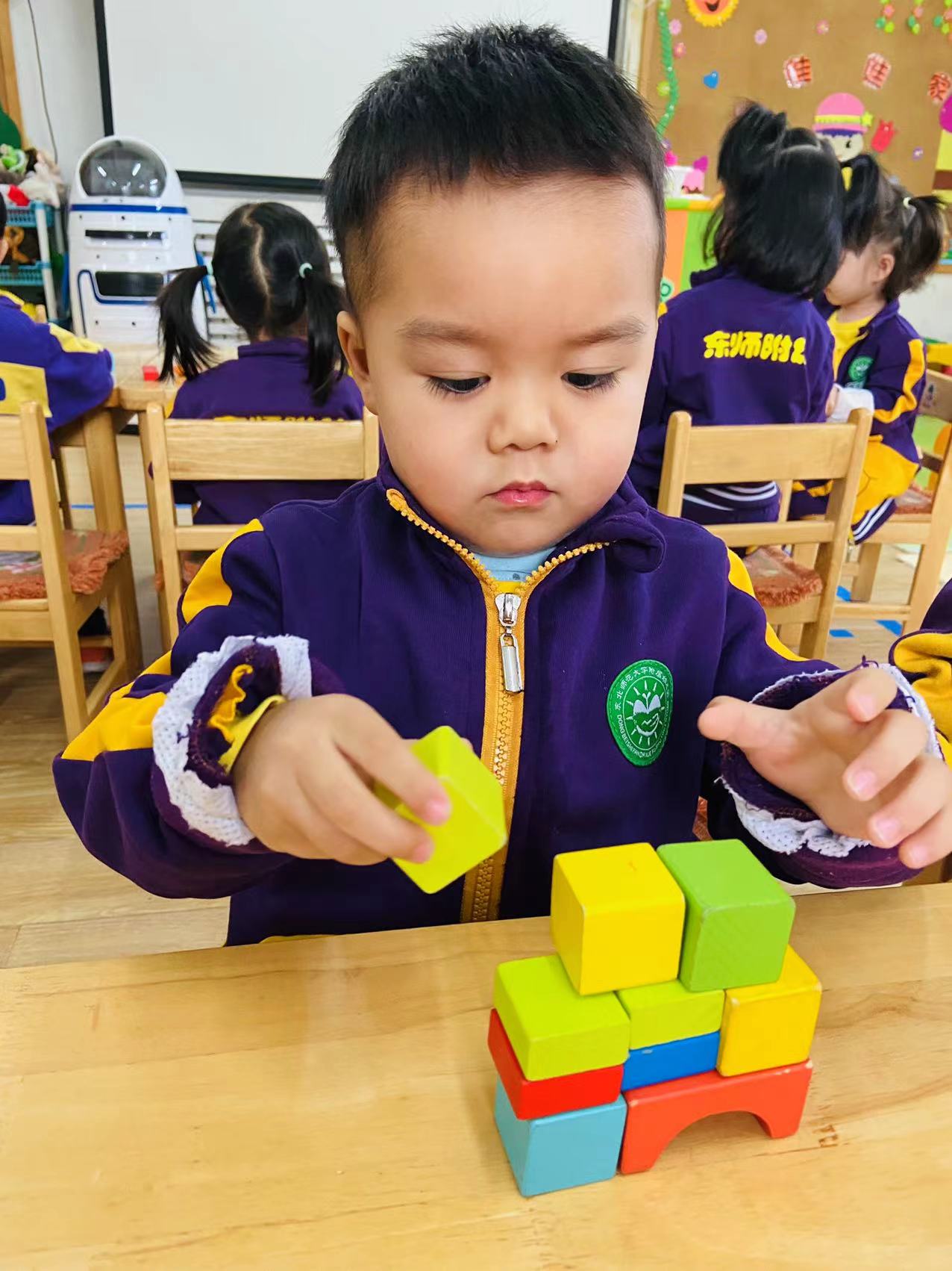 通过小朋友们的不断练习和尝试,我们开始准备合作搭建新房子了,在材料的选择上,多数的小朋友们更喜欢彩色积木,因此大家决定将它作为房子的主要材料。大家一同合作,有的小朋友在认真将大块积木利用平铺的方式摆在桌面上,而有的小朋友则拿起小块的积木向上垒高。