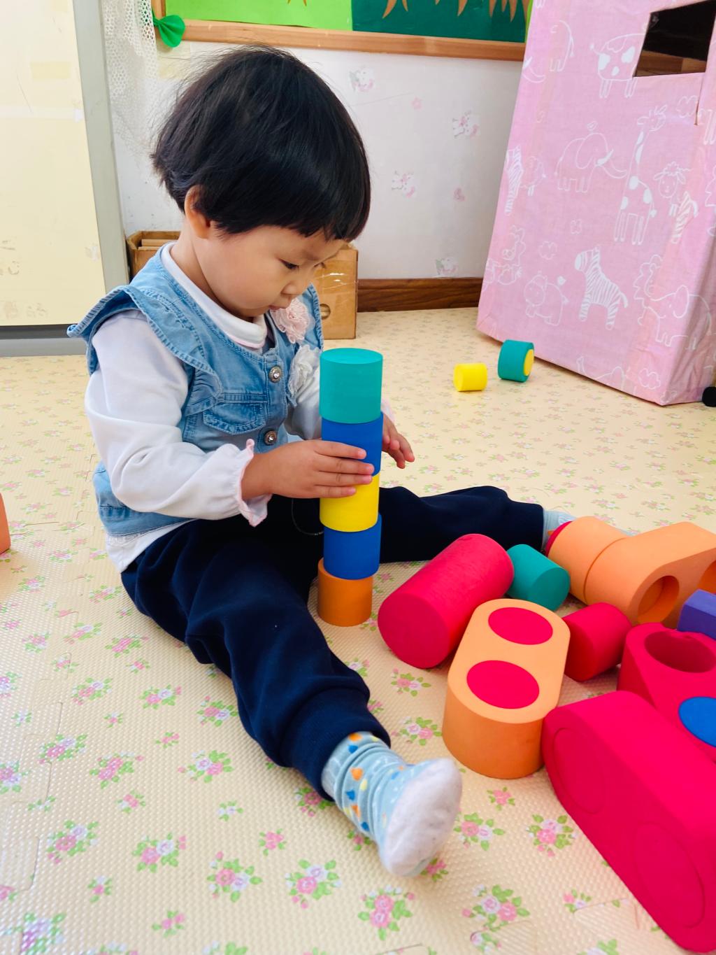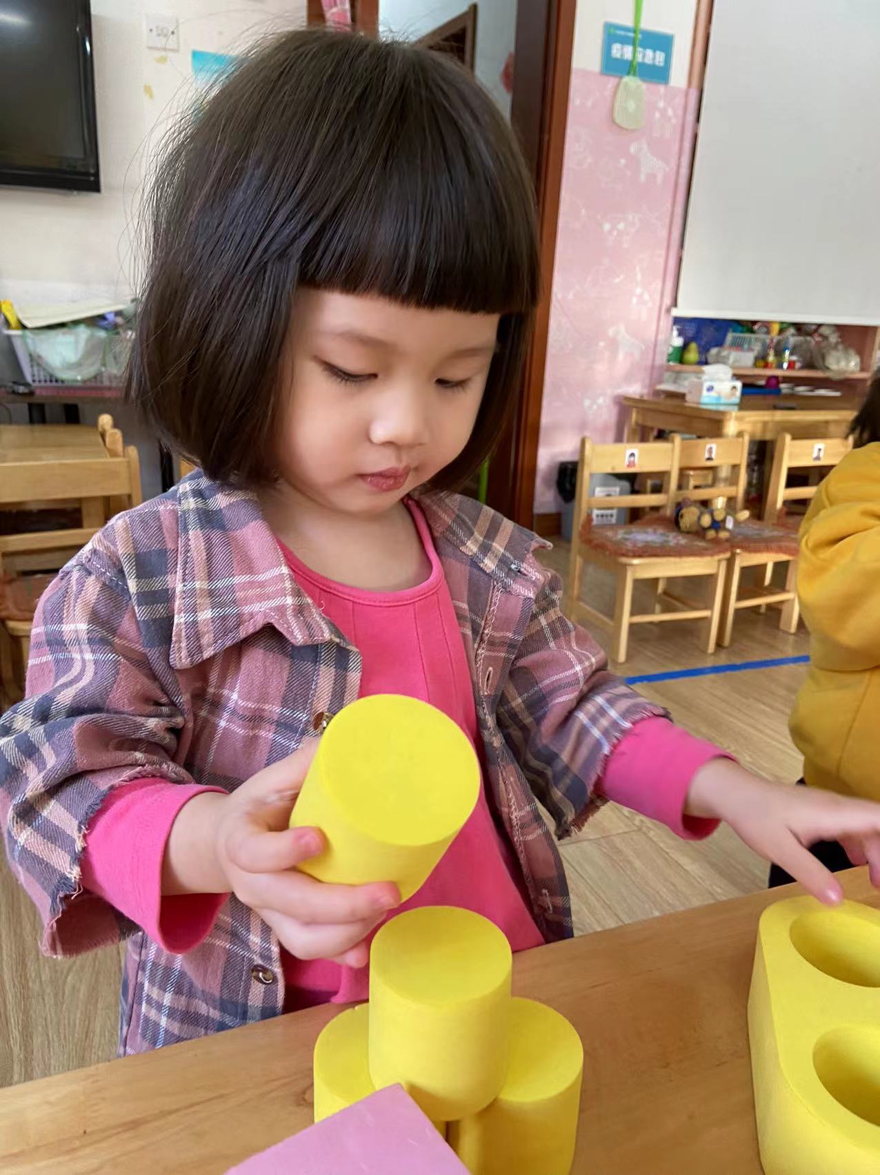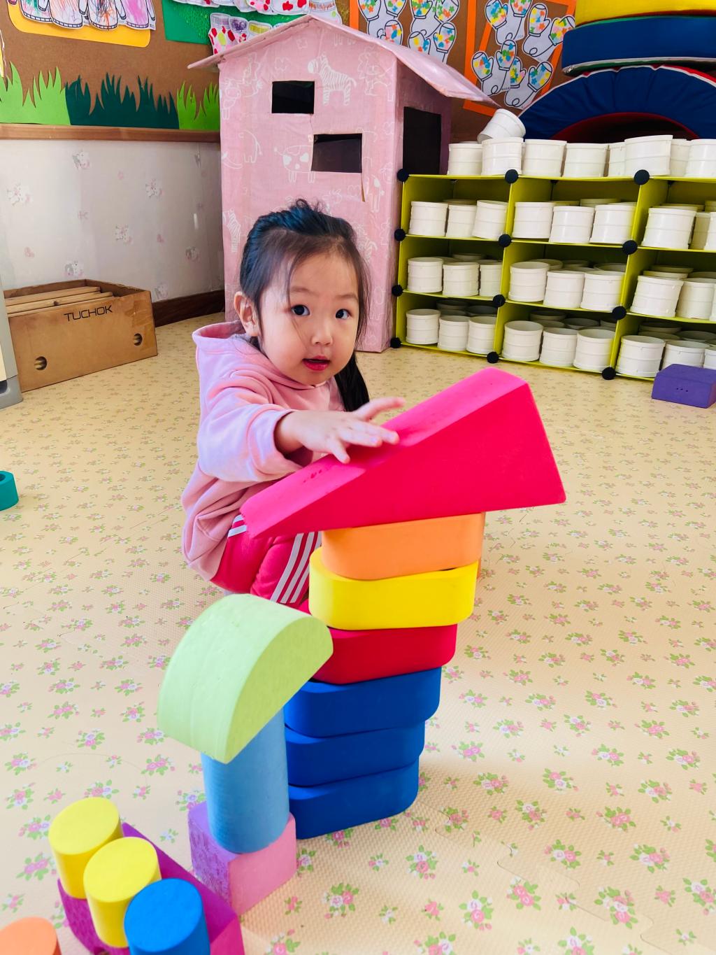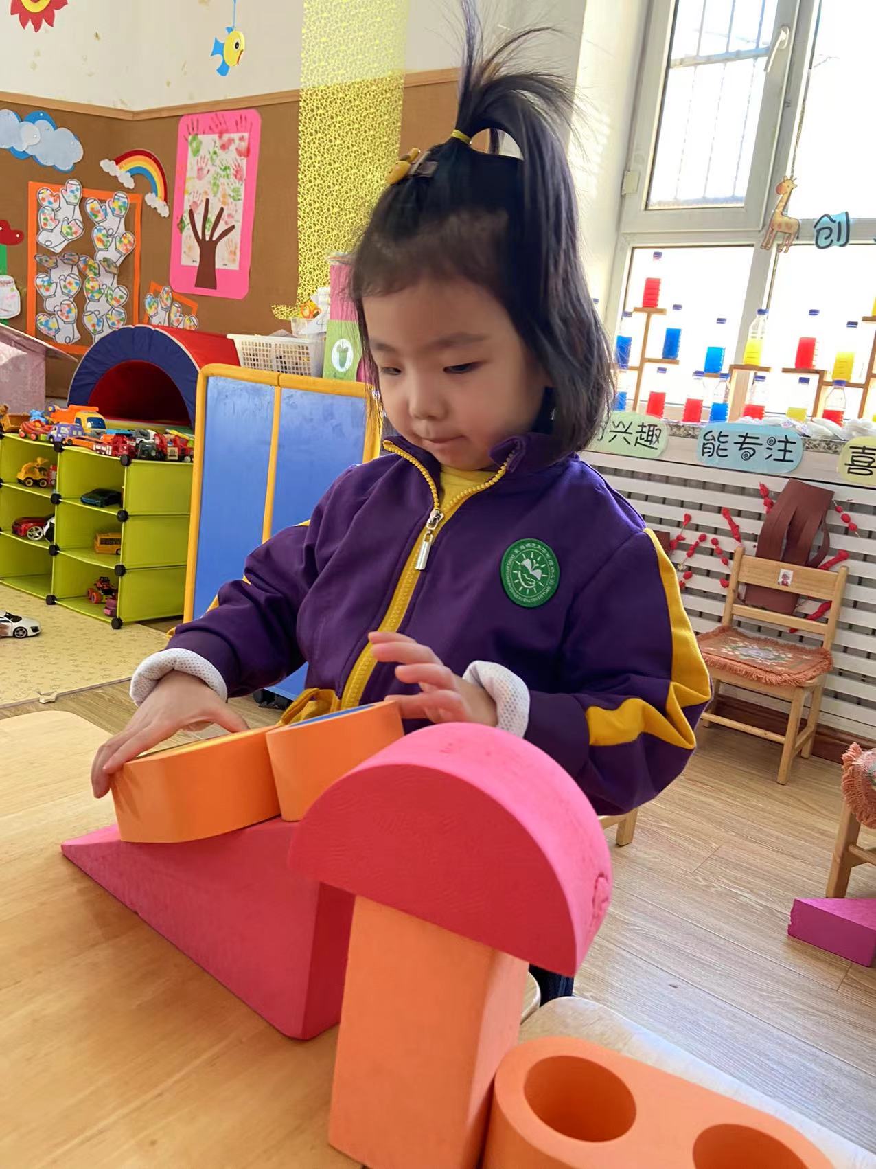 不同的年龄段要提供适宜班级幼儿的建构材料,小小班幼儿的小肌肉发展较弱,为了培养幼儿的搭建兴趣,满足成功感,我们在建构区提供了大中型积木,并配有少量的小型积木,以及可以激发幼儿搭建兴趣的彩色泡棉积木等材料。