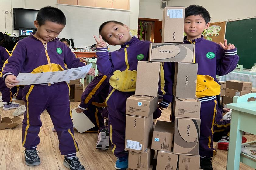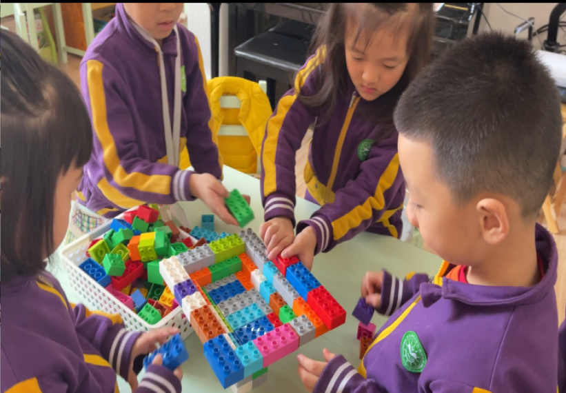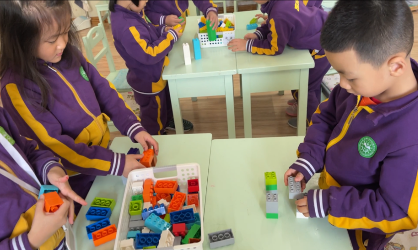 可纸盒只适合搭建底部,一旦搭到上部阶梯递增结构,就很容易倒,更不可能搭建出上部逐层递增的形状。通过实践操作,孩子们发现要想搭建出上部的阶梯递增结构,必须使用能够连结在一起且稳定性好的材料,大家不约而同想到了乐高。