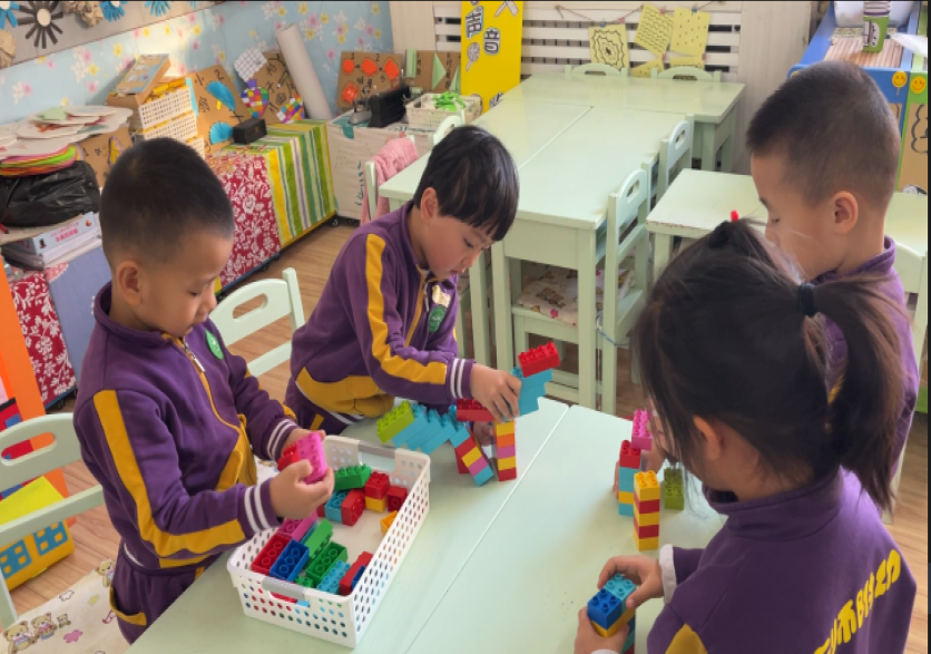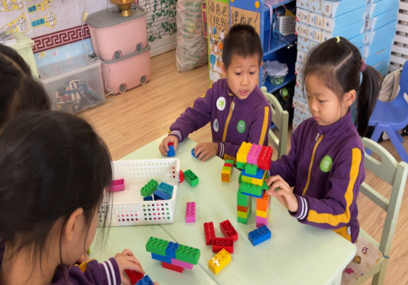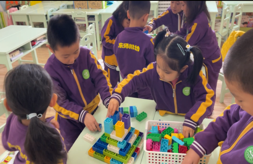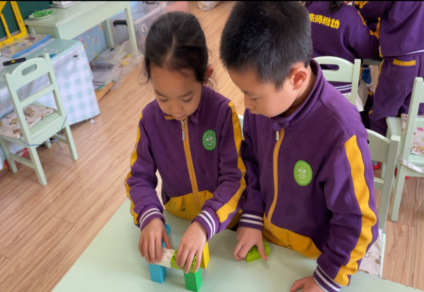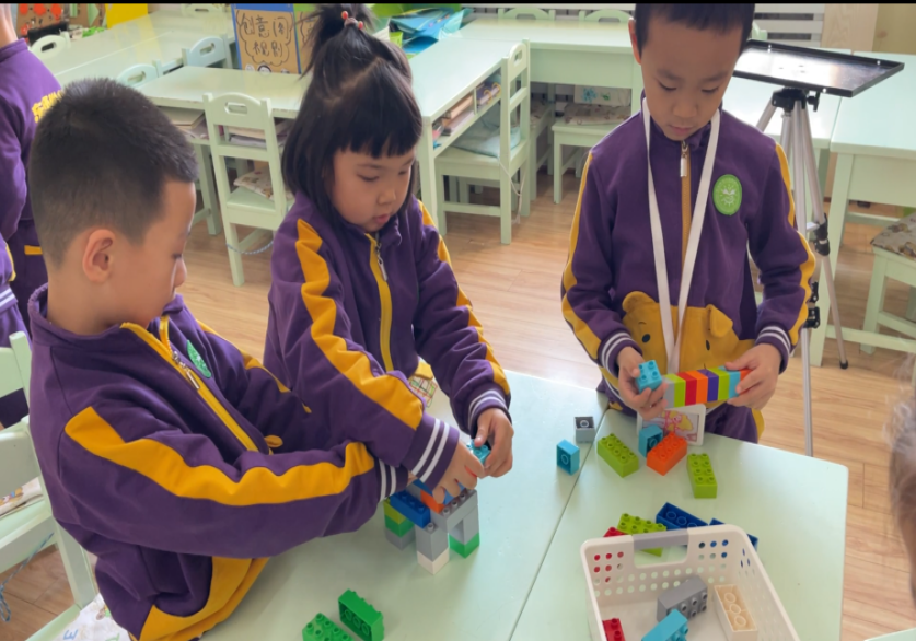 在一次次重新尝试的过程中,孩子们不气馁、不互相埋怨,始终专注游戏、解决问题,终于发现了将错位互锁结构和阶梯递增结构相融合的搭建技巧。