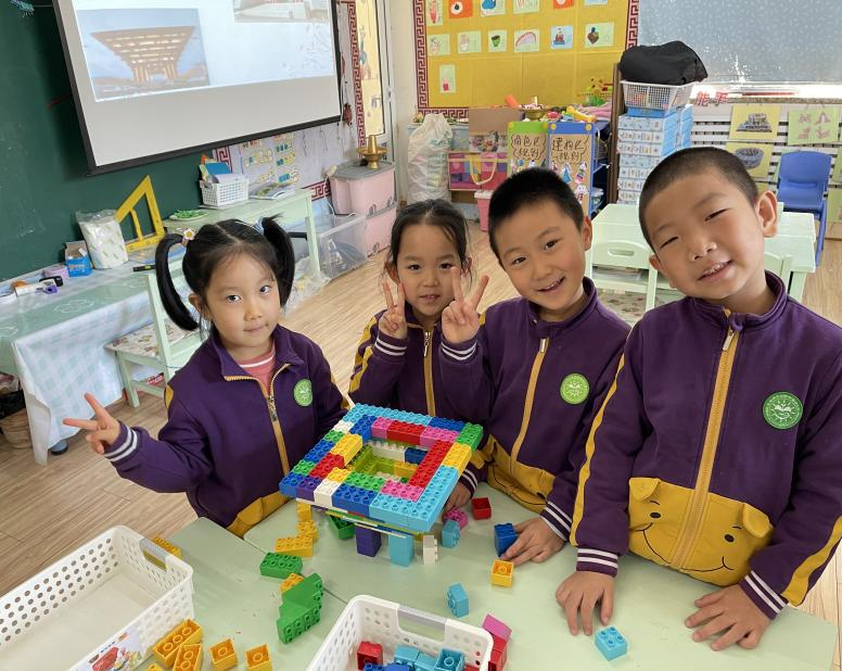 本次主题建构活动,我们将科学领域和社会领域的目标相融合,一方面引导鼓励和支持幼儿用不同材料进行建构游戏并找到适合自己搭建主题的材料,一方面帮助幼儿在物体与几何形体之间建立联系。通过这种幼儿喜闻乐见和易于理解的游戏方式,小朋友们在活动中能与同伴分工合作,遇到困难一起克服。小朋友们也了解到反映中国人聪明才智的中国馆的设计内涵和文化以及世博会的相关内容。小朋友们在搭建中国馆的过程中,民族自豪感和对祖国的热爱之情也被激发,为自己是中国人深深感到自豪。孩子们充分体现出东师附幼小朋友“有兴趣,能专注,喜探究,愿合作”的学习品质,正可谓“玩、学、乐在其中”,童心搭建、创意无限。