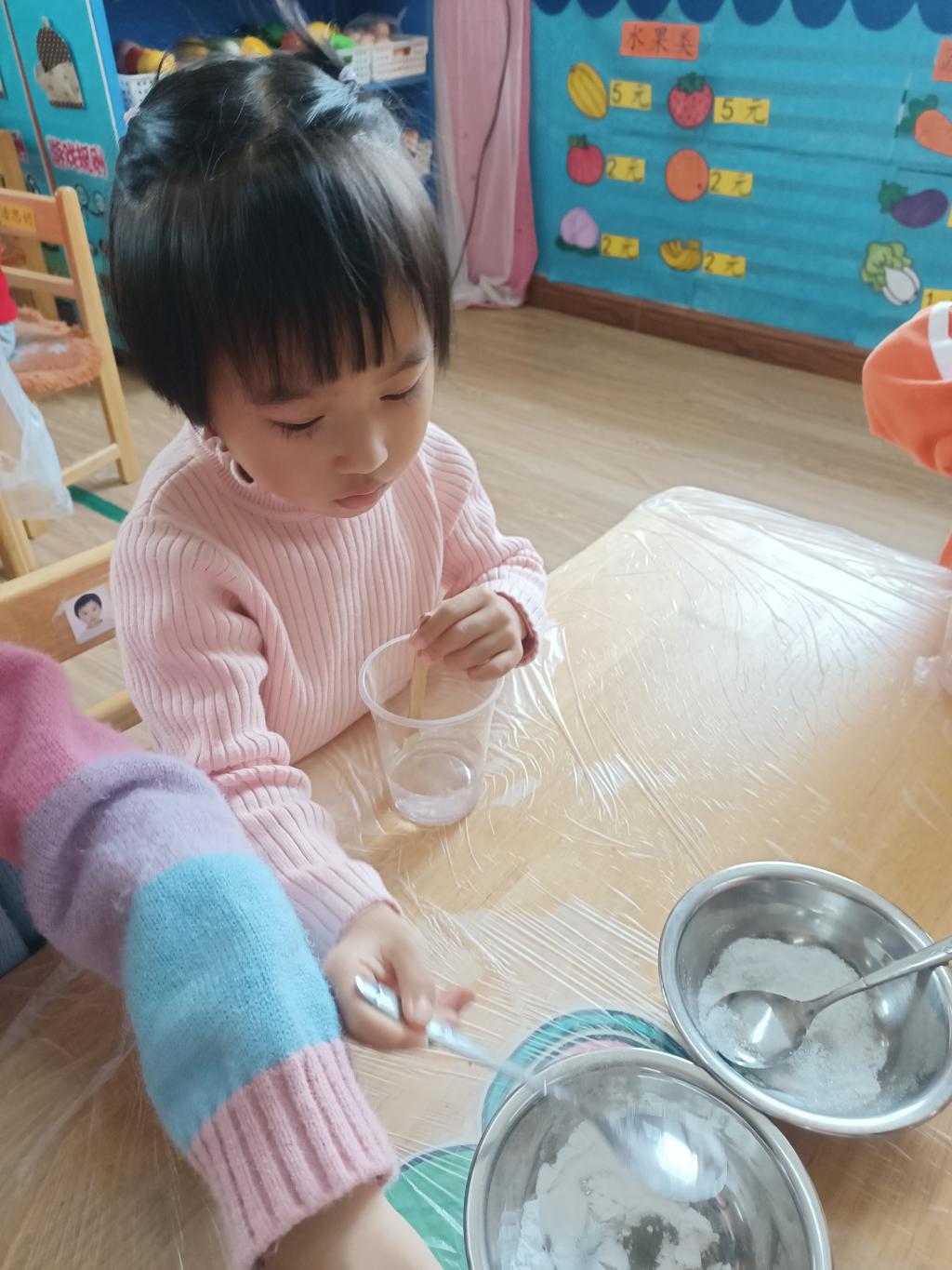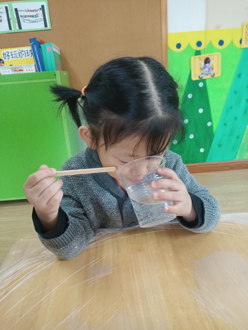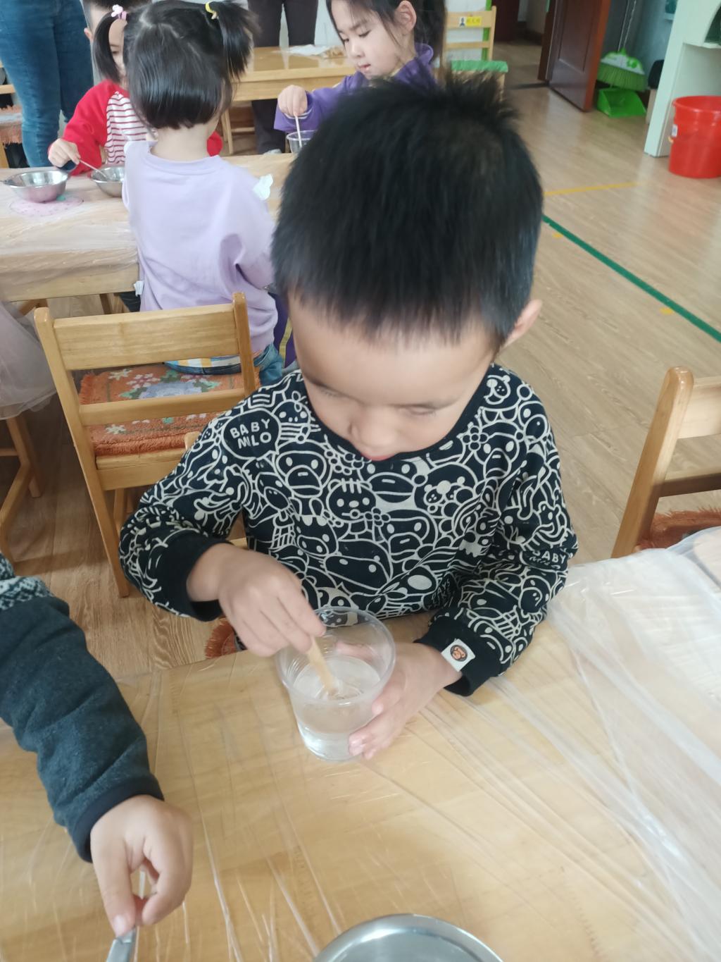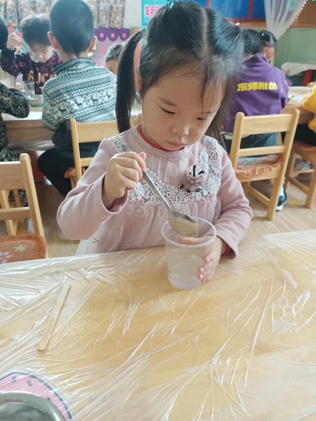 小朋友们开始动手操作啦!大家将面前的三种材料一点儿一点儿地加入到杯中,每次加完都会进行搅拌。搅拌之后,观察到水中产生气泡了,就开始品尝。
