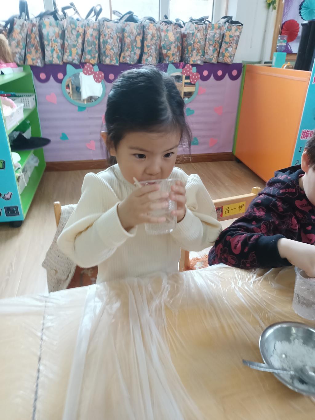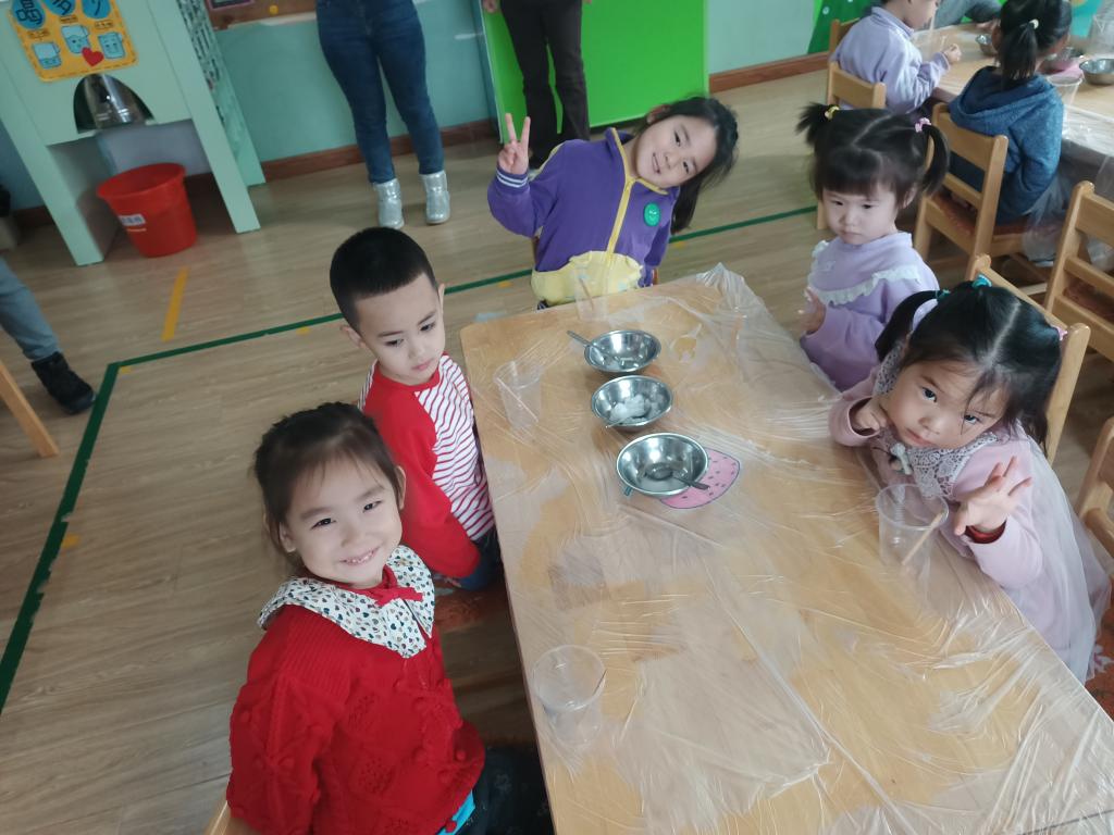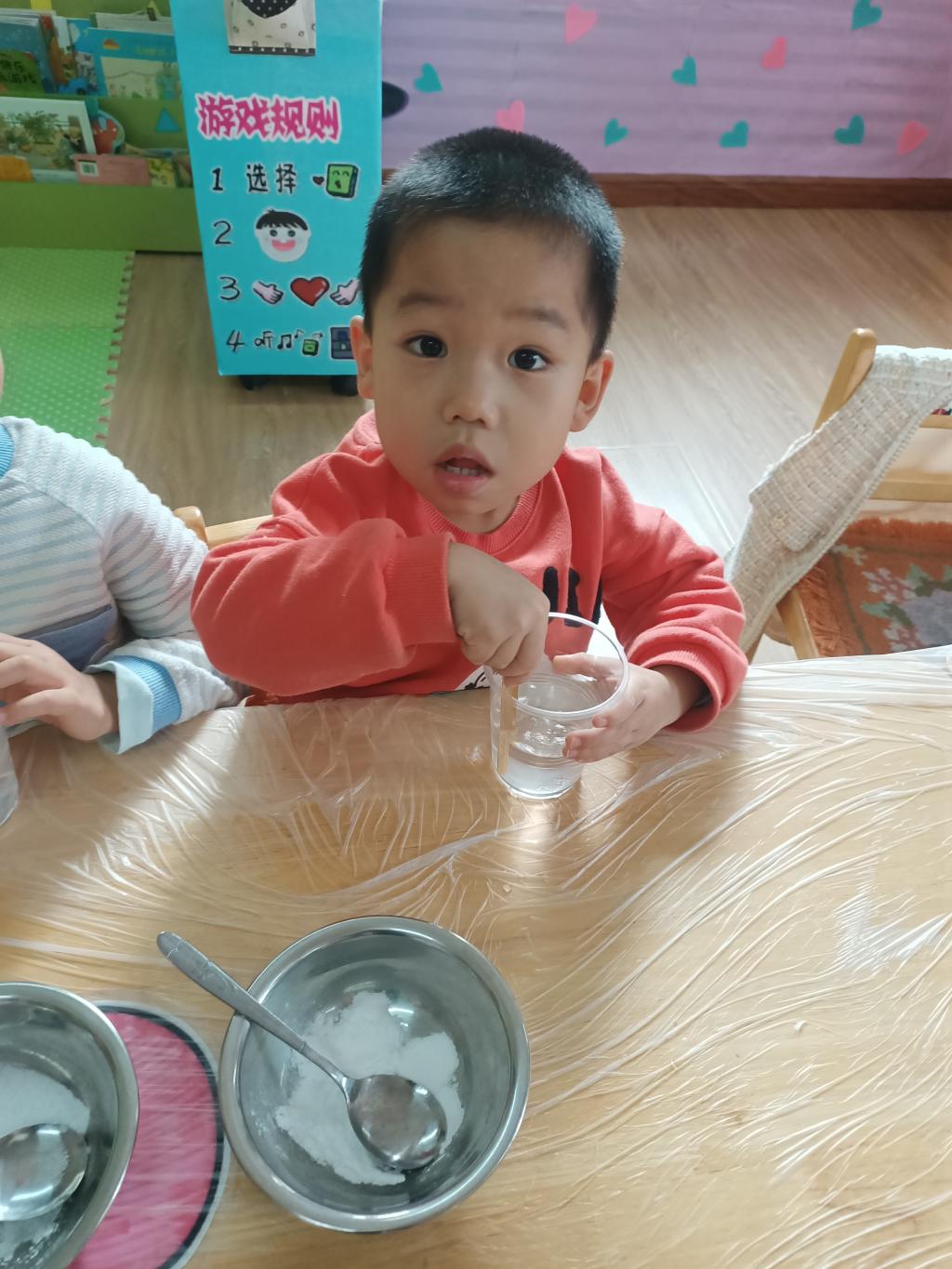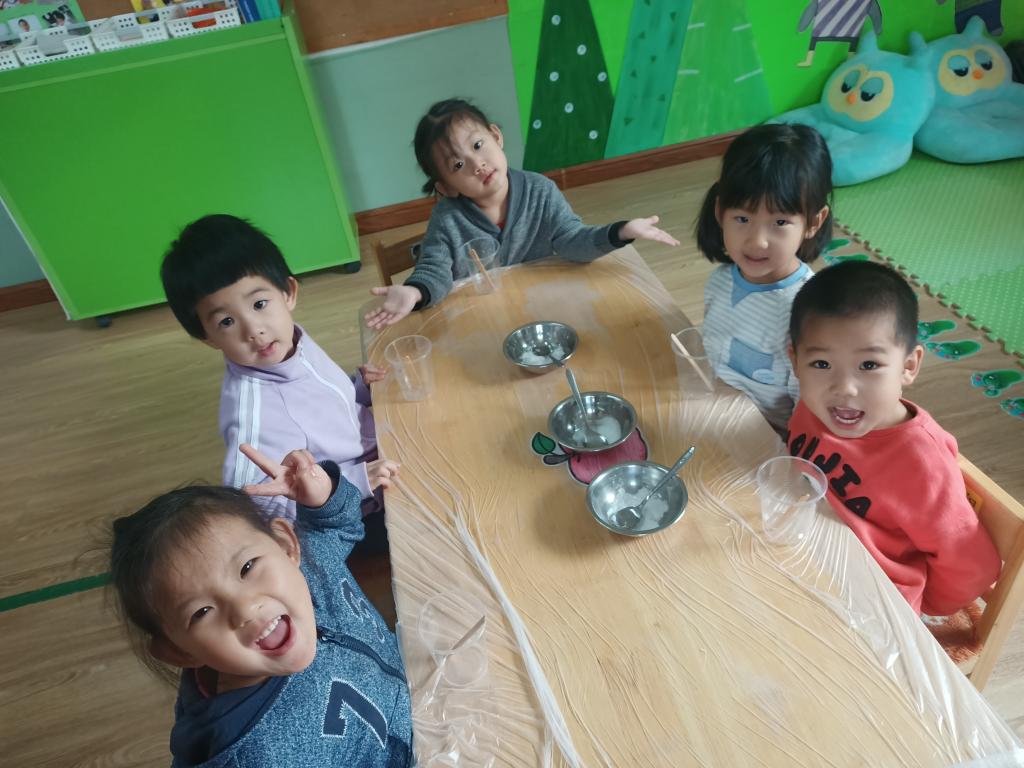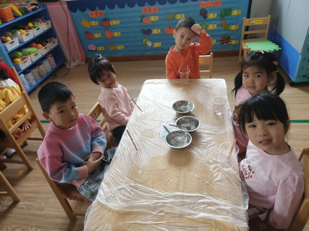小朋友们开始动手操作啦!大家将面前的三种材料一点儿一点儿地加入到杯中,每次加完都会进行搅拌。搅拌之后,观察到水中产生气泡了,就开始品尝。