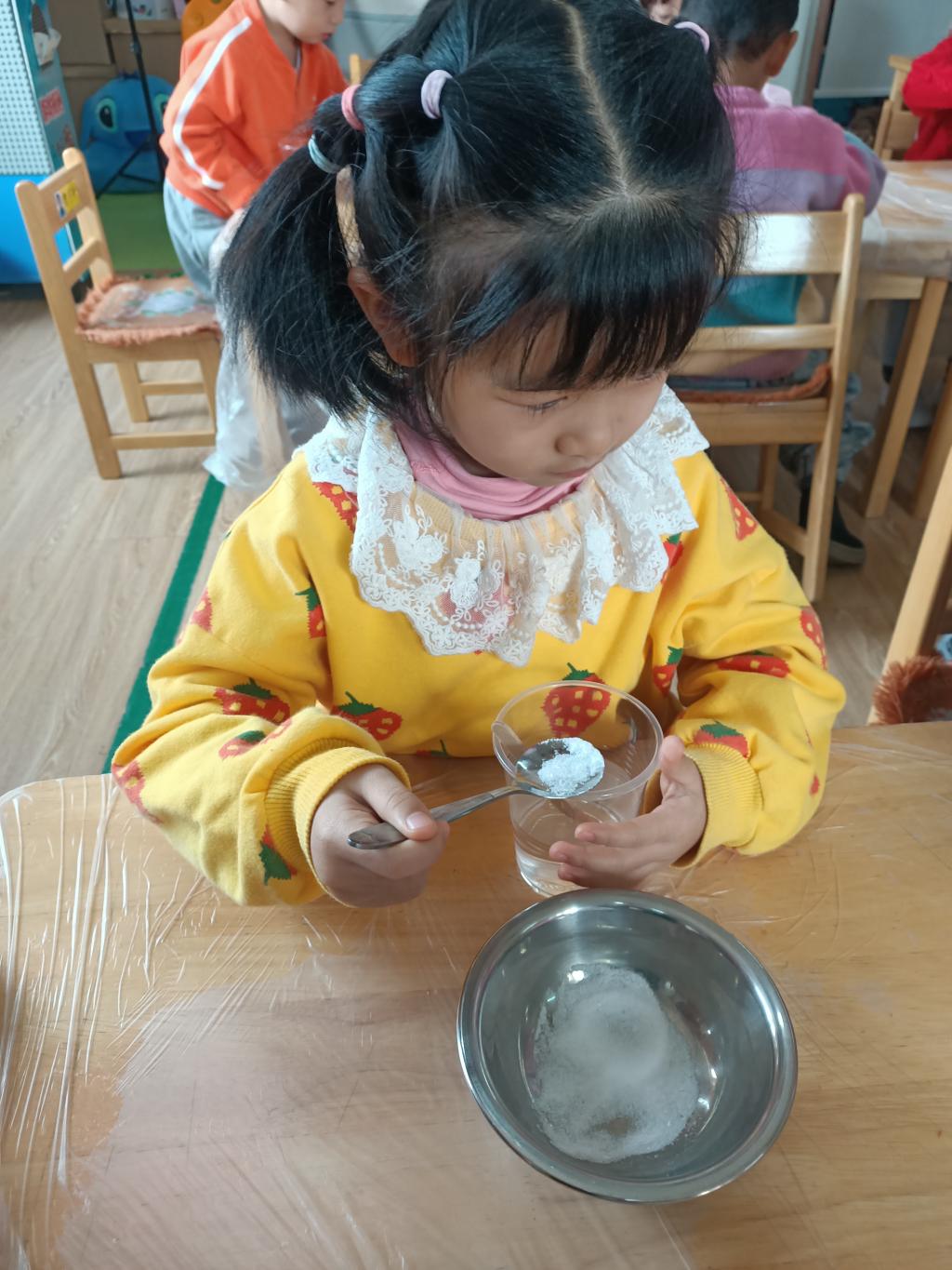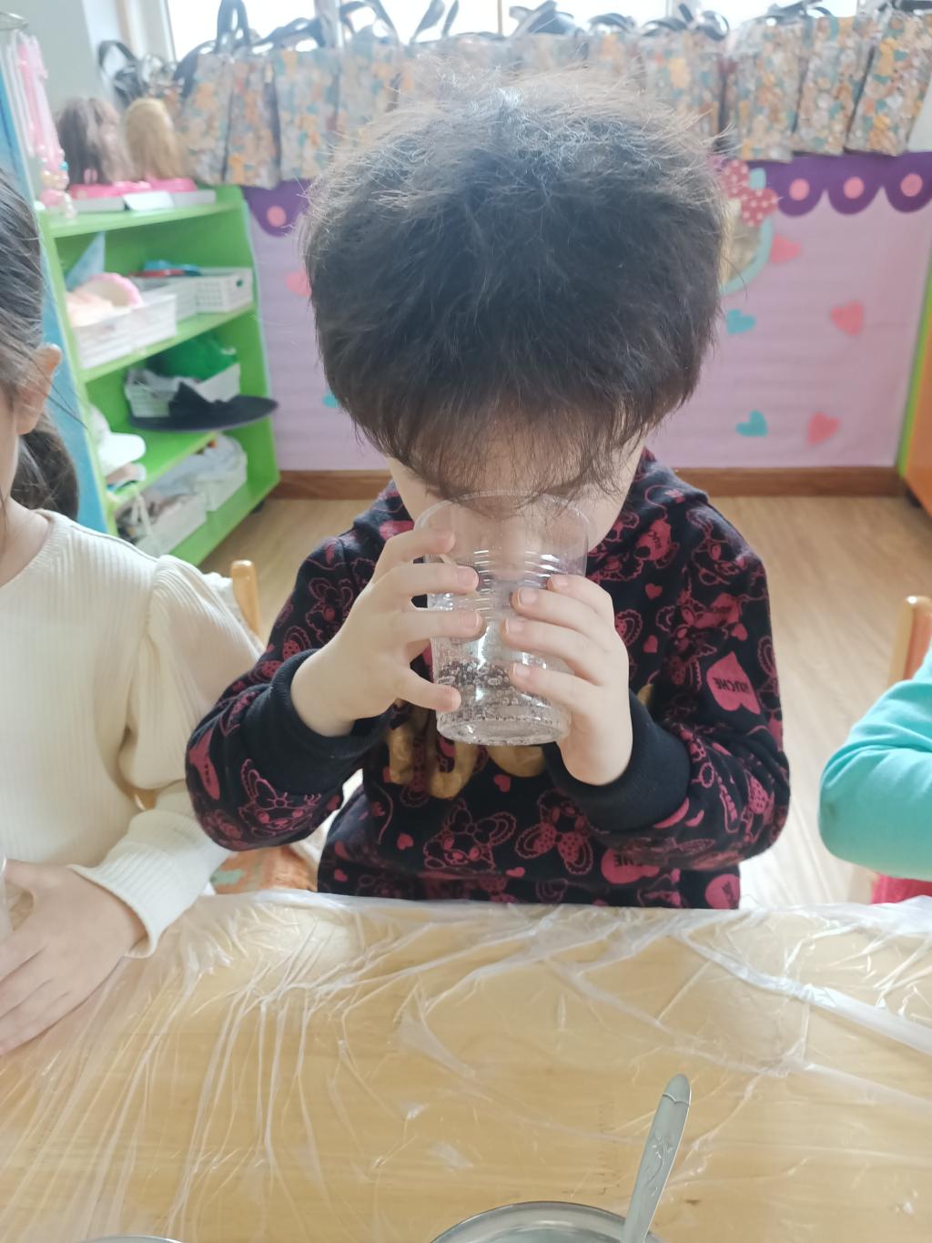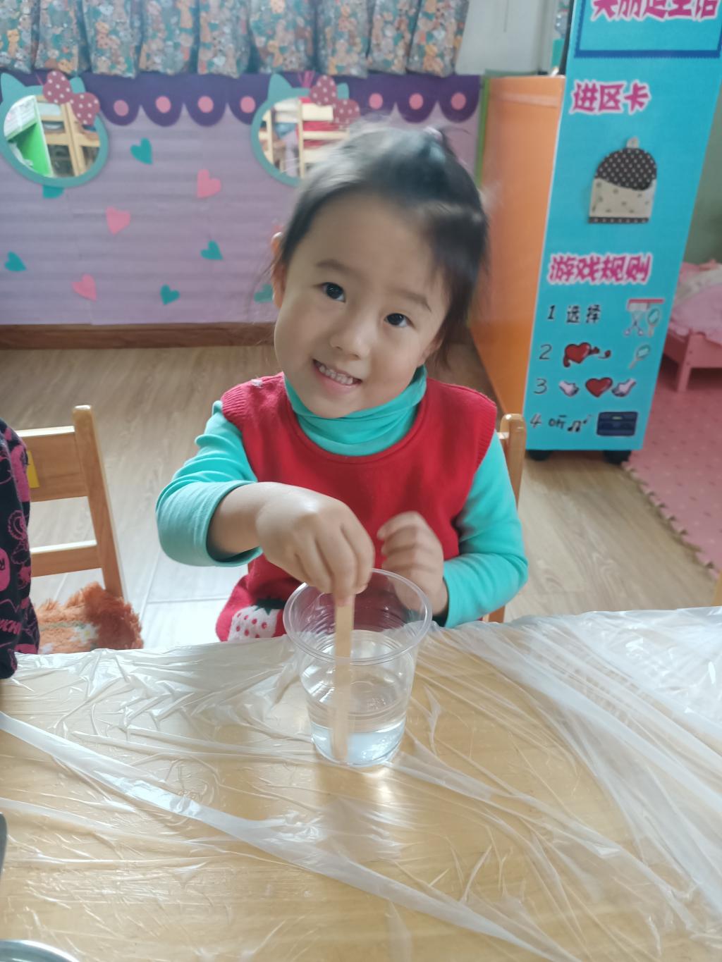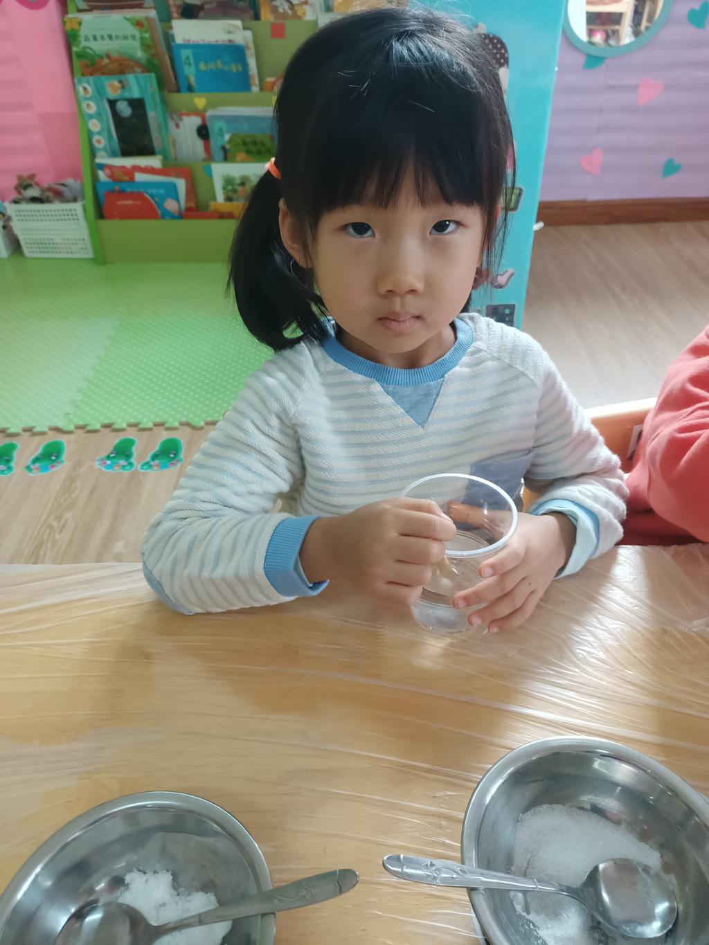 小朋友们开始动手操作啦!大家将面前的三种材料一点儿一点儿地加入到杯中,每次加完都会进行搅拌。搅拌之后,观察到水中产生气泡了,就开始品尝。