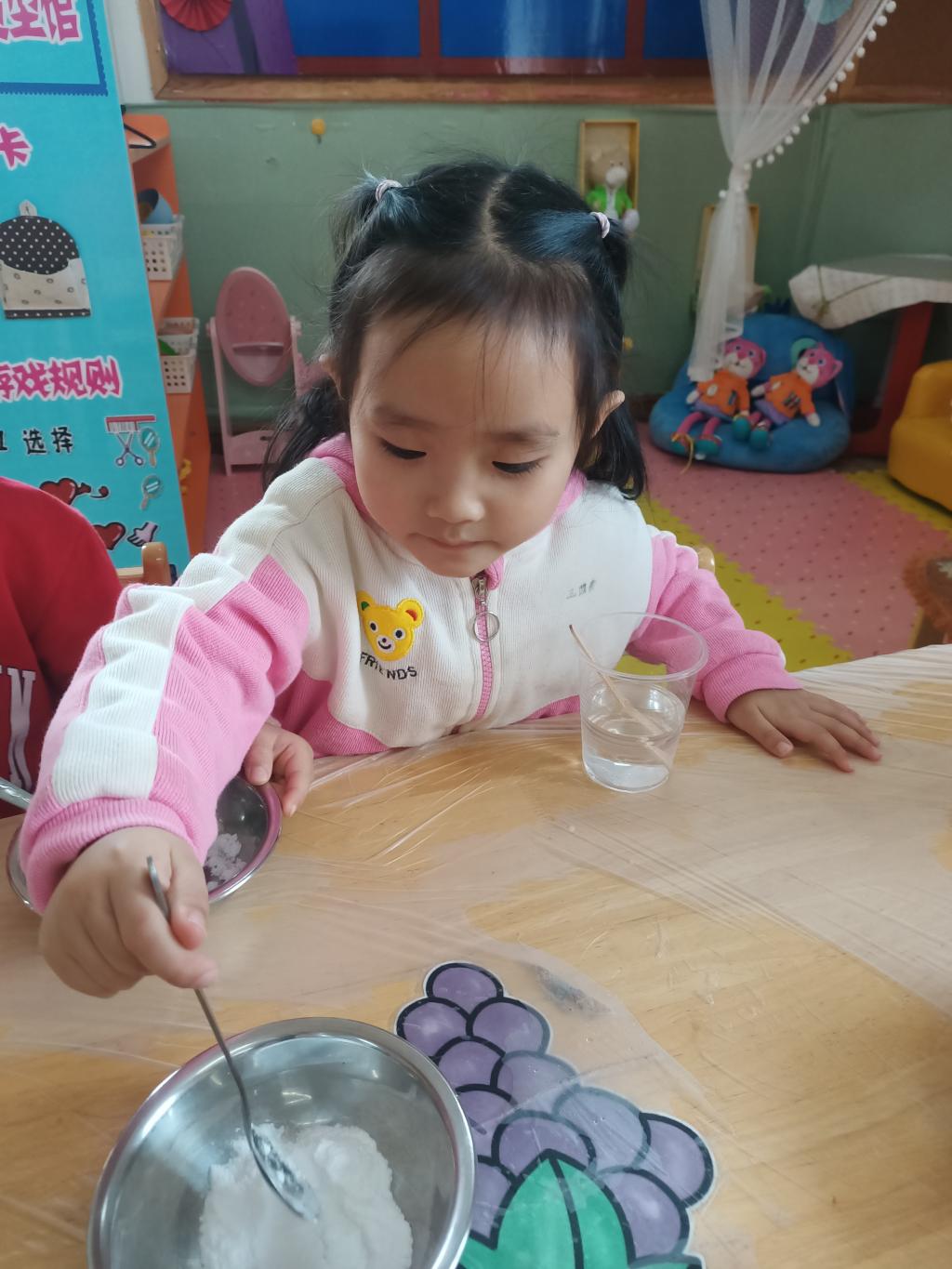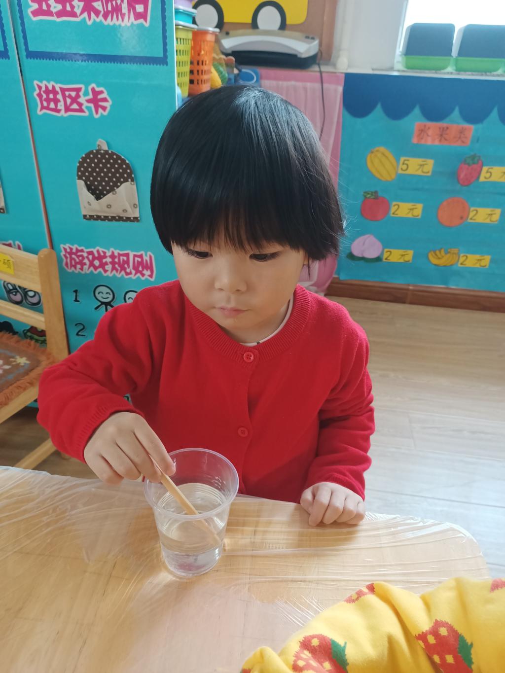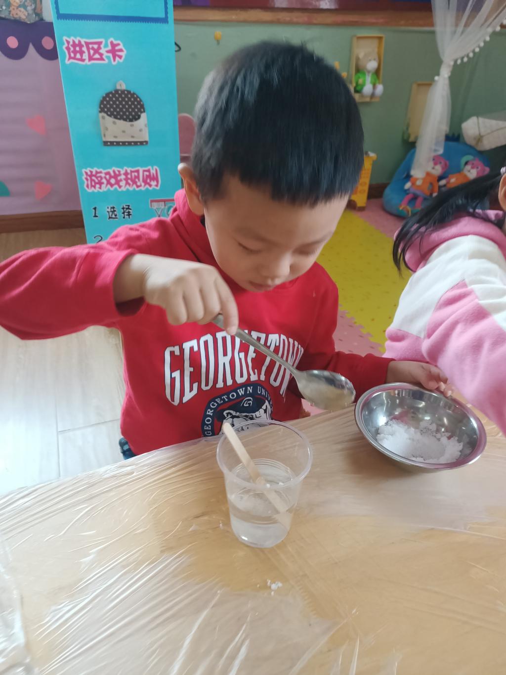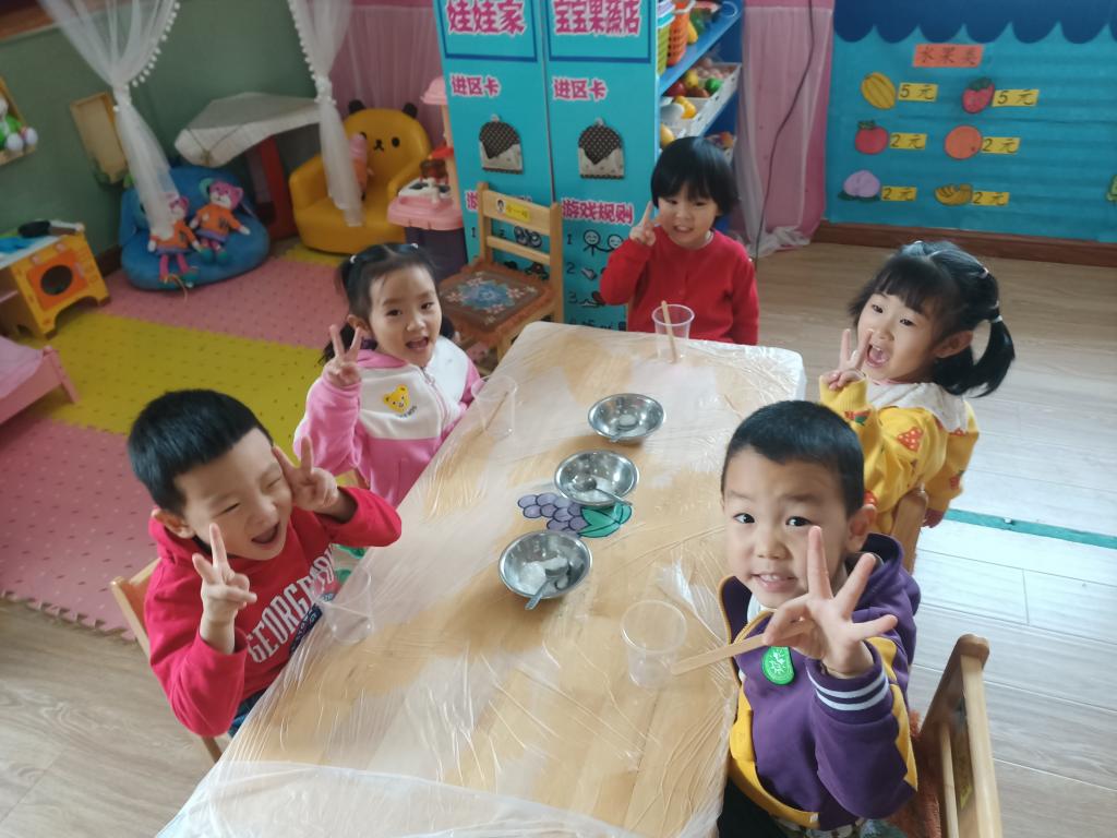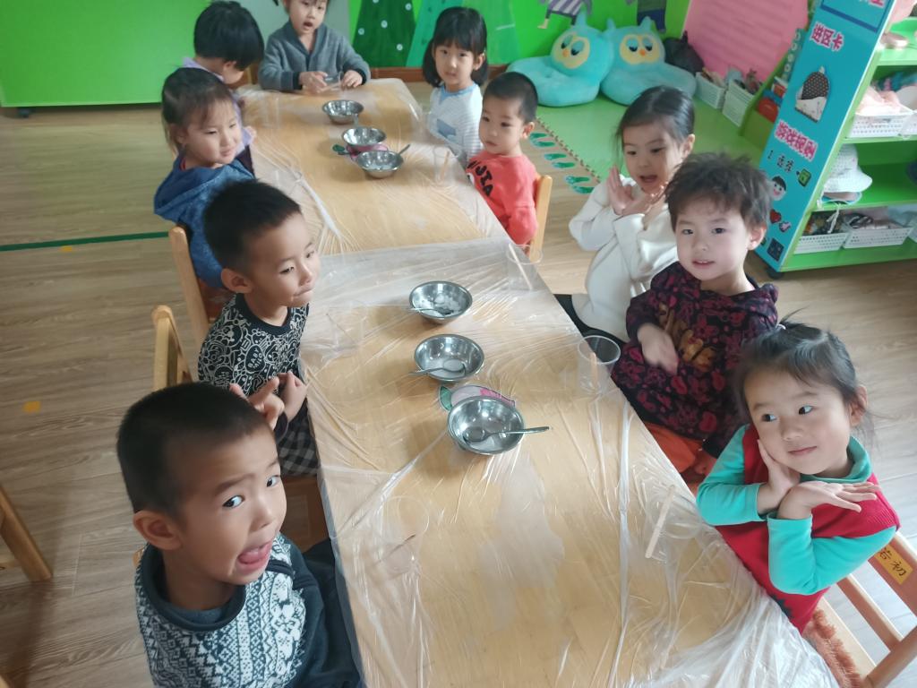 小朋友们开始动手操作啦!大家将面前的三种材料一点儿一点儿地加入到杯中,每次加完都会进行搅拌。搅拌之后,观察到水中产生气泡了,就开始品尝。