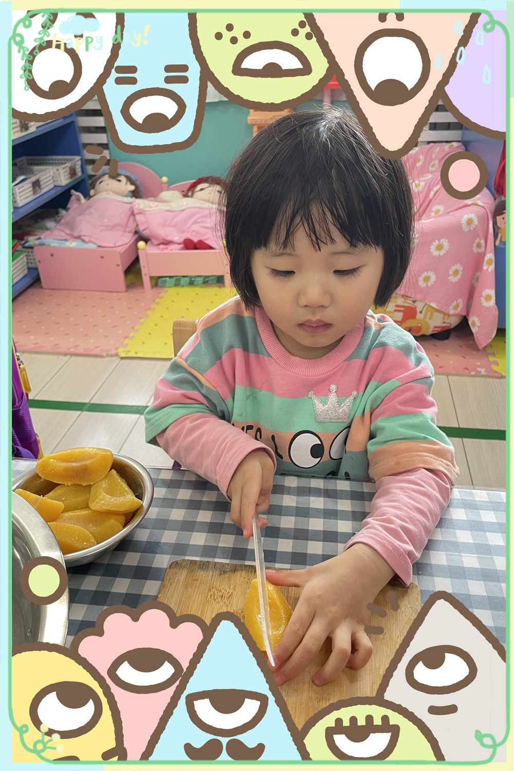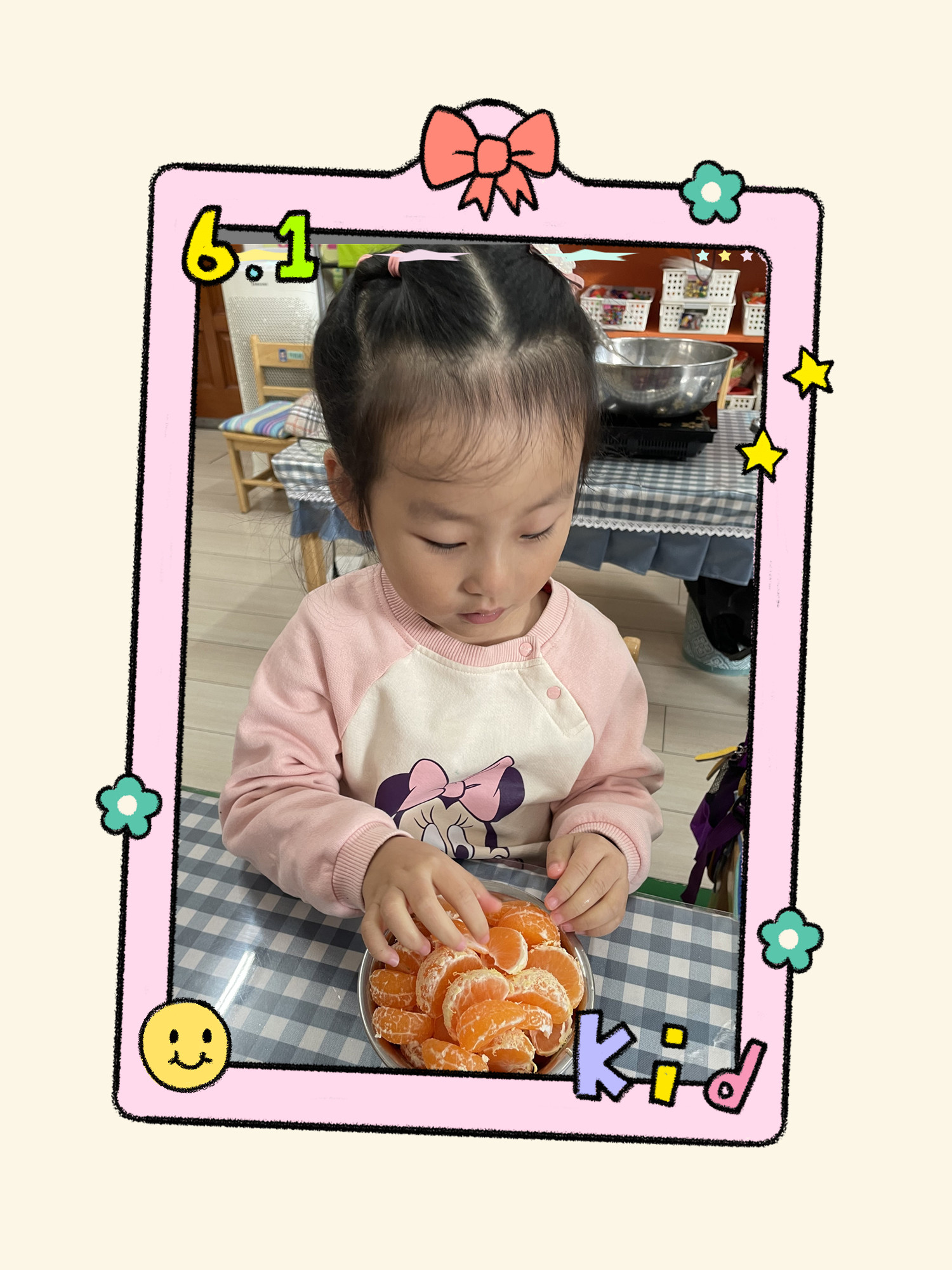 小朋友们真能干,帮橘子脱衣服都不在话下,开始动手切水果吧!