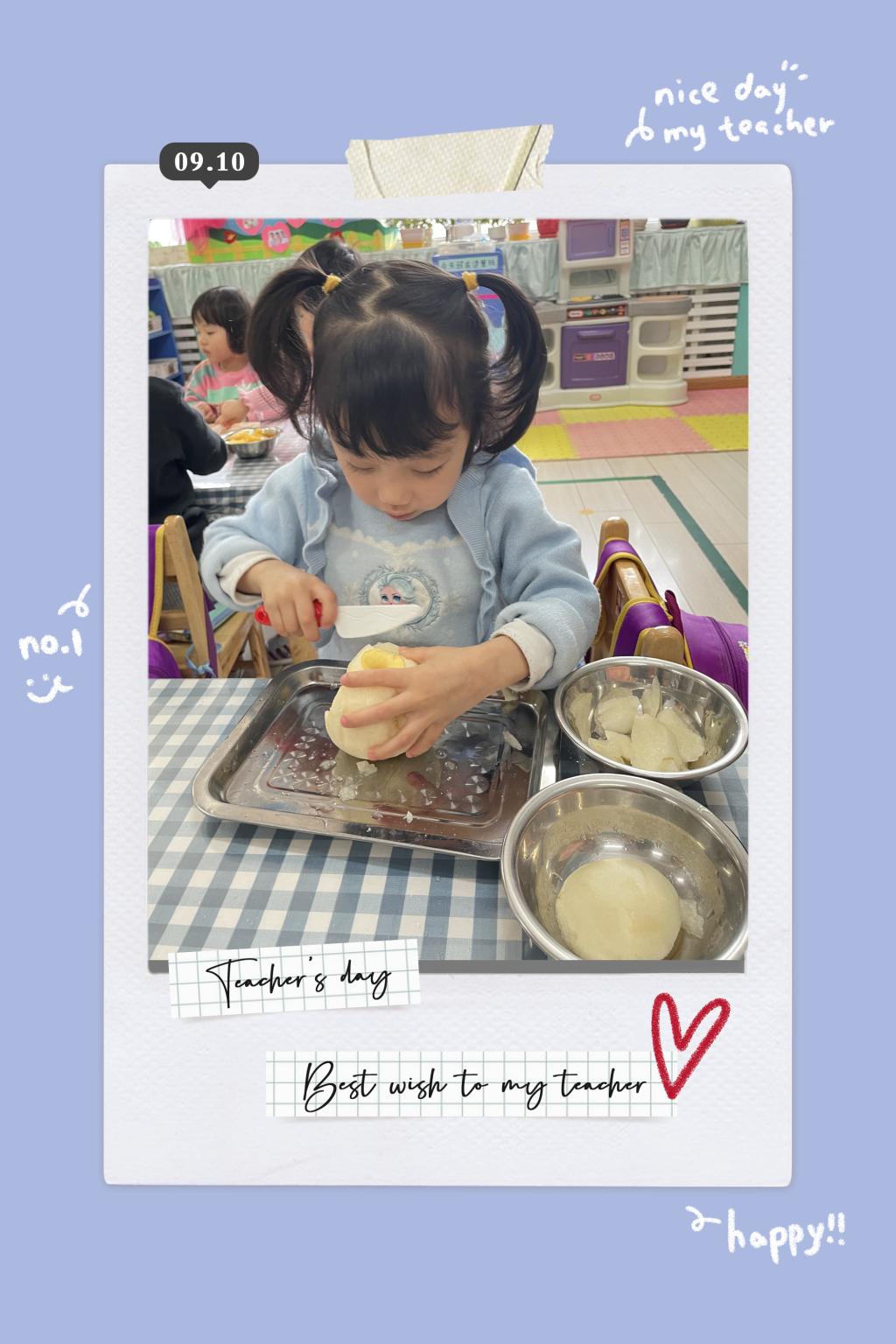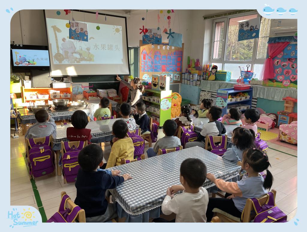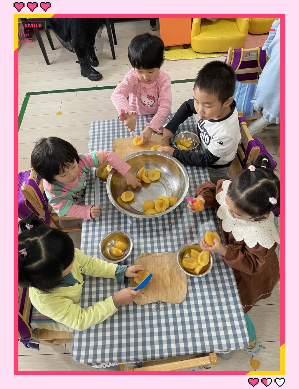 为了让孩子们体验自己动手制作美味的成功和快乐,同时培养小朋友愿意和大家一起分享自己劳动成果的好品质,苗苗五班开展了甜甜的水果罐头活动。